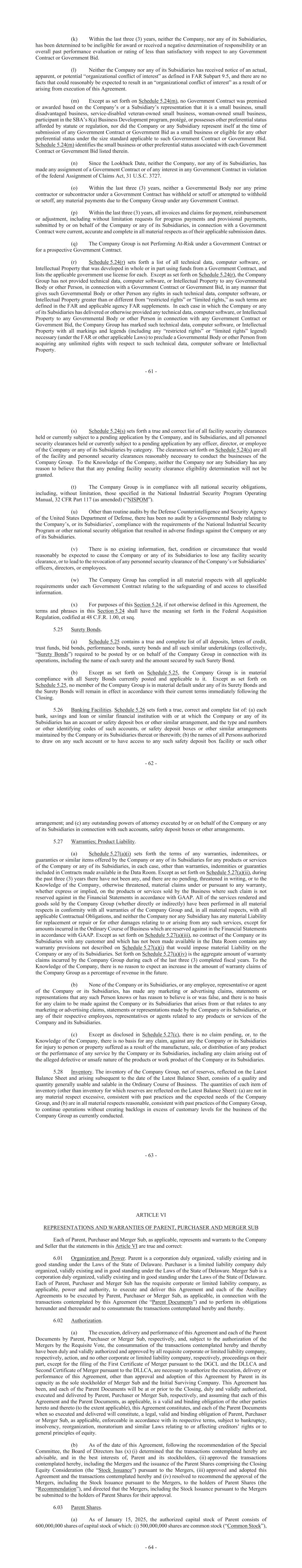 - 61 - (k) Within the last three (3) years, neither the Company, nor any of its Subsidiaries, has been determined to be ineligible for award or received a negative determination of responsibility or an overall past performance evaluation or rating of less than satisfactory with respect to any Government Contract or Government Bid. (l) Neither the Company nor any of its Subsidiaries has received notice of an actual, apparent, or potential “organizational conflict of interest” as defined in FAR Subpart 9.5, and there are no facts that could reasonably be expected to result in an “organizational conflict of interest” as a result of or arising from execution of this Agreement. (m) Except as set forth on Schedule 5.24(m), no Government Contract was premised or awarded based on the Company’s or a Subsidiary’s representation that it is a small business, small disadvantaged business, service-disabled veteran-owned small business, woman-owned small business, participant in the SBA’s 8(a) Business Development program, protégé, or possesses other preferential status afforded by statute or regulation, nor did the Company or any Subsidiary represent itself at the time of submission of any Government Contract or Government Bid as a small business or eligible for any other preferential status under the size standard applicable to such Government Contract or Government Bid. Schedule 5.24(m) identifies the small business or other preferential status associated with each Government Contract or Government Bid listed therein. (n) Since the Lookback Date, neither the Company, nor any of its Subsidiaries, has made any assignment of a Government Contract or of any interest in any Government Contract in violation of the federal Assignment of Claims Act, 31 U.S.C. 3727. (o) Within the last three (3) years, neither a Governmental Body nor any prime contractor or subcontractor under a Government Contract has withheld or setoff or attempted to withhold or setoff, any material payments due to the Company Group under any Government Contract. (p) Within the last three (3) years, all invoices and claims for payment, reimbursement or adjustment, including without limitation requests for progress payments and provisional payments, submitted by or on behalf of the Company or any of its Subsidiaries, in connection with a Government Contract were current, accurate and complete in all material respects as of their applicable submission dates. (q) The Company Group is not Performing At-Risk under a Government Contract or for a prospective Government Contract. (r) Schedule 5.24(r) sets forth a list of all technical data, computer software, or Intellectual Property that was developed in whole or in part using funds from a Government Contract, and lists the applicable government use license for each. Except as set forth on Schedule 5.24(r), the Company Group has not provided technical data, computer software, or Intellectual Property to any Governmental Body or other Person, in connection with a Government Contract or Government Bid, in any manner that gives such Governmental Body or other Person any rights in such technical data, computer software, or Intellectual Property greater than or different from “restricted rights” or “limited rights,” as such terms are defined in the FAR and applicable agency FAR supplements. In each case in which the Company or any of its Subsidiaries has delivered or otherwise provided any technical data, computer software, or Intellectual Property to any Governmental Body or other Person in connection with any Government Contract or Government Bid, the Company Group has marked such technical data, computer software, or Intellectual Property with all markings and legends (including any “restricted rights” or “limited rights” legend) necessary (under the FAR or other applicable Laws) to preclude a Governmental Body or other Person from acquiring any unlimited rights with respect to such technical data, computer software or Intellectual Property. - 62 - (s) Schedule 5.24(s) sets forth a true and correct list of all facility security clearances held or currently subject to a pending application by the Company, and its Subsidiaries, and all personnel security clearances held or currently subject to a pending application by any officer, director, or employee of the Company or any of its Subsidiaries by category. The clearances set forth on Schedule 5.24(s) are all of the facility and personnel security clearances reasonably necessary to conduct the businesses of the Company Group. To the Knowledge of the Company, neither the Company nor any Subsidiary has any reason to believe that that any pending facility security clearance eligibility determination will not be granted. (t) The Company Group is in compliance with all national security obligations, including, without limitation, those specified in the National Industrial Security Program Operating Manual, 32 CFR Part 117 (as amended) (“NISPOM”). (u) Other than routine audits by the Defense Counterintelligence and Security Agency of the United States Department of Defense, there has been no audit by a Governmental Body relating to the Company’s, or its Subsidiaries’, compliance with the requirements of the National Industrial Security Program or other national security obligation that resulted in adverse findings against the Company or any of its Subsidiaries. (v) There is no existing information, fact, condition or circumstance that would reasonably be expected to cause the Company or any of its Subsidiaries to lose any facility security clearance, or to lead to the revocation of any personnel security clearance of the Company’s or Subsidiaries’ officers, directors, or employees. (w) The Company Group has complied in all material respects with all applicable requirements under each Government Contract relating to the safeguarding of and access to classified information. (x) For purposes of this Section 5.24, if