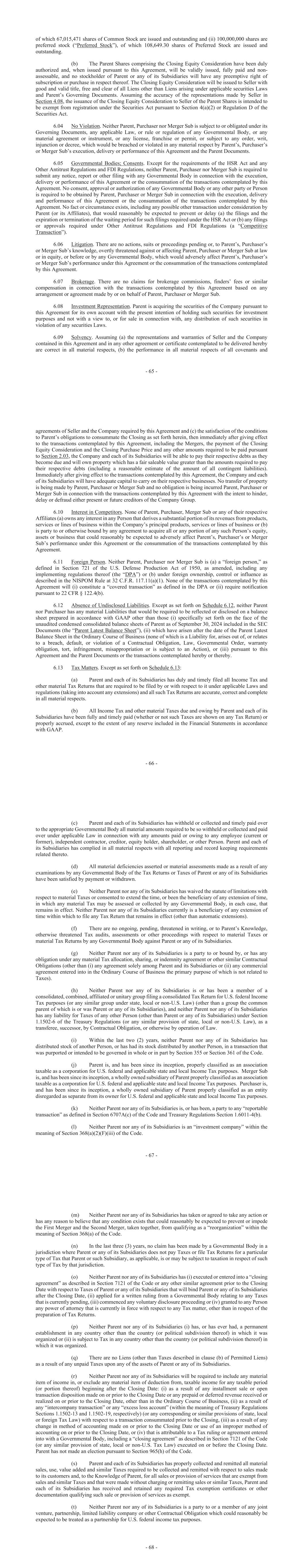 - 65 - of which 67,015,471 shares of Common Stock are issued and outstanding and (ii) 100,000,000 shares are preferred stock (“Preferred Stock”), of which 108,649.30 shares of Preferred Stock are issued and outstanding. (b) The Parent Shares comprising the Closing Equity Consideration have been duly authorized and, when issued pursuant to this Agreement, will be validly issued, fully paid and non- assessable, and no stockholder of Parent or any of its Subsidiaries will have any preemptive right of subscription or purchase in respect thereof. The Closing Equity Consideration will be issued to Seller with good and valid title, free and clear of all Liens other than Liens arising under applicable securities Laws and Parent’s Governing Documents. Assuming the accuracy of the representations made by Seller in Section 4.08, the issuance of the Closing Equity Consideration to Seller of the Parent Shares is intended to be exempt from registration under the Securities Act pursuant to Section 4(a)(2) or Regulation D of the Securities Act. 6.04 No Violation. Neither Parent, Purchaser nor Merger Sub is subject to or obligated under its Governing Documents, any applicable Law, or rule or regulation of any Governmental Body, or any material agreement or instrument, or any license, franchise or permit, or subject to any order, writ, injunction or decree, which would be breached or violated in any material respect by Parent’s, Purchaser’s or Merger Sub’s execution, delivery or performance of this Agreement and the Parent Documents. 6.05 Governmental Bodies; Consents. Except for the requirements of the HSR Act and any Other Antitrust Regulations and FDI Regulations, neither Parent, Purchaser nor Merger Sub is required to submit any notice, report or other filing with any Governmental Body in connection with the execution, delivery or performance of this Agreement or the consummation of the transactions contemplated by this Agreement. No consent, approval or authorization of any Governmental Body or any other party or Person is required to be obtained by Parent, Purchaser or Merger Sub in connection with the execution, delivery and performance of this Agreement or the consummation of the transactions contemplated by this Agreement. No fact or circumstance exists, including any possible other transaction under consideration by Parent (or its Affiliates), that would reasonably be expected to prevent or delay (a) the filings and the expiration or termination of the waiting period for such filings required under the HSR Act or (b) any filings or approvals required under Other Antitrust Regulations and FDI Regulations (a “Competitive Transaction”). 6.06 Litigation. There are no actions, suits or proceedings pending or, to Parent’s, Purchaser’s or Merger Sub’s knowledge, overtly threatened against or affecting Parent, Purchaser or Merger Sub at law or in equity, or before or by any Governmental Body, which would adversely affect Parent’s, Purchaser’s or Merger Sub’s performance under this Agreement or the consummation of the transactions contemplated by this Agreement. 6.07 Brokerage. There are no claims for brokerage commissions, finders’ fees or similar compensation in connection with the transactions contemplated by this Agreement based on any arrangement or agreement made by or on behalf of Parent, Purchaser or Merger Sub. 6.08 Investment Representation. Parent is acquiring the securities of the Company pursuant to this Agreement for its own account with the present intention of holding such securities for investment purposes and not with a view to, or for sale in connection with, any distribution of such securities in violation of any securities Laws. 6.09 Solvency. Assuming (a) the representations and warranties of Seller and the Company contained in this Agreement and in any other agreement or certificate contemplated to be delivered hereby are correct in all material respects, (b) the performance in all material respects of all covenants and - 66 - agreements of Seller and the Company required by this Agreement and (c) the satisfaction of the conditions to Parent’s obligations to consummate the Closing as set forth herein, then immediately after giving effect to the transactions contemplated by this Agreement, including the Mergers, the payment of the Closing Equity Consideration and the Closing Purchase Price and any other amounts required to be paid pursuant to Section 2.03, the Company and each of its Subsidiaries will be able to pay their respective debts as they become due and will own property which has a fair saleable value greater than the amounts required to pay their respective debts (including a reasonable estimate of the amount of all contingent liabilities). Immediately after giving effect to the transactions contemplated by this Agreement, the Company and each of its Subsidiaries will have adequate capital to carry on their respective businesses. No transfer of property is being made by Parent, Purchaser or Merger Sub and no obligation is being incurred Parent, Purchaser or Merger Sub in connection with the transactions contemplated by this Agreement with the intent to hinder, delay or defraud either present or future creditors of the Company Group. 6.10 Interest in Competitors. None of Parent, Purchaser, Merger Sub or any of their respective Affiliates (a) owns any interest in any Person that derives a substantial portion of its revenues from products, services or lines of business within the Company’s principal products, services or lines of business or (b) is party to or otherwise bound by any agreement to acquire all or any portion of any such Person’s equity, assets or business that could reasonably be expected to adversely affect Parent’s, Purchaser’s or Merger Sub’s performance under this Agreement or the consummation of the transactions contemplated by this Agreement. 6.11 Foreign Person. Neither Parent, Purchaser nor Merger Sub is (a) a 