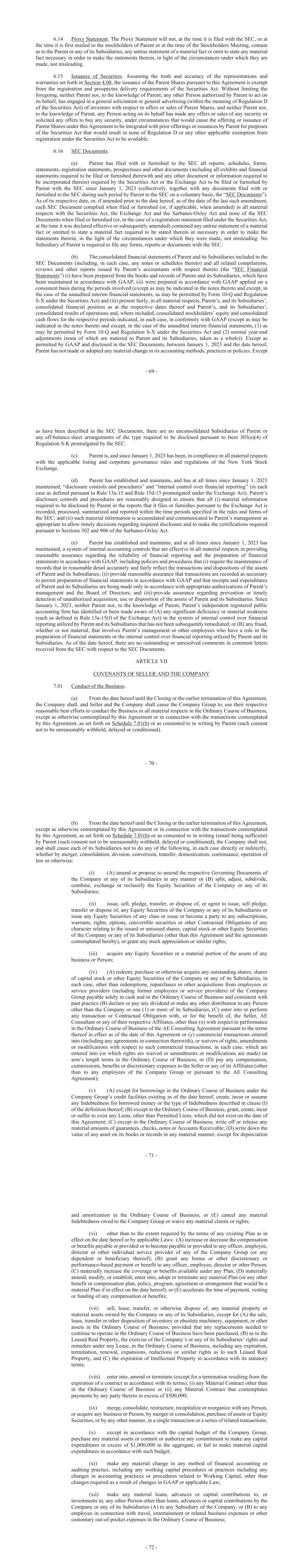 - 69 - 6.14 Proxy Statement. The Proxy Statement will not, at the time it is filed with the SEC, or at the time it is first mailed to the stockholders of Parent or at the time of the Stockholders Meeting, contain as to the Parent or any of its Subsidiaries, any untrue statement of a material fact or omit to state any material fact necessary in order to make the statements therein, in light of the circumstances under which they are made, not misleading. 6.15 Issuance of Securities. Assuming the truth and accuracy of the representations and warranties set forth in Section 4.08, the issuance of the Parent Shares pursuant to this Agreement is exempt from the registration and prospectus delivery requirements of the Securities Act. Without limiting the foregoing, neither Parent nor, to the knowledge of Parent, any other Person authorized by Parent to act on its behalf, has engaged in a general solicitation or general advertising (within the meaning of Regulation D of the Securities Act) of investors with respect to offers or sales of Parent Shares, and neither Parent nor, to the knowledge of Parent, any Person acting on its behalf has made any offers or sales of any security or solicited any offers to buy any security, under circumstances that would cause the offering or issuance of Parent Shares under this Agreement to be integrated with prior offerings or issuances by Parent for purposes of the Securities Act that would result in none of Regulation D or any other applicable exemption from registration under the Securities Act to be available. 6.16 SEC Documents. (a) Parent has filed with or furnished to the SEC all reports, schedules, forms, statements, registration statements, prospectuses and other documents (including all exhibits and financial statements required to be filed or furnished therewith and any other document or information required to be incorporated therein) required by the Securities Act or the Exchange Act to be filed or furnished by Parent with the SEC since January 1, 2023 (collectively, together with any documents filed with or furnished to the SEC during such period by Parent to the SEC on a voluntary basis, the “SEC Documents”). As of its respective date, or, if amended prior to the date hereof, as of the date of the last such amendment, each SEC Document complied when filed or furnished (or, if applicable, when amended) in all material respects with the Securities Act, the Exchange Act and the Sarbanes-Oxley Act and none of the SEC Documents when filed or furnished (or, in the case of a registration statement filed under the Securities Act, at the time it was declared effective or subsequently amended) contained any untrue statement of a material fact or omitted to state a material fact required to be stated therein or necessary in order to make the statements therein, in the light of the circumstances under which they were made, not misleading. No Subsidiary of Parent is required to file any forms, reports or documents with the SEC. (b) The consolidated financial statements of Parent and its Subsidiaries included in the SEC Documents (including, in each case, any notes or schedules thereto) and all related compilations, reviews and other reports issued by Parent’s accountants with respect thereto (the “SEC Financial Statements”) (i) have been prepared from the books and records of Parent and its Subsidiaries, which have been maintained in accordance with GAAP, (ii) were prepared in accordance with GAAP applied on a consistent basis during the periods involved (except as may be indicated in the notes thereto and except, in the case of the unaudited interim financial statements, as may be permitted by Form 10-Q and Regulation S-X under the Securities Act) and (iii) present fairly, in all material respects, Parent’s, and its Subsidiaries’, consolidated financial position as at the respective dates thereof and Parent’s, and its Subsidiaries’, consolidated results of operations and, where included, consolidated stockholders’ equity and consolidated cash flows for the respective periods indicated, in each case, in conformity with GAAP (except as may be indicated in the notes thereto and except, in the case of the unaudited interim financial statements, (1) as may be permitted by Form 10-Q and Regulation S-X under the Securities Act and (2) normal year-end adjustments (none of which are material to Parent and its Subsidiaries, taken as a whole)). Except as permitted by GAAP and disclosed in the SEC Documents, between January 1, 2023 and the date hereof, Parent has not made or adopted any material change in its accounting methods, practices or policies. Except - 70 - as have been described in the SEC Documents, there are no unconsolidated Subsidiaries of Parent or any off-balance sheet arrangements of the type required to be disclosed pursuant to Item 303(a)(4) of Regulation S-K promulgated by the SEC. (c) Parent is, and since January 1, 2023 has been, in compliance in all material respects with the applicable listing and corporate governance rules and regulations of the New York Stock Exchange. (d) Parent has established and maintains, and has at all times since January 1, 2023 maintained, “disclosure controls and procedures” and “internal control over financial reporting” (in each case as defined pursuant to Rule 13a-15 and Rule 15d-15 promulgated under the Exchange Act). Parent’s disclosure controls and procedures are reasonably designed to ensure that all (i) material information required to be disclosed by Parent in the reports that it files or furnishes pursuant to the Exchange Act is recorded, processed, summarized and reported within the time periods specified in the rules and forms of the SEC; and (ii) such material information is accumulated and communicated to Parent’s management as appropriate to allow timely decisions regarding required disclosure and to make the certifications required pursuant to Sections 302 and 906 of the Sar