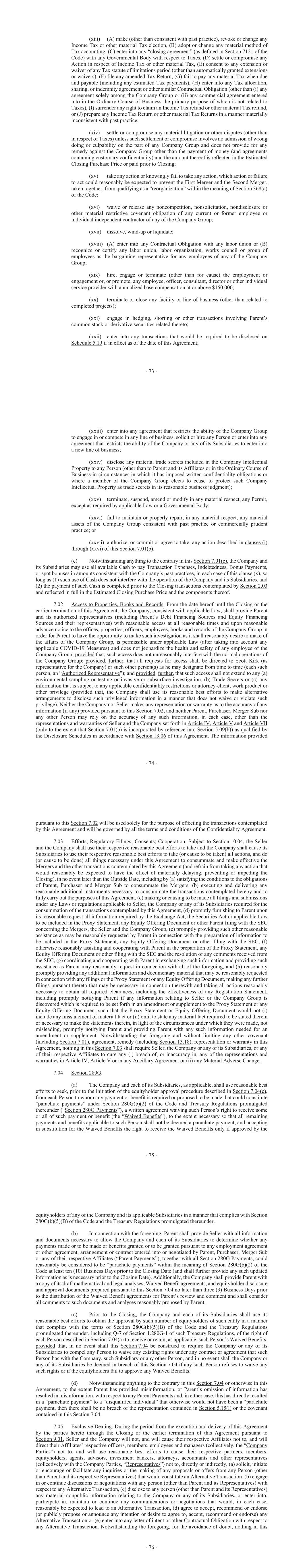 - 73 - (xiii) (A) make (other than consistent with past practice), revoke or change any Income Tax or other material Tax election, (B) adopt or change any material method of Tax accounting, (C) enter into any “closing agreement” (as defined in Section 7121 of the Code) with any Governmental Body with respect to Taxes, (D) settle or compromise any Action in respect of Income Tax or other material Tax, (E) consent to any extension or waiver of any Tax statute of limitations period (other than automatically granted extensions or waivers), (F) file any amended Tax Return, (G) fail to pay any material Tax when due and payable (including any estimated Tax payments), (H) enter into any Tax allocation, sharing, or indemnity agreement or other similar Contractual Obligation (other than (i) any agreement solely among the Company Group or (ii) any commercial agreement entered into in the Ordinary Course of Business the primary purpose of which is not related to Taxes), (I) surrender any right to claim an Income Tax refund or other material Tax refund, or (J) prepare any Income Tax Return or other material Tax Returns in a manner materially inconsistent with past practice; (xiv) settle or compromise any material litigation or other disputes (other than in respect of Taxes) unless such settlement or compromise involves no admission of wrong doing or culpability on the part of any Company Group and does not provide for any remedy against the Company Group other than the payment of money (and agreements containing customary confidentiality) and the amount thereof is reflected in the Estimated Closing Purchase Price or paid prior to Closing; (xv) take any action or knowingly fail to take any action, which action or failure to act could reasonably be expected to prevent the First Merger and the Second Merger, taken together, from qualifying as a “reorganization” within the meaning of Section 368(a) of the Code; (xvi) waive or release any noncompetition, nonsolicitation, nondisclosure or other material restrictive covenant obligation of any current or former employee or individual independent contractor of any of the Company Group; (xvii) dissolve, wind-up or liquidate; (xviii) (A) enter into any Contractual Obligation with any labor union or (B) recognize or certify any labor union, labor organization, works council or group of employees as the bargaining representative for any employees of any of the Company Group; (xix) hire, engage or terminate (other than for cause) the employment or engagement or, or promote, any employee, officer, consultant, director or other individual service provider with annualized base compensation at or above $150,000; (xx) terminate or close any facility or line of business (other than related to completed projects); (xxi) engage in hedging, shorting or other transactions involving Parent’s common stock or derivative securities related thereto; (xxii) enter into any transactions that would be required to be disclosed on Schedule 5.19 if in effect as of the date of this Agreement; - 74 - (xxiii) enter into any agreement that restricts the ability of the Company Group to engage in or compete in any line of business, solicit or hire any Person or enter into any agreement that restricts the ability of the Company or any of its Subsidiaries to enter into a new line of business; (xxiv) disclose any material trade secrets included in the Company Intellectual Property to any Person (other than to Parent and its Affiliates or in the Ordinary Course of Business in circumstances in which it has imposed written confidentiality obligations or where a member of the Company Group elects to cease to protect such Company Intellectual Property as trade secrets in its reasonable business judgment); (xxv) terminate, suspend, amend or modify in any material respect, any Permit, except as required by applicable Law or a Governmental Body; (xxvi) fail to maintain or properly repair, in any material respect, any material assets of the Company Group consistent with past practice or commercially prudent practice; or (xxvii) authorize, or commit or agree to take, any action described in clauses (i) through (xxvi) of this Section 7.01(b). (c) Notwithstanding anything to the contrary in this Section 7.01(c), the Company and its Subsidiaries may use all available Cash to pay Transaction Expenses, Indebtedness, Bonus Payments, or spot bonuses in amounts consistent with the Company’s past practices, in each case of this clause (x), so long as (1) such use of Cash does not interfere with the operation of the Company and its Subsidiaries, and (2) the payment of such Cash is completed prior to the Closing transactions contemplated by Section 2.03 and reflected in full in the Estimated Closing Purchase Price and the components thereof. 7.02 Access to Properties, Books and Records. From the date hereof until the Closing or the earlier termination of this Agreement, the Company, consistent with applicable Law, shall provide Parent and its authorized representatives (including Parent’s Debt Financing Sources and Equity Financing Sources and their representatives) with reasonable access at all reasonable times and upon reasonable advance notice to the offices, properties, officers, employees, books and records of the Company Group in order for Parent to have the opportunity to make such investigation as it shall reasonably desire to make of the affairs of the Company Group, is permissible under applicable Law (after taking into account any applicable COVID-19 Measures) and does not jeopardize the health and safety of any employee of the Company Group; provided that, such access does not unreasonably interfere with the normal operations of the Company Group; provided, further, that all requests for access shall be directed to Scott Kirk (as representative for the Company) or such other person(s) as he may designate from time to time (each such person, an “Authorized Representative”); and provided