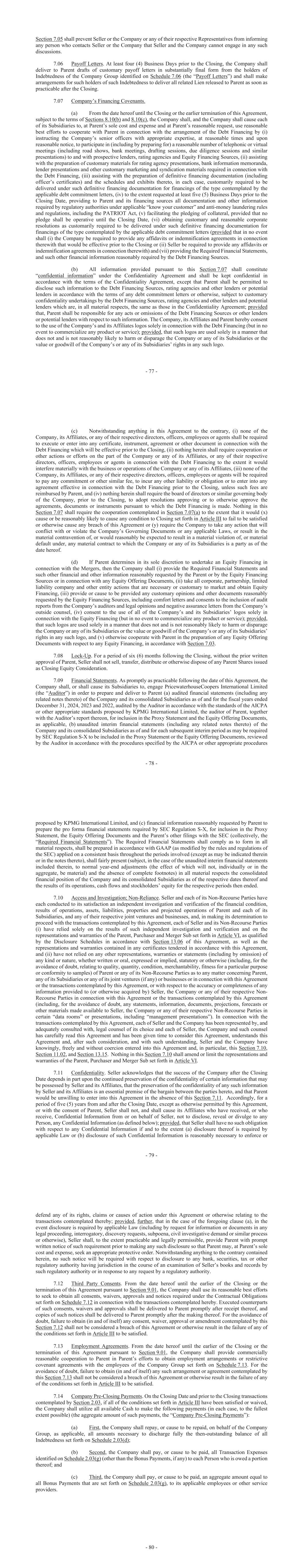 - 77 - Section 7.05 shall prevent Seller or the Company or any of their respective Representatives from informing any person who contacts Seller or the Company that Seller and the Company cannot engage in any such discussions. 7.06 Payoff Letters. At least four (4) Business Days prior to the Closing, the Company shall deliver to Parent drafts of customary payoff letters in substantially final form from the holders of Indebtedness of the Company Group identified on Schedule 7.06 (the “Payoff Letters”) and shall make arrangements for such holders of such Indebtedness to deliver all related Lien released to Parent as soon as practicable after the Closing. 7.07 Company’s Financing Covenants. (a) From the date hereof until the Closing or the earlier termination of this Agreement, subject to the terms of Sections 8.10(b) and 8.10(c), the Company shall, and the Company shall cause each of its Subsidiaries to, at Parent’s sole cost and expense and at Parent’s reasonable request, use reasonable best efforts to cooperate with Parent in connection with the arrangement of the Debt Financing by (i) instructing the Company’s senior officers with appropriate expertise, at reasonable times and upon reasonable notice, to participate in (including by preparing for) a reasonable number of telephonic or virtual meetings (including road shows, bank meetings, drafting sessions, due diligence sessions and similar presentations) to and with prospective lenders, rating agencies and Equity Financing Sources, (ii) assisting with the preparation of customary materials for rating agency presentations, bank information memoranda, lender presentations and other customary marketing and syndication materials required in connection with the Debt Financing, (iii) assisting with the preparation of definitive financing documentation (including officer’s certificates) and the schedules and exhibits thereto, in each case, customarily required to be delivered under such definitive financing documentation for financings of the type contemplated by the applicable debt commitment letters, (iv) to the extent requested at least five (5) Business Days prior to the Closing Date, providing to Parent and its financing sources all documentation and other information required by regulatory authorities under applicable “know your customer” and anti-money laundering rules and regulations, including the PATRIOT Act, (v) facilitating the pledging of collateral, provided that no pledge shall be operative until the Closing Date, (vi) obtaining customary and reasonable corporate resolutions as customarily required to be delivered under such definitive financing documentation for financings of the type contemplated by the applicable debt commitment letters (provided that in no event shall (i) the Company be required to provide any affidavits or indemnification agreements in connection therewith that would be effective prior to the Closing or (ii) Seller be required to provide any affidavits or indemnification agreements in connection therewith) and (vii) providing the Required Financial Statements, and such other financial information reasonably required by the Debt Financing Sources. (b) All information provided pursuant to this Section 7.07 shall constitute “confidential information” under the Confidentiality Agreement and shall be kept confidential in accordance with the terms of the Confidentiality Agreement, except that Parent shall be permitted to disclose such information to the Debt Financing Sources, rating agencies and other lenders or potential lenders in accordance with the terms of any debt commitment letters or otherwise, subject to customary confidentiality undertakings by the Debt Financing Sources, rating agencies and other lenders and potential lenders which are, in all material respects, the same as those in the Confidentiality Agreement; provided that, Parent shall be responsible for any acts or omissions of the Debt Financing Sources or other lenders or potential lenders with respect to such information. The Company, its Affiliates and Parent hereby consent to the use of the Company’s and its Affiliates logos solely in connection with the Debt Financing (but in no event to commercialize any product or service); provided, that such logos are used solely in a manner that does not and is not reasonably likely to harm or disparage the Company or any of its Subsidiaries or the value or goodwill of the Company’s or any of its Subsidiaries’ rights in any such logo. - 78 - (c) Notwithstanding anything in this Agreement to the contrary, (i) none of the Company, its Affiliates, or any of their respective directors, officers, employees or agents shall be required to execute or enter into any certificate, instrument, agreement or other document in connection with the Debt Financing which will be effective prior to the Closing, (ii) nothing herein shall require cooperation or other actions or efforts on the part of the Company or any of its Affiliates, or any of their respective directors, officers, employees or agents in connection with the Debt Financing to the extent it would interfere materially with the business or operations of the Company or any of its Affiliates, (iii) none of the Company, its Affiliates, or any of their respective directors, officers, employees or agents will be required to pay any commitment or other similar fee, to incur any other liability or obligation or to enter into any agreement effective in connection with the Debt Financing prior to the Closing, unless such fees are reimbursed by Parent, and (iv) nothing herein shall require the board of directors or similar governing body of the Company, prior to the Closing, to adopt resolutions approving or to otherwise approve the agreements, documents or instruments pursuant to which the Debt Financing is made. Nothing in this Section 7.07 shall require the cooperation contemplated in Section 7.07(a) to the extent that it would (x) caus