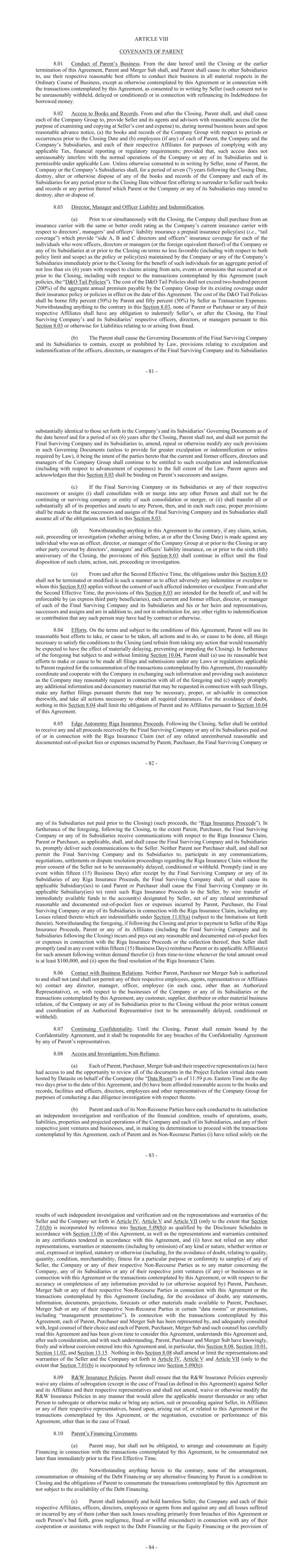 - 81 - ARTICLE VIII COVENANTS OF PARENT 8.01 Conduct of Parent’s Business. From the date hereof until the Closing or the earlier termination of this Agreement, Parent and Merger Sub shall, and Parent shall cause its other Subsidiaries to, use their respective reasonable best efforts to conduct their business in all material respects in the Ordinary Course of Business, except as otherwise contemplated by this Agreement or in connection with the transactions contemplated by this Agreement, as consented to in writing by Seller (such consent not to be unreasonably withheld, delayed or conditioned) or in connection with refinancing its Indebtedness for borrowed money. 8.02 Access to Books and Records. From and after the Closing, Parent shall, and shall cause each of the Company Group to, provide Seller and its agents and advisors with reasonable access (for the purpose of examining and copying at Seller’s cost and expense) to, during normal business hours and upon reasonable advance notice, (a) the books and records of the Company Group with respect to periods or occurrences prior to the Closing Date and (b) employees (if any) of each of Parent, the Company and the Company’s Subsidiaries, and each of their respective Affiliates for purposes of complying with any applicable Tax, financial reporting or regulatory requirements; provided that, such access does not unreasonably interfere with the normal operations of the Company or any of its Subsidiaries and is permissible under applicable Law. Unless otherwise consented to in writing by Seller, none of Parent, the Company or the Company’s Subsidiaries shall, for a period of seven (7) years following the Closing Date, destroy, alter or otherwise dispose of any of the books and records of the Company and each of its Subsidiaries for any period prior to the Closing Date without first offering to surrender to Seller such books and records or any portion thereof which Parent or the Company or any of its Subsidiaries may intend to destroy, alter or dispose of. 8.03 Director, Manager and Officer Liability and Indemnification. (a) Prior to or simultaneously with the Closing, the Company shall purchase from an insurance carrier with the same or better credit rating as the Company’s current insurance carrier with respect to directors’, managers’ and officers’ liability insurance a prepaid insurance policy(ies) (i.e., “tail coverage”) which provide “side A, B and C directors and officers” insurance coverage for each of the individuals who were officers, directors or managers (or the foreign equivalent thereof) of the Company or any of its Subsidiaries at or prior to the Closing on terms no less favorable (including with respect to both policy limit and scope) as the policy or policy(ies) maintained by the Company or any of the Company’s Subsidiaries immediately prior to the Closing for the benefit of such individuals for an aggregate period of not less than six (6) years with respect to claims arising from acts, events or omissions that occurred at or prior to the Closing, including with respect to the transactions contemplated by this Agreement (such policies, the “D&O Tail Policies”). The cost of the D&O Tail Policies shall not exceed two-hundred percent (200%) of the aggregate annual premium payable by the Company Group for its existing coverage under their insurance policy or policies in effect on the date of this Agreement. The cost of the D&O Tail Policies shall be borne fifty percent (50%) by Parent and fifty percent (50%) by Seller as Transaction Expenses. Notwithstanding anything to the contrary in this Section 8.03, none of Parent or Purchaser or any of their respective Affiliates shall have any obligation to indemnify Seller’s, or after the Closing, the Final Surviving Company’s and its Subsidiaries’ respective officers, directors, or managers pursuant to this Section 8.03 or otherwise for Liabilities relating to or arising from fraud. (b) The Parent shall cause the Governing Documents of the Final Surviving Company and its Subsidiaries to contain, except as prohibited by Law, provisions relating to exculpation and indemnification of the officers, directors, or managers of the Final Surviving Company and its Subsidiaries - 82 - substantially identical to those set forth in the Company’s and its Subsidiaries’ Governing Documents as of the date hereof and for a period of six (6) years after the Closing, Parent shall not, and shall not permit the Final Surviving Company and its Subsidiaries to, amend, repeal or otherwise modify any such provisions in such Governing Documents (unless to provide for greater exculpation or indemnification or unless required by Law), it being the intent of the parties hereto that the current and former officers, directors and managers of the Company Group shall continue to be entitled to such exculpation and indemnification (including with respect to advancement of expenses) to the full extent of the Law. Parent agrees and acknowledges that this Section 8.03 shall be binding on Parent’s successors and assigns. (c) If the Final Surviving Company or its Subsidiaries or any of their respective successors or assigns (i) shall consolidate with or merge into any other Person and shall not be the continuing or surviving company or entity of such consolidation or merger, or (ii) shall transfer all or substantially all of its properties and assets to any Person, then, and in each such case, proper provisions shall be made so that the successors and assigns of the Final Surviving Company and its Subsidiaries shall assume all of the obligations set forth in this Section 8.03. (d) Notwithstanding anything in this Agreement to the contrary, if any claim, action, suit, proceeding or investigation (whether arising before, at or after the Closing Date) is made against any individual who was an officer, director, or manager of the Company Group at or prior to the Closing or any other party cove