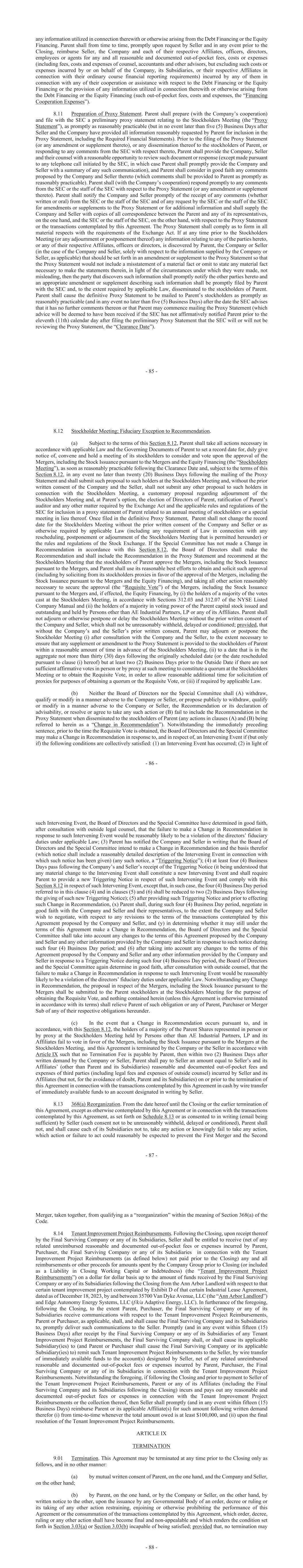 - 85 - any information utilized in connection therewith or otherwise arising from the Debt Financing or the Equity Financing. Parent shall from time to time, promptly upon request by Seller and in any event prior to the Closing, reimburse Seller, the Company and each of their respective Affiliates, officers, directors, employees or agents for any and all reasonable and documented out-of-pocket fees, costs or expenses (including fees, costs and expenses of counsel, accountants and other advisors, but excluding such costs or expenses incurred by or on behalf of the Company, its Subsidiaries, or their respective Affiliates in connection with their ordinary course financial reporting requirements) incurred by any of them in connection with any of their cooperation or assistance with respect to the Debt Financing or the Equity Financing or the provision of any information utilized in connection therewith or otherwise arising from the Debt Financing or the Equity Financing (such out-of-pocket fees, costs and expenses, the “Financing Cooperation Expenses”). 8.11 Preparation of Proxy Statement. Parent shall prepare (with the Company’s cooperation) and file with the SEC a preliminary proxy statement relating to the Stockholders Meeting (the “Proxy Statement”), as promptly as reasonably practicable (but in no event later than five (5) Business Days after Seller and the Company have provided all information reasonably requested by Parent for inclusion in the Proxy Statement, including the Required Financial Statements). Prior to the filing of the Proxy Statement (or any amendment or supplement thereto), or any dissemination thereof to the stockholders of Parent, or responding to any comments from the SEC with respect thereto, Parent shall provide the Company, Seller and their counsel with a reasonable opportunity to review such document or response (except made pursuant to any telephone call initiated by the SEC, in which case Parent shall promptly provide the Company and Seller with a summary of any such communication), and Parent shall consider in good faith any comments proposed by the Company and Seller thereto (which comments shall be provided to Parent as promptly as reasonably practicable). Parent shall (with the Company’s cooperation) respond promptly to any comments from the SEC or the staff of the SEC with respect to the Proxy Statement (or any amendment or supplement thereto). Parent shall notify the Company and Seller promptly of the receipt of any comments (whether written or oral) from the SEC or the staff of the SEC and of any request by the SEC or the staff of the SEC for amendments or supplements to the Proxy Statement or for additional information and shall supply the Company and Seller with copies of all correspondence between the Parent and any of its representatives, on the one hand, and the SEC or the staff of the SEC, on the other hand, with respect to the Proxy Statement or the transactions contemplated by this Agreement. The Proxy Statement shall comply as to form in all material respects with the requirements of the Exchange Act. If at any time prior to the Stockholders Meeting (or any adjournment or postponement thereof) any information relating to any of the parties hereto, or any of their respective Affiliates, officers or directors, is discovered by Parent, the Company or Seller (in the case of the Company and Seller, solely with respect to the information supplied by the Company or Seller, as applicable) that should be set forth in an amendment or supplement to the Proxy Statement so that the Proxy Statement would not include a misstatement of a material fact or omit to state any material fact necessary to make the statements therein, in light of the circumstances under which they were made, not misleading, then the party that discovers such information shall promptly notify the other parties hereto and an appropriate amendment or supplement describing such information shall be promptly filed by Parent with the SEC and, to the extent required by applicable Law, disseminated to the stockholders of Parent. Parent shall cause the definitive Proxy Statement to be mailed to Parent’s stockholders as promptly as reasonably practicable (and in any event no later than five (5) Business Days) after the date the SEC advises that it has no further comments thereon or that Parent may commence mailing the Proxy Statement (which advice will be deemed to have been received if the SEC has not affirmatively notified Parent prior to the eleventh (11th) calendar day after filing the preliminary Proxy Statement that the SEC will or will not be reviewing the Proxy Statement, the “Clearance Date”). - 86 - 8.12 Stockholder Meeting; Fiduciary Exception to Recommendation. (a) Subject to the terms of this Section 8.12, Parent shall take all actions necessary in accordance with applicable Law and the Governing Documents of Parent to set a record date for, duly give notice of, convene and hold a meeting of its stockholders to consider and vote upon the approval of the Mergers, including the Stock Issuance pursuant to the Mergers and the Equity Financing (the “Stockholders Meeting”), as soon as reasonably practicable following the Clearance Date and, subject to the terms of this Section 8.12, in any event no later than twenty (20) Business Days following the mailing of the Proxy Statement and shall submit such proposal to such holders at the Stockholders Meeting and, without the prior written consent of the Company and the Seller, shall not submit any other proposal to such holders in connection with the Stockholders Meeting, a customary proposal regarding adjournment of the Stockholders Meeting and, at Parent’s option, the election of Directors of Parent, ratification of Parent’s auditor and any other matter required by the Exchange Act and the applicable rules and regulations of the SEC for inclusion in a proxy statement of Parent related to an annual meeting of stockho