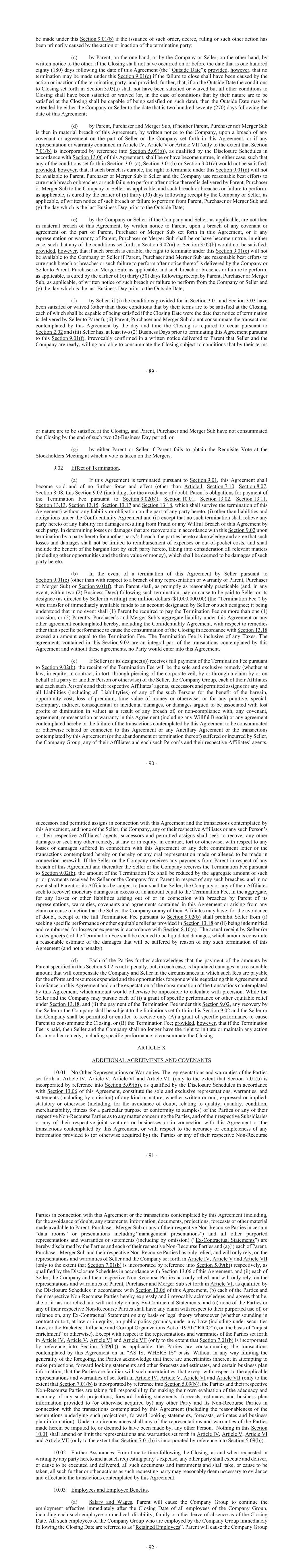 - 89 - be made under this Section 9.01(b) if the issuance of such order, decree, ruling or such other action has been primarily caused by the action or inaction of the terminating party; (c) by Parent, on the one hand, or by the Company or Seller, on the other hand, by written notice to the other, if the Closing shall not have occurred on or before the date that is one hundred eighty (180) days following the date of this Agreement (the “Outside Date”); provided, however, that no termination may be made under this Section 9.01(c) if the failure to close shall have been caused by the action or inaction of the terminating party; and provided, further, that, if on the Outside Date the conditions to Closing set forth in Section 3.03(a) shall not have been satisfied or waived but all other conditions to Closing shall have been satisfied or waived (or, in the case of conditions that by their nature are to be satisfied at the Closing shall be capable of being satisfied on such date), then the Outside Date may be extended by either the Company or Seller to the date that is two hundred seventy (270) days following the date of this Agreement; (d) by Parent, Purchaser and Merger Sub, if neither Parent, Purchaser nor Merger Sub is then in material breach of this Agreement, by written notice to the Company, upon a breach of any covenant or agreement on the part of Seller or the Company set forth in this Agreement, or if any representation or warranty contained in Article IV, Article V or Article VII (only to the extent that Section 7.01(b) is incorporated by reference into Section 5.09(b)), as qualified by the Disclosure Schedules in accordance with Section 13.06 of this Agreement, shall be or have become untrue, in either case, such that any of the conditions set forth in Section 3.01(a), Section 3.01(b) or Section 3.01(c) would not be satisfied; provided, however, that, if such breach is curable, the right to terminate under this Section 9.01(d) will not be available to Parent, Purchaser or Merger Sub if Seller and the Company use reasonable best efforts to cure such breach or breaches or such failure to perform after notice thereof is delivered by Parent, Purchaser or Merger Sub to the Company or Seller, as applicable, and such breach or breaches or failure to perform, as applicable, is cured by the earlier of (x) thirty (30) days following receipt by the Company or Seller, as applicable, of written notice of such breach or failure to perform from Parent, Purchaser or Merger Sub and (y) the day which is the last Business Day prior to the Outside Date; (e) by the Company or Seller, if the Company and Seller, as applicable, are not then in material breach of this Agreement, by written notice to Parent, upon a breach of any covenant or agreement on the part of Parent, Purchaser or Merger Sub set forth in this Agreement, or if any representation or warranty of Parent, Purchaser or Merger Sub shall be or have become untrue, in either case, such that any of the conditions set forth in Section 3.02(a) or Section 3.02(b) would not be satisfied; provided, however, that if such breach is curable, the right to terminate under this Section 9.01(e) will not be available to the Company or Seller if Parent, Purchaser and Merger Sub use reasonable best efforts to cure such breach or breaches or such failure to perform after notice thereof is delivered by the Company or Seller to Parent, Purchaser or Merger Sub, as applicable, and such breach or breaches or failure to perform, as applicable, is cured by the earlier of (x) thirty (30) days following receipt by Parent, Purchaser or Merger Sub, as applicable, of written notice of such breach or failure to perform from the Company or Seller and (y) the day which is the last Business Day prior to the Outside Date; (f) by Seller, if (i) the conditions provided for in Section 3.01 and Section 3.03 have been satisfied or waived (other than those conditions that by their terms are to be satisfied at the Closing, each of which shall be capable of being satisfied if the Closing Date were the date that notice of termination is delivered by Seller to Parent), (ii) Parent, Purchaser and Merger Sub do not consummate the transactions contemplated by this Agreement by the day and time the Closing is required to occur pursuant to Section 2.02 and (iii) Seller has, at least two (2) Business Days prior to terminating this Agreement pursuant to this Section 9.01(f), irrevocably confirmed in a written notice delivered to Parent that Seller and the Company are ready, willing and able to consummate the Closing subject to conditions that by their terms - 90 - or nature are to be satisfied at the Closing, and Parent, Purchaser and Merger Sub have not consummated the Closing by the end of such two (2)-Business Day period; or (g) by either Parent or Seller if Parent fails to obtain the Requisite Vote at the Stockholders Meeting at which a vote is taken on the Mergers. 9.02 Effect of Termination. (a) If this Agreement is terminated pursuant to Section 9.01, this Agreement shall become void and of no further force and effect (other than Article I, Section 7.10, Section 8.07, Section 8.08, this Section 9.02 (including, for the avoidance of doubt, Parent’s obligations for payment of the Termination Fee pursuant to Section 9.02(b)), Section 10.01, Section 13.02, Section 13.11, Section 13.13, Section 13.15, Section 13.17 and Section 13.18, which shall survive the termination of this Agreement) without any liability or obligation on the part of any party hereto, (i) other than liabilities and obligations under the Confidentiality Agreement and (ii) except that no such termination shall relieve any party hereto of any liability for damages resulting from Fraud or any Willful Breach of this Agreement by such party. In determining losses or damages that are recoverable in accordance with this Section 9.02 upon termination by a party hereto for another party’s breach, the parties hereto acknowle