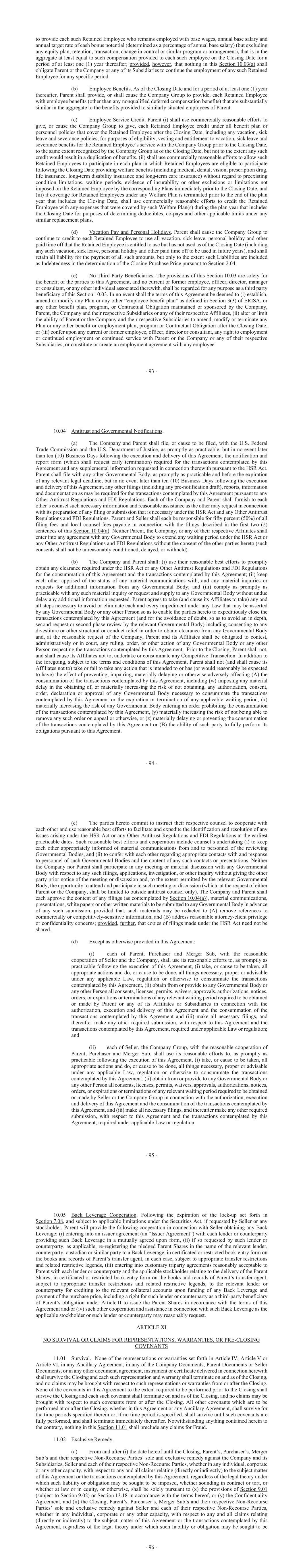 - 93 - to provide each such Retained Employee who remains employed with base wages, annual base salary and annual target rate of cash bonus potential (determined as a percentage of annual base salary) (but excluding any equity plan, retention, transaction, change in control or similar program or arrangement), that is in the aggregate at least equal to such compensation provided to each such employee on the Closing Date for a period of at least one (1) year thereafter; provided, however, that nothing in this Section 10.03(a) shall obligate Parent or the Company or any of its Subsidiaries to continue the employment of any such Retained Employee for any specific period. (b) Employee Benefits. As of the Closing Date and for a period of at least one (1) year thereafter, Parent shall provide, or shall cause the Company Group to provide, each Retained Employee with employee benefits (other than any nonqualified deferred compensation benefits) that are substantially similar in the aggregate to the benefits provided to similarly situated employees of Parent. (c) Employee Service Credit. Parent (i) shall use commercially reasonable efforts to give, or cause the Company Group to give, each Retained Employee credit under all benefit plan or personnel policies that cover the Retained Employee after the Closing Date, including any vacation, sick leave and severance policies, for purposes of eligibility, vesting and entitlement to vacation, sick leave and severance benefits for the Retained Employee’s service with the Company Group prior to the Closing Date, to the same extent recognized by the Company Group as of the Closing Date, but not to the extent any such credit would result in a duplication of benefits, (ii) shall use commercially reasonable efforts to allow such Retained Employees to participate in each plan in which Retained Employees are eligible to participate following the Closing Date providing welfare benefits (including medical, dental, vision, prescription drug, life insurance, long-term disability insurance and long-term care insurance) without regard to preexisting condition limitations, waiting periods, evidence of insurability or other exclusions or limitations not imposed on the Retained Employee by the corresponding Plans immediately prior to the Closing Date, and (iii) if coverage for Retained Employees under any Welfare Plan is terminated prior to the end of the plan year that includes the Closing Date, shall use commercially reasonable efforts to credit the Retained Employee with any expenses that were covered by such Welfare Plan(s) during the plan year that includes the Closing Date for purposes of determining deductibles, co-pays and other applicable limits under any similar replacement plans. (d) Vacation Pay and Personal Holidays. Parent shall cause the Company Group to continue to credit to each Retained Employee to use all vacation, sick leave, personal holiday and other paid time off that the Retained Employee is entitled to use but has not used as of the Closing Date (including any such vacation, sick leave, personal holiday and other paid time off to be used in future years), and shall retain all liability for the payment of all such amounts, but only to the extent such Liabilities are included as Indebtedness in the determination of the Closing Purchase Price pursuant to Section 2.04. (e) No Third-Party Beneficiaries. The provisions of this Section 10.03 are solely for the benefit of the parties to this Agreement, and no current or former employee, officer, director, manager or consultant, or any other individual associated therewith, shall be regarded for any purpose as a third party beneficiary of this Section 10.03. In no event shall the terms of this Agreement be deemed to (i) establish, amend or modify any Plan or any other “employee benefit plan” as defined in Section 3(3) of ERISA, or any other benefit plan, program, or Contractual Obligation maintained or sponsored by the Company, Parent, the Company and their respective Subsidiaries or any of their respective Affiliates, (ii) alter or limit the ability of Parent or the Company and their respective Subsidiaries to amend, modify or terminate any Plan or any other benefit or employment plan, program or Contractual Obligation after the Closing Date, or (iii) confer upon any current or former employee, officer, director or consultant, any right to employment or continued employment or continued service with Parent or the Company or any of their respective Subsidiaries, or constitute or create an employment agreement with any employee. - 94 - 10.04 Antitrust and Governmental Notifications. (a) The Company and Parent shall file, or cause to be filed, with the U.S. Federal Trade Commission and the U.S. Department of Justice, as promptly as practicable, but in no event later than ten (10) Business Days following the execution and delivery of this Agreement, the notification and report form (which shall request early termination) required for the transactions contemplated by this Agreement and any supplemental information requested in connection therewith pursuant to the HSR Act. Parent shall file with any other Governmental Body, as promptly as practicable and before the expiration of any relevant legal deadline, but in no event later than ten (10) Business Days following the execution and delivery of this Agreement, any other filings (including any pre-notification draft), reports, information and documentation as may be required for the transactions contemplated by this Agreement pursuant to any Other Antitrust Regulations and FDI Regulations. Each of the Company and Parent shall furnish to each other’s counsel such necessary information and reasonable assistance as the other may request in connection with its preparation of any filing or submission that is necessary under the HSR Act and any Other Antitrust Regulations and FDI Regulations. Parent and Seller shall each be responsible for fifty percent (50%