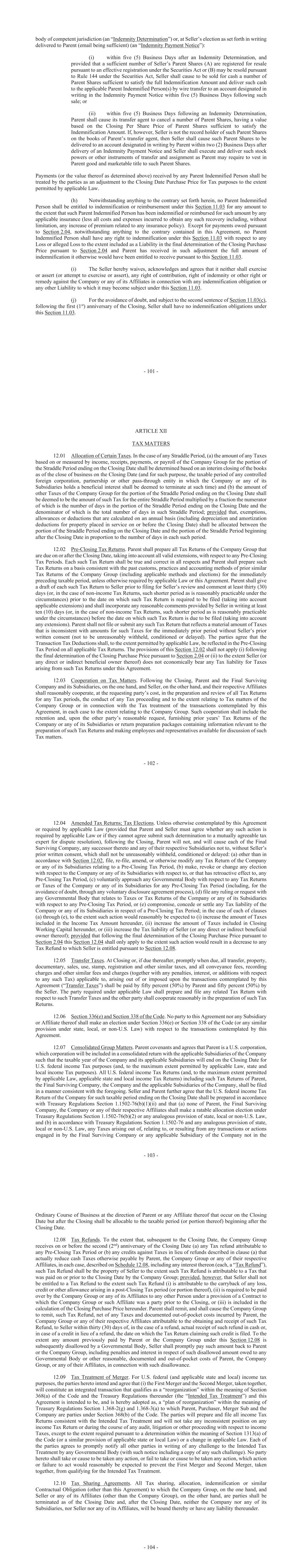- 101 - body of competent jurisdiction (an “Indemnity Determination”) or, at Seller’s election as set forth in writing delivered to Parent (email being sufficient) (an “Indemnity Payment Notice”): (i) within five (5) Business Days after an Indemnity Determination, and provided that a sufficient number of Seller’s Parent Shares (A) are registered for resale pursuant to an effective registration under the Securities Act or (B) may be resold pursuant to Rule 144 under the Securities Act, Seller shall cause to be sold for cash a number of Parent Shares sufficient to satisfy the full Indemnification Amount and deliver such cash to the applicable Parent Indemnified Person(s) by wire transfer to an account designated in writing in the Indemnity Payment Notice within five (5) Business Days following such sale; or (ii) within five (5) Business Days following an Indemnity Determination, Parent shall cause its transfer agent to cancel a number of Parent Shares, having a value based on the Closing Per Share Price of Parent Shares sufficient to satisfy the Indemnification Amount. If, however, Seller is not the record holder of such Parent Shares on the books of Parent’s transfer agent, then Seller shall cause such Parent Shares to be delivered to an account designated in writing by Parent within two (2) Business Days after delivery of an Indemnity Payment Notice and Seller shall execute and deliver such stock powers or other instruments of transfer and assignment as Parent may require to vest in Parent good and marketable title to such Parent Shares. Payments (or the value thereof as determined above) received by any Parent Indemnified Person shall be treated by the parties as an adjustment to the Closing Date Purchase Price for Tax purposes to the extent permitted by applicable Law. (h) Notwithstanding anything to the contrary set forth herein, no Parent Indemnified Person shall be entitled to indemnification or reimbursement under this Section 11.03 for any amount to the extent that such Parent Indemnified Person has been indemnified or reimbursed for such amount by any applicable insurance (less all costs and expenses incurred to obtain any such recovery including, without limitation, any increase of premium related to any insurance policy). Except for payments owed pursuant to Section 2.04, notwithstanding anything to the contrary contained in this Agreement, no Parent Indemnified Person shall have any right to indemnification under this Section 11.03 with respect to any Loss or alleged Loss to the extent included as a Liability in the final determination of the Closing Purchase Price pursuant to Section 2.04 and Parent has received in such adjustment the full amount of indemnification it otherwise would have been entitled to receive pursuant to this Section 11.03. (i) The Seller hereby waives, acknowledges and agrees that it neither shall exercise or assert (or attempt to exercise or assert), any right of contribution, right of indemnity or other right or remedy against the Company or any of its Affiliates in connection with any indemnification obligation or any other Liability to which it may become subject under this Section 11.03. (j) For the avoidance of doubt, and subject to the second sentence of Section 11.03(c), following the first (1st) anniversary of the Closing, Seller shall have no indemnification obligations under this Section 11.03. - 102 - ARTICLE XII TAX MATTERS 12.01 Allocation of Certain Taxes. In the case of any Straddle Period, (a) the amount of any Taxes based on or measured by income, receipts, payments, or payroll of the Company Group for the portion of the Straddle Period ending on the Closing Date shall be determined based on an interim closing of the books as of the close of business on the Closing Date (and for such purpose, the taxable period of any controlled foreign corporation, partnership or other pass-through entity in which the Company or any of its Subsidiaries holds a beneficial interest shall be deemed to terminate at such time) and (b) the amount of other Taxes of the Company Group for the portion of the Straddle Period ending on the Closing Date shall be deemed to be the amount of such Tax for the entire Straddle Period multiplied by a fraction the numerator of which is the number of days in the portion of the Straddle Period ending on the Closing Date and the denominator of which is the total number of days in such Straddle Period; provided that, exemptions, allowances or deductions that are calculated on an annual basis (including depreciation and amortization deductions for property placed in service on or before the Closing Date) shall be allocated between the portion of the Straddle Period ending on the Closing Date and the portion of the Straddle Period beginning after the Closing Date in proportion to the number of days in each such period. 12.02 Pre-Closing Tax Returns. Parent shall prepare all Tax Returns of the Company Group that are due on or after the Closing Date, taking into account all valid extensions, with respect to any Pre-Closing Tax Periods. Each such Tax Return shall be true and correct in all respects and Parent shall prepare such Tax Returns on a basis consistent with the past customs, practices and accounting methods of prior similar Tax Returns of the Company Group (including applicable methods and elections) for the immediately preceding taxable period, unless otherwise required by applicable Law or this Agreement. Parent shall give a draft of each such Tax Return to Seller prior to filing for Seller’s review and comment at least thirty (30) days (or, in the case of non-income Tax Returns, such shorter period as is reasonably practicable under the circumstances) prior to the date on which such Tax Return is required to be filed (taking into account applicable extensions) and shall incorporate any reasonable comments provided by Seller in writing at least ten (10) days (or, in the case of non-income Tax Returns, suc