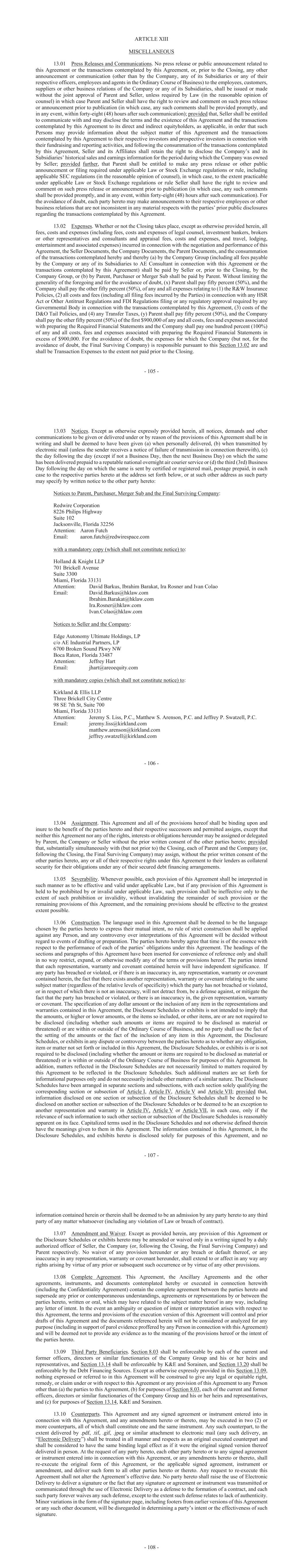- 105 - ARTICLE XIII MISCELLANEOUS 13.01 Press Releases and Communications. No press release or public announcement related to this Agreement or the transactions contemplated by this Agreement, or, prior to the Closing, any other announcement or communication (other than by the Company, any of its Subsidiaries or any of their respective officers, employees and agents in the Ordinary Course of Business) to the employees, customers, suppliers or other business relations of the Company or any of its Subsidiaries, shall be issued or made without the joint approval of Parent and Seller, unless required by Law (in the reasonable opinion of counsel) in which case Parent and Seller shall have the right to review and comment on such press release or announcement prior to publication (in which case, any such comments shall be provided promptly, and in any event, within forty-eight (48) hours after such communication); provided that, Seller shall be entitled to communicate with and may disclose the terms and the existence of this Agreement and the transactions contemplated by this Agreement to its direct and indirect equityholders, as applicable, in order that such Persons may provide information about the subject matter of this Agreement and the transactions contemplated by this Agreement to their respective investors and prospective investors in connection with their fundraising and reporting activities, and following the consummation of the transactions contemplated by this Agreement, Seller and its Affiliates shall retain the right to disclose the Company’s and its Subsidiaries’ historical sales and earnings information for the period during which the Company was owned by Seller; provided further, that Parent shall be entitled to make any press release or other public announcement or filing required under applicable Law or Stock Exchange regulations or rule, including applicable SEC regulations (in the reasonable opinion of counsel), in which case, to the extent practicable under applicable Law or Stock Exchange regulations or rule Seller shall have the right to review and comment on such press release or announcement prior to publication (in which case, any such comments shall be provided promptly, and in any event, within forty-eight (48) hours after such communication). For the avoidance of doubt, each party hereto may make announcements to their respective employees or other business relations that are not inconsistent in any material respects with the parties’ prior public disclosures regarding the transactions contemplated by this Agreement. 13.02 Expenses. Whether or not the Closing takes place, except as otherwise provided herein, all fees, costs and expenses (including fees, costs and expenses of legal counsel, investment bankers, brokers or other representatives and consultants and appraisal fees, costs and expenses, and travel, lodging, entertainment and associated expenses) incurred in connection with the negotiation and performance of this Agreement, the Seller Documents, the Company Documents, the Parent Documents, and the consummation of the transactions contemplated hereby and thereby (a) by the Company Group (including all fees payable by the Company or any of its Subsidiaries to AE Consultant in connection with this Agreement or the transactions contemplated by this Agreement) shall be paid by Seller or, prior to the Closing, by the Company Group, or (b) by Parent, Purchaser or Merger Sub shall be paid by Parent. Without limiting the generality of the foregoing and for the avoidance of doubt, (x) Parent shall pay fifty percent (50%), and the Company shall pay the other fifty percent (50%), of any and all expenses relating to (1) the R&W Insurance Policies, (2) all costs and fees (including all filing fees incurred by the Parties) in connection with any HSR Act or Other Antitrust Regulations and FDI Regulations filing or any regulatory approval required by any Governmental Body in connection with the transactions contemplated by this Agreement, (3) costs of the D&O Tail Policies, and (4) any Transfer Taxes, (y) Parent shall pay fifty percent (50%), and the Company shall pay the other fifty percent (50%) of the first $900,000 of any and all costs, fees and expenses associated with preparing the Required Financial Statements and the Company shall pay one hundred percent (100%) of any and all costs, fees and expenses associated with preparing the Required Financial Statements in excess of $900,000. For the avoidance of doubt, the expenses for which the Company (but not, for the avoidance of doubt, the Final Surviving Company) is responsible pursuant to this Section 13.02 are and shall be Transaction Expenses to the extent not paid prior to the Closing. - 106 - 13.03 Notices. Except as otherwise expressly provided herein, all notices, demands and other communications to be given or delivered under or by reason of the provisions of this Agreement shall be in writing and shall be deemed to have been given (a) when personally delivered, (b) when transmitted by electronic mail (unless the sender receives a notice of failure of transmission in connection therewith), (c) the day following the day (except if not a Business Day, then the next Business Day) on which the same has been delivered prepaid to a reputable national overnight air courier service or (d) the third (3rd) Business Day following the day on which the same is sent by certified or registered mail, postage prepaid, in each case to the respective parties hereto at the address set forth below, or at such other address as such party may specify by written notice to the other party hereto: Notices to Parent, Purchaser, Merger Sub and the Final Surviving Company: Redwire Corporation 8226 Philips Highway Suite 102 Jacksonville, Florida 32256 Attention: Aaron Futch Email: aaron.futch@redwirespace.com with a mandatory copy (which shall not constitute notice) to: Holland & Knight LLP 701 Brickell Avenue Suite 3300 Miami, Flori