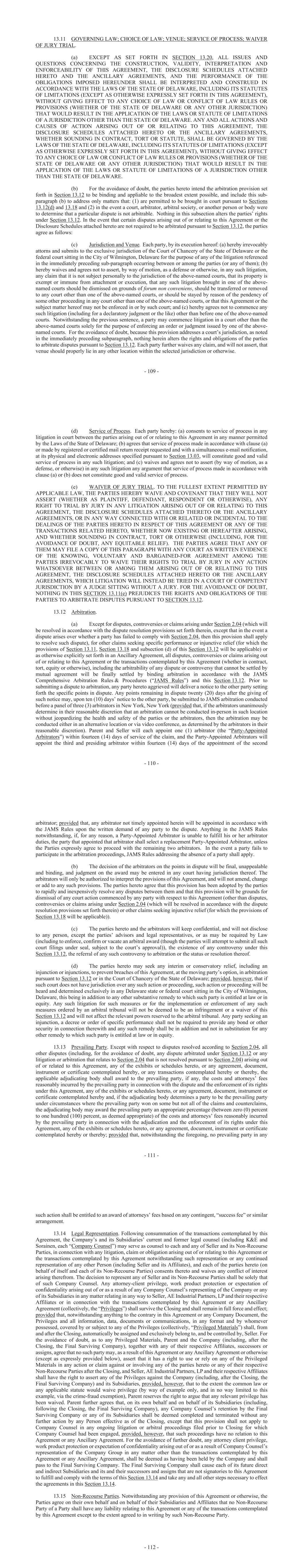 - 109 - 13.11 GOVERNING LAW; CHOICE OF LAW; VENUE; SERVICE OF PROCESS; WAIVER OF JURY TRIAL. (a) EXCEPT AS SET FORTH IN SECTION 13.20, ALL ISSUES AND QUESTIONS CONCERNING THE CONSTRUCTION, VALIDITY, INTERPRETATION AND ENFORCEABILITY OF THIS AGREEMENT, THE DISCLOSURE SCHEDULES ATTACHED HERETO AND THE ANCILLARY AGREEMENTS, AND THE PERFORMANCE OF THE OBLIGATIONS IMPOSED HEREUNDER SHALL BE INTERPRETED AND CONSTRUED IN ACCORDANCE WITH THE LAWS OF THE STATE OF DELAWARE, INCLUDING ITS STATUTES OF LIMITATIONS (EXCEPT AS OTHERWISE EXPRESSLY SET FORTH IN THIS AGREEMENT), WITHOUT GIVING EFFECT TO ANY CHOICE OF LAW OR CONFLICT OF LAW RULES OR PROVISIONS (WHETHER OF THE STATE OF DELAWARE OR ANY OTHER JURISDICTION) THAT WOULD RESULT IN THE APPLICATION OF THE LAWS OR STATUTE OF LIMITATIONS OF A JURISDICTION OTHER THAN THE STATE OF DELAWARE. ANY AND ALL ACTIONS AND CAUSES OF ACTION ARISING OUT OF OR RELATING TO THIS AGREEMENT, THE DISCLOSURE SCHEDULES ATTACHED HERETO OR THE ANCILLARY AGREEMENTS, WHETHER SOUNDING IN CONTRACT, TORT OR STATUTE, SHALL BE GOVERNED BY THE LAWS OF THE STATE OF DELAWARE, INCLUDING ITS STATUTES OF LIMITATIONS (EXCEPT AS OTHERWISE EXPRESSLY SET FORTH IN THIS AGREEMENT), WITHOUT GIVING EFFECT TO ANY CHOICE OF LAW OR CONFLICT OF LAW RULES OR PROVISIONS (WHETHER OF THE STATE OF DELAWARE OR ANY OTHER JURISDICTION) THAT WOULD RESULT IN THE APPLICATION OF THE LAWS OR STATUTE OF LIMITATIONS OF A JURISDICTION OTHER THAN THE STATE OF DELAWARE. (b) For the avoidance of doubt, the parties hereto intend the arbitration provision set forth in Section 13.12 to be binding and appliable to the broadest extent possible, and include this sub- paragraph (b) to address only matters that: (1) are permitted to be brought in court pursuant to Sections 13.12(d) and 13.18 and (2) in the event a court, arbitrator, arbitral society, or another person or body were to determine that a particular dispute is not arbitrable. Nothing in this subsection alters the parties’ rights under Section 13.12. In the event that certain disputes arising out of or relating to this Agreement or the Disclosure Schedules attached hereto are not required to be arbitrated pursuant to Section 13.12, the parties agree as follows: (c) Jurisdiction and Venue. Each party, by its execution hereof: (a) hereby irrevocably attorns and submits to the exclusive jurisdiction of the Court of Chancery of the State of Delaware or the federal court sitting in the City of Wilmington, Delaware for the purpose of any of the litigation referenced in the immediately preceding sub-paragraph occurring between or among the parties (or any of them); (b) hereby waives and agrees not to assert, by way of motion, as a defense or otherwise, in any such litigation, any claim that it is not subject personally to the jurisdiction of the above-named courts, that its property is exempt or immune from attachment or execution, that any such litigation brought in one of the above- named courts should be dismissed on grounds of forum non conveniens, should be transferred or removed to any court other than one of the above-named courts, or should be stayed by reason of the pendency of some other proceeding in any court other than one of the above-named courts, or that this Agreement or the subject matter hereof may not be enforced in or by such court; and (c) hereby agrees not to commence any such litigation (including for a declaratory judgment or the like) other than before one of the above-named courts. Notwithstanding the previous sentence, a party may commence litigation in a court other than the above-named courts solely for the purpose of enforcing an order or judgment issued by one of the above- named courts. For the avoidance of doubt, because this provision addresses a court’s jurisdiction, as noted in the immediately preceding subparagraph, nothing herein alters the rights and obligations of the parties to arbitrate disputes pursuant to Section 13.12. Each party further waives any claim, and will not assert, that venue should properly lie in any other location within the selected jurisdiction or otherwise. - 110 - (d) Service of Process. Each party hereby: (a) consents to service of process in any litigation in court between the parties arising out of or relating to this Agreement in any manner permitted by the Laws of the State of Delaware; (b) agrees that service of process made in accordance with clause (a) or made by registered or certified mail return receipt requested and with a simultaneous e-mail notification, at its physical and electronic addresses specified pursuant to Section 13.03, will constitute good and valid service of process in any such litigation; and (c) waives and agrees not to assert (by way of motion, as a defense, or otherwise) in any such litigation any argument that service of process made in accordance with clause (a) or (b) does not constitute good and valid service of process. (e) WAIVER OF JURY TRIAL. TO THE FULLEST EXTENT PERMITTED BY APPLICABLE LAW, THE PARTIES HEREBY WAIVE AND COVENANT THAT THEY WILL NOT ASSERT (WHETHER AS PLAINTIFF, DEFENDANT, RESPONDENT OR OTHERWISE), ANY RIGHT TO TRIAL BY JURY IN ANY LITIGATION ARISING OUT OF OR RELATING TO THIS AGREEMENT, THE DISCLOSURE SCHEDULES ATTACHED THERETO OR THE ANCILLARY AGREEMENTS, OR IN ANY WAY CONNECTED WITH OR RELATED OR INCIDENTAL TO THE DEALINGS OF THE PARTIES HERETO IN RESPECT OF THIS AGREEMENT OR ANY OF THE TRANSACTIONS RELATED HERETO, WHETHER NOW EXISTING OR HEREAFTER ARISING, AND WHETHER SOUNDING IN CONTRACT, TORT OR OTHERWISE (INCLUDING, FOR THE AVOIDANCE OF DOUBT, ANY EQUITABLE RELIEF). THE PARTIES AGREE THAT ANY OF THEM MAY FILE A COPY OF THIS PARAGRAPH WITH ANY COURT AS WRITTEN EVIDENCE OF THE KNOWING, VOLUNTARY AND BARGAINED-FOR AGREEMENT AMONG THE PARTIES IRREVOCABLY TO WAIVE THEIR RIGHTS TO TRIAL BY JURY IN ANY ACTION WHATSOEVER BETWEEN OR AMONG THEM ARISING OUT OF OR RELATING TO THIS AGREEMENT, THE DISCLOSURE SCHEDULES ATTACHED HERETO OR THE ANCILLARY AGRE