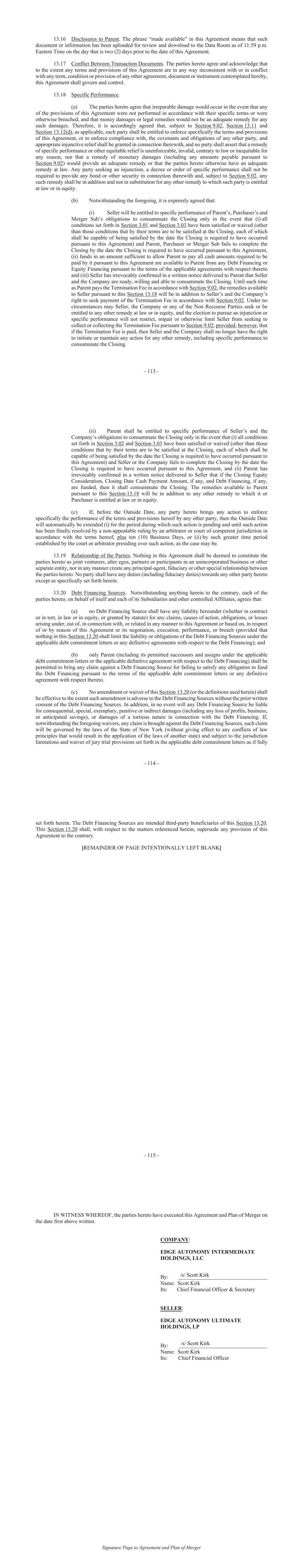 - 113 - 13.16 Disclosures to Parent. The phrase “made available” in this Agreement means that such document or information has been uploaded for review and download to the Data Room as of 11:59 p.m. Eastern Time on the day that is two (2) days prior to the date of this Agreement. 13.17 Conflict Between Transaction Documents. The parties hereto agree and acknowledge that to the extent any terms and provisions of this Agreement are in any way inconsistent with or in conflict with any term, condition or provision of any other agreement, document or instrument contemplated hereby, this Agreement shall govern and control. 13.18 Specific Performance. (a) The parties hereto agree that irreparable damage would occur in the event that any of the provisions of this Agreement were not performed in accordance with their specific terms or were otherwise breached, and that money damages or legal remedies would not be an adequate remedy for any such damages. Therefore, it is accordingly agreed that, subject to Section 9.02, Section 13.11 and Section 13.12(d), as applicable, each party shall be entitled to enforce specifically the terms and provisions of this Agreement, or to enforce compliance with, the covenants and obligations of any other party, and appropriate injunctive relief shall be granted in connection therewith, and no party shall assert that a remedy of specific performance or other equitable relief is unenforceable, invalid, contrary to law or inequitable for any reason, nor that a remedy of monetary damages (including any amounts payable pursuant to Section 9.02) would provide an adequate remedy or that the parties hereto otherwise have an adequate remedy at law. Any party seeking an injunction, a decree or order of specific performance shall not be required to provide any bond or other security in connection therewith and, subject to Section 9.02, any such remedy shall be in addition and not in substitution for any other remedy to which such party is entitled at law or in equity. (b) Notwithstanding the foregoing, it is expressly agreed that: (i) Seller will be entitled to specific performance of Parent’s, Purchaser’s and Merger Sub’s obligations to consummate the Closing only in the event that (i) all conditions set forth in Section 3.01 and Section 3.03 have been satisfied or waived (other than those conditions that by their terms are to be satisfied at the Closing, each of which shall be capable of being satisfied by the date the Closing is required to have occurred pursuant to this Agreement) and Parent, Purchaser or Merger Sub fails to complete the Closing by the date the Closing is required to have occurred pursuant to this Agreement, (ii) funds in an amount sufficient to allow Parent to pay all cash amounts required to be paid by it pursuant to this Agreement are available to Parent from any Debt Financing or Equity Financing pursuant to the terms of the applicable agreements with respect thereto and (iii) Seller has irrevocably confirmed in a written notice delivered to Parent that Seller and the Company are ready, willing and able to consummate the Closing. Until such time as Parent pays the Termination Fee in accordance with Section 9.02, the remedies available to Seller pursuant to this Section 13.18 will be in addition to Seller’s and the Company’s right to seek payment of the Termination Fee in accordance with Section 9.02. Under no circumstances may Seller, the Company or any of the Non Recourse Parties seek or be entitled to any other remedy at law or in equity, and the election to pursue an injunction or specific performance will not restrict, impair or otherwise limit Seller from seeking to collect or collecting the Termination Fee pursuant to Section 9.02; provided, however, that if the Termination Fee is paid, then Seller and the Company shall no longer have the right to initiate or maintain any action for any other remedy, including specific performance to consummate the Closing. - 114 - (ii) Parent shall be entitled to specific performance of Seller’s and the Company’s obligations to consummate the Closing only in the event that (i) all conditions set forth in Section 3.02 and Section 3.03 have been satisfied or waived (other than those conditions that by their terms are to be satisfied at the Closing, each of which shall be capable of being satisfied by the date the Closing is required to have occurred pursuant to this Agreement) and Seller or the Company fails to complete the Closing by the date the Closing is required to have occurred pursuant to this Agreement, and (ii) Parent has irrevocably confirmed in a written notice delivered to Seller that if the Closing Equity Consideration, Closing Date Cash Payment Amount, if any, and Debt Financing, if any, are funded, then it shall consummate the Closing. The remedies available to Parent pursuant to this Section 13.18 will be in addition to any other remedy to which it or Purchaser is entitled at law or in equity. (c) If, before the Outside Date, any party hereto brings any action to enforce specifically the performance of the terms and provisions hereof by any other party, then the Outside Date will automatically be extended (i) for the period during which such action is pending and until such action has been finally resolved by a non-appealable ruling by an arbitrator or court of competent jurisdiction in accordance with the terms hereof, plus ten (10) Business Days, or (ii) by such greater time period established by the court or arbitrator presiding over such action, as the case may be. 13.19 Relationship of the Parties. Nothing in this Agreement shall be deemed to constitute the parties hereto as joint venturers, alter egos, partners or participants in an unincorporated business or other separate entity, nor in any manner create any principal-agent, fiduciary or other special relationship between the parties hereto. No party shall have any duties (including fiduciary duties) towards any other par