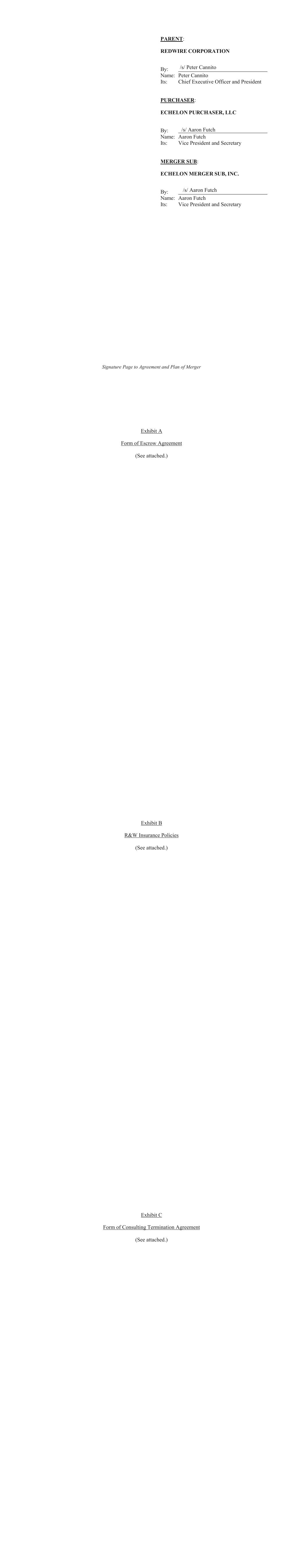 Signature Page to Agreement and Plan of Merger PARENT: REDWIRE CORPORATION By: Name: Peter Cannito Its: Chief Executive Officer and President PURCHASER: ECHELON PURCHASER, LLC By: Name: Aaron Futch Its: Vice President and Secretary MERGER SUB: ECHELON MERGER SUB, INC. By: Name: Aaron Futch Its: Vice President and Secretary Exhibit A Form of Escrow Agreement (See attached.) Exhibit B R&W Insurance Policies (See attached.) Exhibit C Form of Consulting Termination Agreement (See attached.)