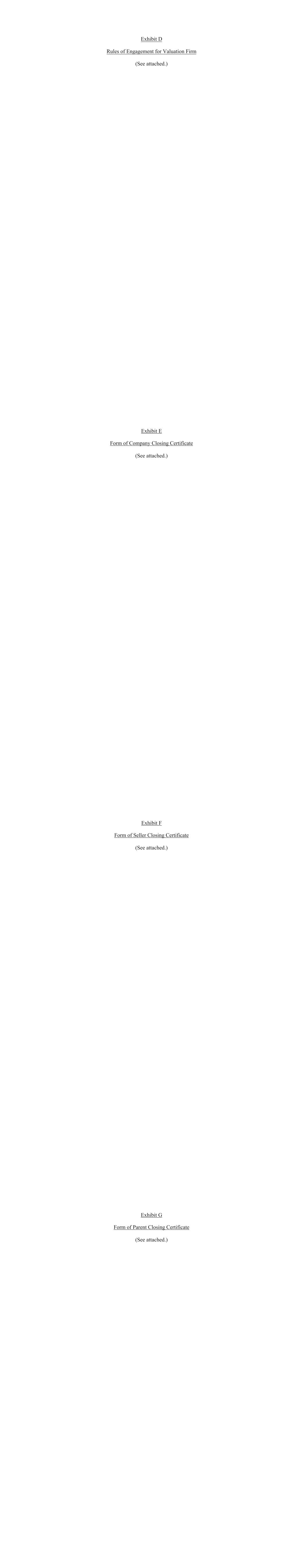 Exhibit (See attached.) Exhibit E Form of Company Closing Certificate (See attached.) Exhibit F Form of Seller Closing Certificate (See attached.) Exhibit G Form of Parent Closing Certificate (See attached.)