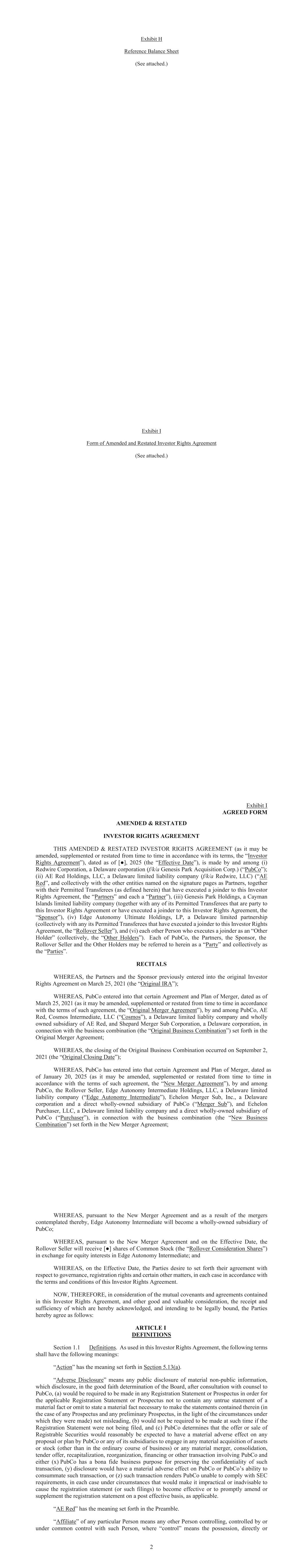 Exhibit H Reference Balance Sheet (See attached.) Exhibit I Form of Amended and Restated Investor Rights Agreement (See attached.) Exhibit I AGREED FORM AMENDED & RESTATED INVESTOR RIGHTS AGREEMENT THIS AMENDED & RESTATED INVESTOR RIGHTS AGREEMENT (as it may be amended, supplemented or restated from time to time in accordance with its terms, the “Investor Rights Agreement”), dated as of Effective Date”), is made by and among (i) Redwire Corporation, a Delaware corporation (f/k/a Genesis Park Acquisition Corp.) (“PubCo”); (ii) AE Red Holdings, LLC, a Delaware limited liability company (f/k/a Redwire, LLC) (“AE Red”, and collectively with the other entities named on the signature pages as Partners, together with their Permitted Transferees (as defined herein) that have executed a joinder to this Investor Rights Agreement, the “Partners” and each a “Partner”), (iii) Genesis Park Holdings, a Cayman Islands limited liability company (together with any of its Permitted Transferees that are party to this Investor Rights Agreement or have executed a joinder to this Investor Rights Agreement, the “Sponsor”), (iv) Edge Autonomy Ultimate Holdings, LP, a Delaware limited partnership (collectively with any its Permitted Transferees that have executed a joinder to this Investor Rights Agreement, the “Rollover Seller”), and (vi) each other Person who executes a joinder as an “Other Holder” (collectively, the “Other Holders”). Each of PubCo, the Partners, the Sponsor, the Rollover Seller and the Other Holders may be referred to herein as a “Party” and collectively as the “Parties”. RECITALS WHEREAS, the Partners and the Sponsor previously entered into the original Investor Original IRA”); WHEREAS, PubCo entered into that certain Agreement and Plan of Merger, dated as of (as it may be amended, supplemented or restated from time to time in accordance with the terms of such agreement, the “Original Merger Agreement”), by and among PubCo, AE Red, Cosmos Intermediate, LLC (“Cosmos”), a Delaware limited liablity company and wholly owned subsidiary of AE Red, and Shepard Merger Sub Corporation, a Delaware corporation, in connection with the business combination (the “Original Business Combination”) set forth in the Original Merger Agreement; Original Closing Date”); WHEREAS, PubCo has entered into that certain Agreement and Plan of Merger, dated as of January (as it may be amended, supplemented or restated from time to time in accordance with the terms of such agreement, the “New Merger Agreement”), by and among PubCo, the Rollover Seller, Edge Autonomy Intermediate Holdings, LLC, a Delaware limited liability company (“Edge Autonomy Intermediate”), Echelon Merger Sub, Inc., a Delaware corporation and a direct wholly-owned subsidiary of PubCo (“Merger Sub”), and Echelon Purchaser, LLC, a Delaware limited liability company and a direct wholly-owned subsidiary of PubCo (“Purchaser”), in connection with the business combination (the “New Business Combination”) set forth in the New Merger Agreement; WHEREAS, pursuant to the New Merger Agreement and as a result of the mergers contemplated thereby, Edge Autonomy Intermediate will become a wholly-owned subsidiary of PubCo; WHEREAS, pursuant to the New Merger Agreement and on the Effective Date, the Rollover Consideration Shares”) in exchange for equity interests in Edge Autonomy Intermediate; and WHEREAS, on the Effective Date, the Parties desire to set forth their agreement with respect to governance, registration rights and certain other matters, in each case in accordance with the terms and conditions of this Investor Rights Agreement. NOW, THEREFORE, in consideration of the mutual covenants and agreements contained in this Investor Rights Agreement, and other good and valuable consideration, the receipt and sufficiency of which are hereby acknowledged, and intending to be legally bound, the Parties hereby agree as follows: ARTICLE I DEFINITIONS Definitions. As used in this Investor Rights Agreement, the following terms shall have the following meanings: “Action” has the meaning set forth in . “Adverse Disclosure” means any public disclosure of material non-public information, which disclosure, in the good faith determination of the Board, after consultation with counsel to PubCo, (a) would be required to be made in any Registration Statement or Prospectus in order for the applicable Registration Statement or Prospectus not to contain any untrue statement of a material fact or omit to state a material fact necessary to make the statements contained therein (in the case of any Prospectus and any preliminary Prospectus, in the light of the circumstances under which they were made) not misleading, (b) would not be required to be made at such time if the Registration Statement were not being filed, and (c) PubCo determines that the offer or sale of Registrable Securities would reasonably be expected to have a material adverse effect on any proposal or plan by PubCo or any of its subsidiaries to engage in any material acquisition of assets or stock (other than in the ordinary course of business) or any material merger, consolidation, tender offer, recapitalization, reorganization, financing or other transaction involving PubCo and either (x) PubCo has a bona fide business purpose for preserving the confidentiality of such transaction, (y) disclosure would have a material adverse effect on PubCo or PubCo’s ability to consummate such transaction, or (z) such transaction renders PubCo unable to comply with SEC requirements, in each case under circumstances that would make it impractical or inadvisable to cause the registration statement (or such filings) to become effective or to promptly amend or supplement the registration statement on a post effective basis, as applicable. “AE Red” has the meaning set forth in the Preamble. “Affiliate” of any particular Person means any