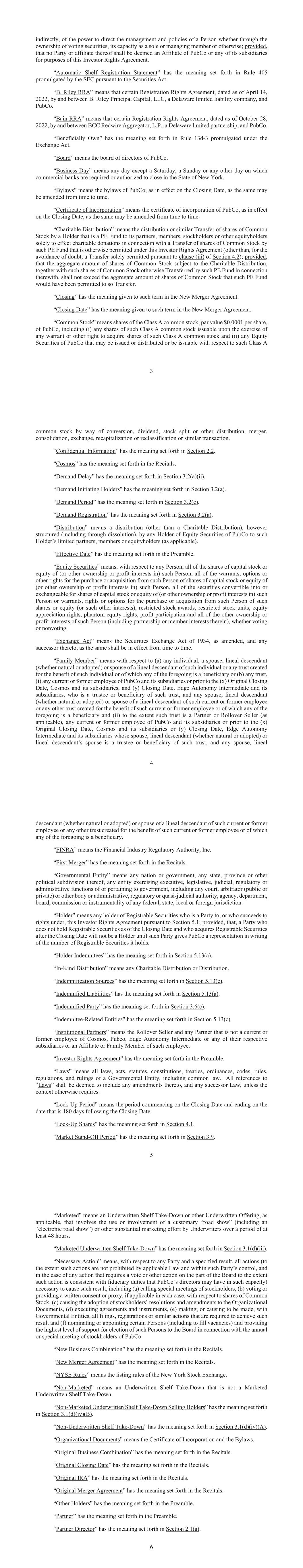 indirectly, of the power to direct the management and policies of a Person whether through the ownership of voting securities, its capacity as a sole or managing member or otherwise; provided, that no Party or affiliate thereof shall be deemed an Affiliate of PubCo or any of its subsidiaries for purposes of this Investor Rights Agreement. “Automatic Shelf Registration Statement” has promulgated by the SEC pursuant to the Securities Act. “B. Riley RRA PubCo. “Bain RRA “Beneficially Own” has the meaning - Exchange Act. “Board” means the board of directors of PubCo. “Business Day” means any day except a Saturday, a Sunday or any other day on which commercial banks are required or authorized to close in the State of New York. “Bylaws” means the bylaws of PubCo, as in effect on the Closing Date, as the same may be amended from time to time. “Certificate of Incorporation” means the certificate of incorporation of PubCo, as in effect on the Closing Date, as the same may be amended from time to time. “Charitable Distribution” means the distribution or similar Transfer of shares of Common Stock by a Holder that is a PE Fund to its partners, members, stockholders or other equityholders solely to effect charitable donations in connection with a Transfer of shares of Common Stock by such PE Fund that is otherwise permitted under this Investor Rights Agreement (other than, for the avoidance of doubt, a Transfer solely permitted pursuant to clause (iii) of ); provided, that the aggregate amount of shares of Common Stock subject to the Charitable Distribution, together with such shares of Common Stock otherwise Transferred by such PE Fund in connection therewith, shall not exceed the aggregate amount of shares of Common Stock that such PE Fund would have been permitted to so Transfer. “Closing” has the meaning given to such term in the New Merger Agreement. “Closing Date” has the meaning given to such term in the New Merger Agreement. “Common Stock” means shares of the of PubCo, including (i) any shares of such Class A common stock issuable upon the exercise of any warrant or other right to acquire shares of such Class A common stock and (ii) any Equity Securities of PubCo that may be issued or distributed or be issuable with respect to such Class A 4 common stock by way of conversion, dividend, stock split or other distribution, merger, consolidation, exchange, recapitalization or reclassification or similar transaction. “Confidential Information” has the meaning set forth in . “Cosmos” has the meaning set forth in the Recitals. “Demand Delay” has the meaning set forth in . “Demand Initiating Holders” has the meaning set forth in . “Demand Period” has the meaning set forth in . “Demand Registration” has the meaning set forth in . “Distribution” means a distribution (other than a Charitable Distribution), however structured (including through dissolution), by any Holder of Equity Securities of PubCo to such Holder’s limited partners, members or equityholders (as applicable). “Effective Date” has the meaning set forth in the Preamble. “Equity Securities” means, with respect to any Person, all of the shares of capital stock or equity of (or other ownership or profit interests in) such Person, all of the warrants, options or other rights for the purchase or acquisition from such Person of shares of capital stock or equity of (or other ownership or profit interests in) such Person, all of the securities convertible into or exchangeable for shares of capital stock or equity of (or other ownership or profit interests in) such Person or warrants, rights or options for the purchase or acquisition from such Person of such shares or equity (or such other interests), restricted stock awards, restricted stock units, equity appreciation rights, phantom equity rights, profit participation and all of the other ownership or profit interests of such Person (including partnership or member interests therein), whether voting or nonvoting. “Exchange Act” , as amended, and any successor thereto, as the same shall be in effect from time to time. “Family Member” means with respect to (a) any individual, a spouse, lineal descendant (whether natural or adopted) or spouse of a lineal descendant of such individual or any trust created for the benefit of such individual or of which any of the foregoing is a beneficiary or (b) any trust, (i) any current or former employee of PubCo and its subsidiaries or prior to the (x) Original Closing Date, Cosmos and its subsidiaries, and (y) Closing Date, Edge Autonomy Intermediate and its subsidiaries, who is a trustee or beneficiary of such trust, and any spouse, lineal descendant (whether natural or adopted) or spouse of a lineal descendant of such current or former employee or any other trust created for the benefit of such current or former employee or of which any of the foregoing is a beneficiary and (ii) to the extent such trust is a Partner or Rollover Seller (as applicable), any current or former employee of PubCo and its subsidiaries or prior to the (x) Original Closing Date, Cosmos and its subsidiaries or (y) Closing Date, Edge Autonomy Intermediate and its subsidiaries whose spouse, lineal descendant (whether natural or adopted) or lineal descendant’s spouse is a trustee or beneficiary of such trust, and any spouse, lineal descendant (whether natural or adopted) or spouse of a lineal descendant of such current or former employee or any other trust created for the benefit of such current or former employee or of which any of the foregoing is a beneficiary. “FINRA” means the Financial Industry Regulatory Authority, Inc. “First Merger” has the meaning set forth in the Recitals. “Governmental Entity” means any nation or government, any state, province or other political subdivision thereof, any entity exercising executive, legislative, judicial, regulatory or administrative functio