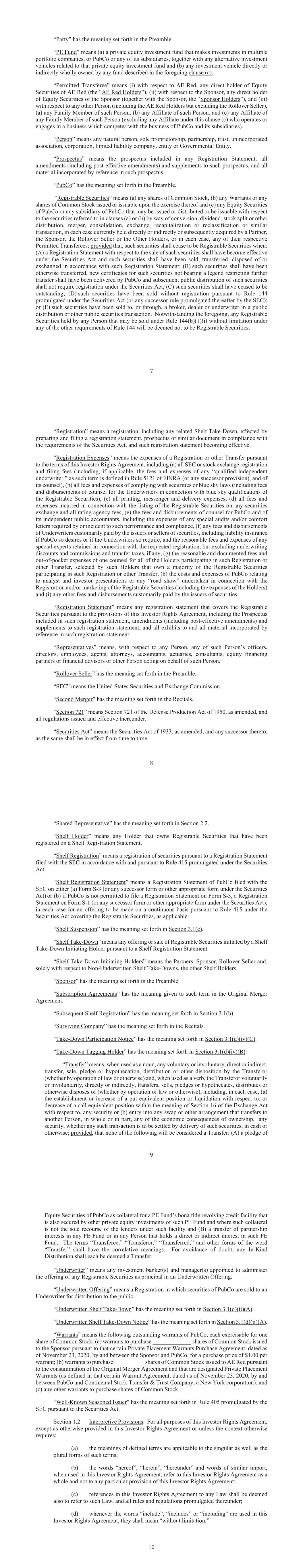 7 “Party” has the meaning set forth in the Preamble. “PE Fund” means (a) a private equity investment fund that makes investments in multiple portfolio companies, or PubCo or any of its subsidiaries, together with any alternative investment vehicles related to that private equity investment fund and (b) any investment vehicle directly or indirectly wholly owned by any fund described in the foregoing clause (a). “Permitted Transferee” means (i) with respect to AE Red, any direct holder of Equity Securities of AE Red (the “AE Red Holders”), (ii) with respect to the Sponsor, any direct holder of Equity Securities of the Sponsor (together with the Sponsor, the “Sponsor Holders”), and (iii) with respect to any other Person (including the AE Red Holders but excluding the Rollover Seller), (a) any Family Member of such Person, (b) any Affiliate of such Person, and (c) any Affiliate of any Family Member of such Person (excluding any Affiliate under this clause (c) who operates or engages in a business which competes with the business of PubCo and its subsidiaries). “Person” means any natural person, sole proprietorship, partnership, trust, unincorporated association, corporation, limited liability company, entity or Governmental Entity. “Prospectus” means the prospectus included in any Registration Statement, all amendments (including post-effective amendments) and supplements to such prospectus, and all material incorporated by reference in such prospectus. “PubCo” has the meaning set forth in the Preamble. “Registrable Securities” means (a) any shares of Common Stock, (b) any Warrants or any shares of Common Stock issued or issuable upon the exercise thereof and (c) any Equity Securities of PubCo or any subsidiary of PubCo that may be issued or distributed or be issuable with respect to the securities referred to in clauses (a) or (b) by way of conversion, dividend, stock split or other distribution, merger, consolidation, exchange, recapitalization or reclassification or similar transaction, in each case currently held directly or indirectly or subsequently acquired by a Partner, the Sponsor, the Rollover Seller or the Other Holders, or in each case, any of their respective Permitted Transferees; provided that, such securities shall cease to be Registrable Securities when: (A) a Registration Statement with respect to the sale of such securities shall have become effective under the Securities Act and such securities shall have been sold, transferred, disposed of or exchanged in accordance with such Registration Statement; (B) such securities shall have been otherwise transferred, new certificates for such securities not bearing a legend restricting further transfer shall have been delivered by PubCo and subsequent public distribution of such securities shall not require registration under the Securities Act; (C) such securities shall have ceased to be outstanding; (D) promulgated under the Securities Act (or any successor rule promulgated thereafter by the SEC); or (E) such securities have been sold to, or through, a broker, dealer or underwriter in a public distribution or other public securities transaction. Notwithstanding the foregoing, any Registrable . “Registration” means a registration, including any related Shelf Take-Down, effected by preparing and filing a registration statement, prospectus or similar document in compliance with the requirements of the Securities Act, and such registration statement becoming effective. “Registration Expenses” means the expenses of a Registration or other Transfer pursuant to the terms of this Investor Rights Agreement, including (a) all SEC or stock exchange registration and filing fees (including, if applicable, the fees and expenses of any “qualified independent underwriter,” as its counsel), (b) all fees and expenses of complying with securities or blue sky laws (including fees and disbursements of counsel for the Underwriters in connection with blue sky qualifications of the Registrable Securities), (c) all printing, messenger and delivery expenses, (d) all fees and expenses incurred in connection with the listing of the Registrable Securities on any securities exchange and all rating agency fees, (e) the fees and disbursements of counsel for PubCo and of its independent public accountants, including the expenses of any special audits and/or comfort letters required by or incident to such performance and compliance, (f) any fees and disbursements of Underwriters customarily paid by the issuers or sellers of securities, including liability insurance if PubCo so desires or if the Underwriters so require, and the reasonable fees and expenses of any special experts retained in connection with the requested registration, but excluding underwriting discounts and commissions and transfer taxes, if any, (g) the reasonable and documented fees and out-of-pocket expenses of one counsel for all of the Holders participating in such Registration or other Transfer, selected by such Holders that own a majority of the Registrable Securities participating in such Registration or other Transfer, (h) the costs and expenses of PubCo relating to analyst and investor presentations or any “road show” undertaken in connection with the Registration and/or marketing of the Registrable Securities (including the expenses of the Holders) and (i) any other fees and disbursements customarily paid by the issuers of securities. “Registration Statement” means any registration statement that covers the Registrable Securities pursuant to the provisions of this Investor Rights Agreement, including the Prospectus included in such registration statement, amendments (including post-effective amendments) and supplements to such registration statement, and all exhibits to and all material incorporated by reference in such registration statement. “Representatives” means, with respect to any Person, any of such Person’s officers