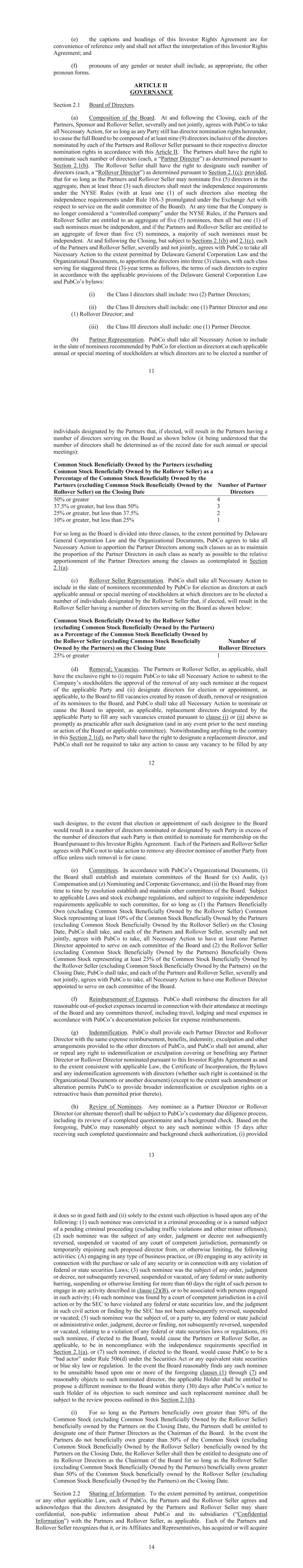 (e) the captions and headings of this Investor Rights Agreement are for convenience of reference only and shall not affect the interpretation of this Investor Rights Agreement; and (f) pronouns of any gender or neuter shall include, as appropriate, the other pronoun forms. ARTICLE II GOVERNANCE Board of Directors. (a) Composition of the Board. At and following the Closing, each of the Partners, Sponsor and Rollover Seller, severally and not jointly, agrees with PubCo to take all Necessary Action, for so long as any Party still has director nomination rights hereunder, to cause the full Board to be composed of at least nine (9) directors inclusive of the directors nominated by each of the Partners and Rollover Seller pursuant to their respective director nomination rights in accordance with this Article II. The Partners shall have the right to nominate such number of directors (each, a “Partner Director”) as determined pursuant to . The Rollover Seller shall have the right to designate such number of directors (each, a “Rollover Director”) as determined pursuant to ; provided, ing the - respect to service on the audit committee of the Board). At any time that the Company is no longer considered a “controlled company” under the NYSE Rules, if the Partners and of such nominees must be independent, and if the Partners and Rollover Seller are entitled to a majority of such nominees must be independent. At and following the Closing, but subject to Sections and , each of the Partners and Rollover Seller, severally and not jointly, agrees with PubCo to take all Necessary Action to the extent permitted by Delaware General Corporation Law and the Organizational Documents, to -year terms as follows, the terms of such directors to expire in accordance with the applicable provisions of the Delaware General Corporation Law and PubCo’s bylaws: (i) (ii) Director and one (iii) (b) Partner Representation. PubCo shall take all Necessary Action to include in the slate of nominees recommended by PubCo for election as directors at each applicable annual or special meeting of stockholders at which directors are to be elected a number of individuals designated by the Partners that, if elected, will result in the Partners having a number of directors serving on the Board as shown below (it being understood that the number of directors shall be determined as of the record date for such annual or special meetings): Common Stock Beneficially Owned by the Partners (excluding Common Stock Beneficially Owned by the Rollover Seller) as a Percentage of the Common Stock Beneficially Owned by the Partners (excluding Common Stock Beneficially Owned by the Rollover Seller) on the Closing Date Number of Partner Directors 4 For so long as the Board is divided into three classes, to the extent permitted by Delaware General Corporation Law and the Organizational Documents, PubCo agrees to take all Necessary Action to apportion the Partner Directors among such classes so as to maintain the proportion of the Partner Directors in each class as nearly as possible to the relative apportionment of the Partner Directors among the classes as contemplated in Section . (c) Rollover Seller Representation. PubCo shall take all Necessary Action to include in the slate of nominees recommended by PubCo for election as directors at each applicable annual or special meeting of stockholders at which directors are to be elected a number of individuals designated by the Rollover Seller that, if elected, will result in the Rollover Seller having a number of directors serving on the Board as shown below: Common Stock Beneficially Owned by the Rollover Seller (excluding Common Stock Beneficially Owned by the Partners) as a Percentage of the Common Stock Beneficially Owned by the Rollover Seller (excluding Common Stock Beneficially Owned by the Partners) on the Closing Date Number of Rollover Directors (d) Removal; Vacancies. The Partners or Rollover Seller, as applicable, shall have the exclusive right to (i) require PubCo to take all Necessary Action to submit to the Company’s stockholders the approval of the removal of any such nominee at the request of the applicable Party and (ii) designate directors for election or appointment, as applicable, to the Board to fill vacancies created by reason of death, removal or resignation of its nominees to the Board, and PubCo shall take all Necessary Action to nominate or cause the Board to appoint, as applicable, replacement directors designated by the applicable Party to fill any such vacancies created pursuant to clause (i) or (ii) above as promptly as practicable after such designation (and in any event prior to the next meeting or action of the Board or applicable committee). Notwithstanding anything to the contrary in this , no Party shall have the right to designate a replacement director, and PubCo shall not be required to take any action to cause any vacancy to be filled by any such designee, to the extent that election or appointment of such designee to the Board would result in a number of directors nominated or designated by such Party in excess of the number of directors that such Party is then entitled to nominate for membership on the Board pursuant to this Investor Rights Agreement. Each of the Partners and Rollover Seller agrees with PubCo not to take action to remove any director nominee of another Party from office unless such removal is for cause. (e) Committees. In accordance with PubCo’s Organizational Documents, (i) the Board shall establish and maintain committees of the Board for (x) Audit, (y) Compensation and (z) Nominating and Corporate Governance, and (ii) the Board may from time to time by resolution establish and maintain other committees of the Board. Subject to applicable Laws and stock exchange regulations, and subject to requisite independence requirements applicable to such committee, for so long as the Partners Beneficially Own (excluding Common Stock Ben