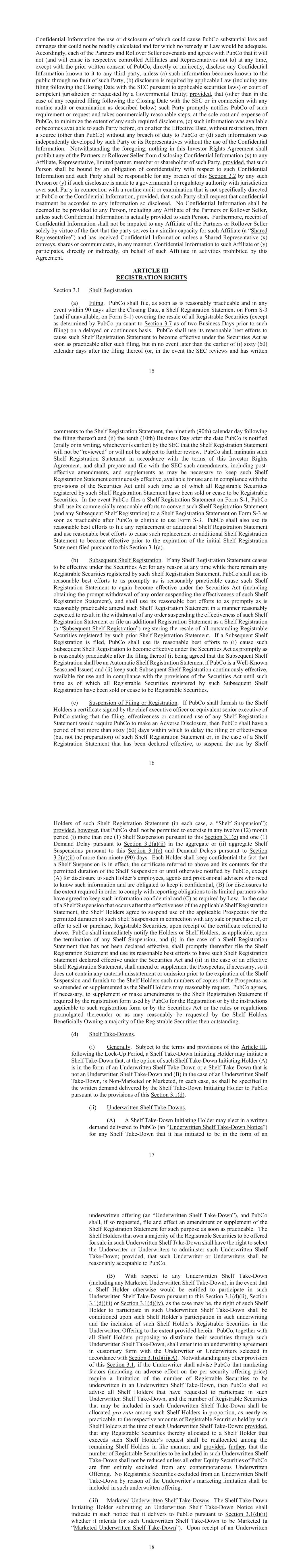 Confidential Information the use or disclosure of which could cause PubCo substantial loss and damages that could not be readily calculated and for which no remedy at Law would be adequate. Accordingly, each of the Partners and Rollover Seller covenants and agrees with PubCo that it will not (and will cause its respective controlled Affiliates and Representatives not to) at any time, except with the prior written consent of PubCo, directly or indirectly, disclose any Confidential Information known to it to any third party, unless (a) such information becomes known to the public through no fault of such Party, (b) disclosure is required by applicable Law (including any filing following the Closing Date with the SEC pursuant to applicable securities laws) or court of competent jurisdiction or requested by a Governmental Entity; provided, that (other than in the case of any required filing following the Closing Date with the SEC or in connection with any routine audit or examination as described below) such Party promptly notifies PubCo of such requirement or request and takes commercially reasonable steps, at the sole cost and expense of PubCo, to minimize the extent of any such required disclosure, (c) such information was available or becomes available to such Party before, on or after the Effective Date, without restriction, from a source (other than PubCo) without any breach of duty to PubCo or (d) such information was independently developed by such Party or its Representatives without the use of the Confidential Information. Notwithstanding the foregoing, nothing in this Investor Rights Agreement shall prohibit any of the Partners or Rollover Seller from disclosing Confidential Information (x) to any Affiliate, Representative, limited partner, member or shareholder of such Party, provided, that such Person shall be bound by an obligation of confidentiality with respect to such Confidential Information and such Party shall be responsible for any breach of this by any such Person or (y) if such disclosure is made to a governmental or regulatory authority with jurisdiction over such Party in connection with a routine audit or examination that is not specifically directed at PubCo or the Confidential Information, provided, that such Party shall request that confidential treatment be accorded to any information so disclosed. No Confidential Information shall be deemed to be provided to any Person, including any Affiliate of the Partners or Rollover Seller, unless such Confidential Information is actually provided to such Person. Furthermore, receipt of Confidential Information shall not be imputed to any Affiliate of the Partners or Rollover Seller solely by virtue of the fact that the party serves in a similar capacity for such Affiliate (a “Shared Representative”) and has received Confidential Information unless a Shared Representative (x) conveys, shares or communicates, in any manner, Confidential Information to such Affiliate or (y) participates, directly or indirectly, on behalf of such Affiliate in activities prohibited by this Agreement. ARTICLE III REGISTRATION RIGHTS Shelf Registration. (a) Filing. PubCo shall file, as soon as is reasonably practicable and in any , a Shelf Registration Statement on Form S- (and if unavailable, on Form S- covering the resale of all Registrable Securities (except as determined by PubCo pursuant to as of two Business Days prior to such filing) on a delayed or continuous basis. PubCo shall use its reasonable best efforts to cause such Shelf Registration Statement to become effective under the Securities Act as soon as practicable after such filing, but in no event later than the calendar days after the filing thereof (or, in the event the SEC reviews and has written comments to the Shelf Business Day after the date PubCo is notified (orally or in writing, whichever is earlier) by the SEC that the Shelf Registration Statement will not be “reviewed” or will not be subject to further review. PubCo shall maintain such Shelf Registration Statement in accordance with the terms of this Investor Rights Agreement, and shall prepare and file with the SEC such amendments, including post- effective amendments, and supplements as may be necessary to keep such Shelf Registration Statement continuously effective, available for use and in compliance with the provisions of the Securities Act until such time as of which all Registrable Securities registered by such Shelf Registration Statement have been sold or cease to be Registrable Securities. In the event PubCo files a Shelf Registration Statement on Form S- PubCo shall use its commercially reasonable efforts to convert such Shelf Registration Statement (and any Subsequent Shelf Registration) to a Shelf Registration Statement on Form S- soon as practicable after PubCo is eligible to use Form S- PubCo shall also use its reasonable best efforts to file any replacement or additional Shelf Registration Statement and use reasonable best efforts to cause such replacement or additional Shelf Registration Statement to become effective prior to the expiration of the initial Shelf Registration Statement filed pursuant to this . (b) Subsequent Shelf Registration. If any Shelf Registration Statement ceases to be effective under the Securities Act for any reason at any time while there remain any Registrable Securities registered by such Shelf Registration Statement, PubCo shall use its reasonable best efforts to as promptly as is reasonably practicable cause such Shelf Registration Statement to again become effective under the Securities Act (including obtaining the prompt withdrawal of any order suspending the effectiveness of such Shelf Registration Statement), and shall use its reasonable best efforts to as promptly as is reasonably practicable amend such Shelf Registration Statement in a manner reasonably expected to result in the withdrawal of any order suspending the effectiveness of such Shelf Registration Sta