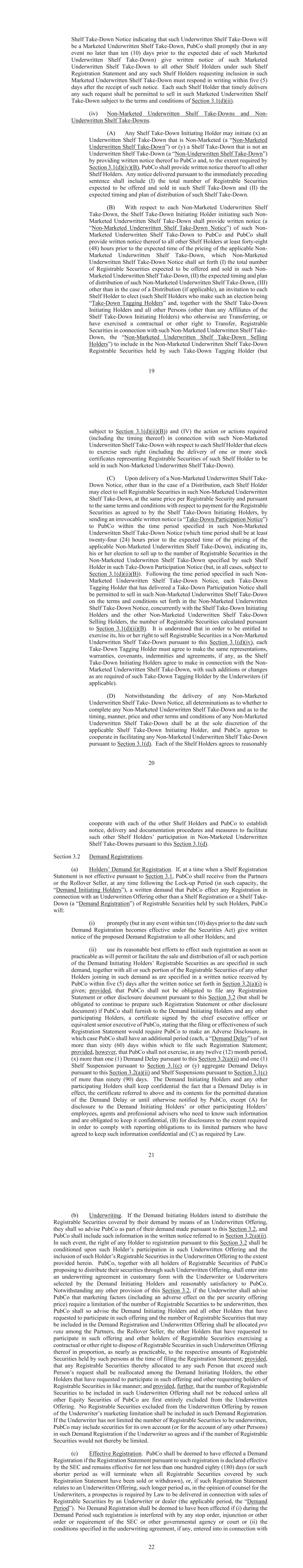 Shelf Take-Down Notice indicating that such Underwritten Shelf Take-Down will be a Marketed Underwritten Shelf Take-Down, PubCo shall promptly (but in any Underwritten Shelf Take-Down) give written notice of such Marketed Underwritten Shelf Take-Down to all other Shelf Holders under such Shelf Registration Statement and any such Shelf Holders requesting inclusion in such Marketed Underwritten Shelf Take-Down must respond in writin days after the receipt of such notice. Each such Shelf Holder that timely delivers any such request shall be permitted to sell in such Marketed Underwritten Shelf Take-Down subject to the terms and conditions of . (iv) Non-Marketed Underwritten Shelf Take-Downs and Non- Underwritten Shelf Take-Downs. (A) Any Shelf Take-Down Initiating Holder may initiate (x) an Underwritten Shelf Take-Down that is Non-Marketed (a “Non-Marketed Underwritten Shelf Take-Down”) or (y) a Shelf Take-Down that is not an Underwritten Shelf Take-Down (a “Non-Underwritten Shelf Take-Down”) by providing written notice thereof to PubCo and, to the extent required by , PubCo shall provide written notice thereof to all other Shelf Holders. Any notice delivered pursuant to the immediately preceding sentence shall include (I) the total number of Registrable Securities expected to be offered and sold in such Shelf Take-Down and (II) the expected timing and plan of distribution of such Shelf Take-Down. (B) With respect to each Non-Marketed Underwritten Shelf Take-Down, the Shelf Take-Down Initiating Holder initiating such Non- Marketed Underwritten Shelf Take-Down shall provide written notice (a “Non-Marketed Underwritten Shelf Take-Down Notice”) of such Non- Marketed Underwritten Shelf Take-Down to PubCo and PubCo shall provide written notice thereof to all other Shelf Holders at least forty-eight - Marketed Underwritten Shelf Take-Down, which Non-Marketed Underwritten Shelf Take-Down Notice shall set forth (I) the total number of Registrable Securities expected to be offered and sold in such Non- Marketed Underwritten Shelf Take-Down, (II) the expected timing and plan of distribution of such Non-Marketed Underwritten Shelf Take-Down, (III) other than in the case of a Distribution (if applicable), an invitation to each Shelf Holder to elect (such Shelf Holders who make such an election being “Take-Down Tagging Holders” and, together with the Shelf Take-Down Initiating Holders and all other Persons (other than any Affiliates of the Shelf Take-Down Initiating Holders) who otherwise are Transferring, or have exercised a contractual or other right to Transfer, Registrable Securities in connection with such Non-Marketed Underwritten Shelf Take- Down, the “Non-Marketed Underwritten Shelf Take-Down Selling Holders”) to include in the Non-Marketed Underwritten Shelf Take-Down Registrable Securities held by such Take-Down Tagging Holder (but subject to ) and (IV) the action or actions required (including the timing thereof) in connection with such Non-Marketed Underwritten Shelf Take-Down with respect to each Shelf Holder that elects to exercise such right (including the delivery of one or more stock certificates representing Registrable Securities of such Shelf Holder to be sold in such Non-Marketed Underwritten Shelf Take-Down). (C) Upon delivery of a Non-Marketed Underwritten Shelf Take- Down Notice, other than in the case of a Distribution, each Shelf Holder may elect to sell Registrable Securities in such Non-Marketed Underwritten Shelf Take-Down, at the same price per Registrable Security and pursuant to the same terms and conditions with respect to payment for the Registrable Securities as agreed to by the Shelf Take-Down Initiating Holders, by sending an irrevocable written notice (a “Take-Down Participation Notice”) to PubCo within the time period specified in such Non-Marketed Underwritten Shelf Take-Down Notice (which time period shall be at least twenty- applicable Non-Marketed Underwritten Shelf Take-Down), indicating its, his or her election to sell up to the number of Registrable Securities in the Non-Marketed Underwritten Shelf Take-Down specified by such Shelf Holder in such Take-Down Participation Notice (but, in all cases, subject to ). Following the time period specified in such Non- Marketed Underwritten Shelf Take-Down Notice, each Take-Down Tagging Holder that has delivered a Take-Down Participation Notice shall be permitted to sell in such Non-Marketed Underwritten Shelf Take-Down on the terms and conditions set forth in the Non-Marketed Underwritten Shelf Take-Down Notice, concurrently with the Shelf Take-Down Initiating Holders and the other Non-Marketed Underwritten Shelf Take-Down Selling Holders, the number of Registrable Securities calculated pursuant to . It is understood that in order to be entitled to exercise its, his or her right to sell Registrable Securities in a Non-Marketed Underwritten Shelf Take-Down pursuant to this , each Take-Down Tagging Holder must agree to make the same representations, warranties, covenants, indemnities and agreements, if any, as the Shelf Take-Down Initiating Holders agree to make in connection with the Non- Marketed Underwritten Shelf Take-Down, with such additions or changes as are required of such Take-Down Tagging Holder by the Underwriters (if applicable). (D) Notwithstanding the delivery of any Non-Marketed Underwritten Shelf Take- Down Notice, all determinations as to whether to complete any Non-Marketed Underwritten Shelf Take-Down and as to the timing, manner, price and other terms and conditions of any Non-Marketed Underwritten Shelf Take-Down shall be at the sole discretion of the applicable Shelf Take-Down Initiating Holder, and PubCo agrees to cooperate in facilitating any Non-Marketed Underwritten Shelf Take-Down pursuant to . Each of the Shelf Holders agrees to reasonably cooperate with each of the other Shelf Holders and PubCo to establish notice, delivery and documentation procedures and measures t