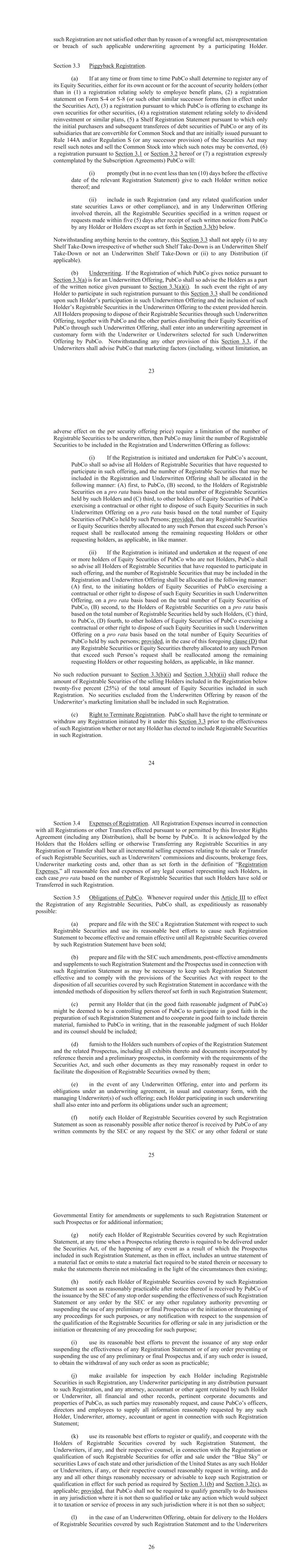 such Registration are not satisfied other than by reason of a wrongful act, misrepresentation or breach of such applicable underwriting agreement by a participating Holder. Piggyback Registration. (a) If at any time or from time to time PubCo shall determine to register any of its Equity Securities, either for its own account or for the account of security holders (other than in registration statement on Form S-4 or S- PubCo is offering to exchange its own securities for other securities, (4) a registration statement relating solely to dividend the initial purchasers and subsequent transferees of debt securities of PubCo or any of its subsidiaries that are convertible for Common Stock and that are initially issued pursuant to resell such notes and sell the Common Stock into which such notes may be converted, a registration pursuant to or hereof or (7) a registration expressly contemplated by the Subscription Agreements) PubCo will: (i) date of the relevant Registration Statement) give to each Holder written notice thereof; and (ii) include in such Registration (and any related qualification under state securities Laws or other compliance), and in any Underwritten Offering involved therein, all the Registrable Securities specified in a written request or PubCo by any Holder or Holders except as set forth in below. Notwithstanding anything herein to the contrary, this shall not apply (i) to any Shelf Take-Down irrespective of whether such Shelf Take-Down is an Underwritten Shelf Take-Down or not an Underwritten Shelf Take-Down or (ii) to any Distribution (if applicable). (b) Underwriting. If the Registration of which PubCo gives notice pursuant to is for an Underwritten Offering, PubCo shall so advise the Holders as a part of the written notice given pursuant to . In such event the right of any Holder to participate in such registration pursuant to this shall be conditioned upon such Holder’s participation in such Underwritten Offering and the inclusion of such Holder’s Registrable Securities in the Underwritten Offering to the extent provided herein. All Holders proposing to dispose of their Registrable Securities through such Underwritten Offering, together with PubCo and the other parties distributing their Equity Securities of PubCo through such Underwritten Offering, shall enter into an underwriting agreement in customary form with the Underwriter or Underwriters selected for such Underwritten Offering by PubCo. Notwithstanding any other provision of this , if the Underwriters shall advise PubCo that marketing factors (including, without limitation, an adverse effect on the per security offering price) require a limitation of the number of Registrable Securities to be underwritten, then PubCo may limit the number of Registrable Securities to be included in the Registration and Underwritten Offering as follows: (i) If the Registration is initiated and undertaken for PubCo’s account, PubCo shall so advise all Holders of Registrable Securities that have requested to participate in such offering, and the number of Registrable Securities that may be included in the Registration and Underwritten Offering shall be allocated in the following manner: (A) first, to PubCo, (B) second, to the Holders of Registrable Securities on a pro rata basis based on the total number of Registrable Securities held by such Holders and (C) third, to other holders of Equity Securities of PubCo exercising a contractual or other right to dispose of such Equity Securities in such Underwritten Offering on a pro rata basis based on the total number of Equity Securities of PubCo held by such Persons; provided, that any Registrable Securities or Equity Securities thereby allocated to any such Person that exceed such Person’s request shall be reallocated among the remaining requesting Holders or other requesting holders, as applicable, in like manner. (ii) If the Registration is initiated and undertaken at the request of one or more holders of Equity Securities of PubCo who are not Holders, PubCo shall so advise all Holders of Registrable Securities that have requested to participate in such offering, and the number of Registrable Securities that may be included in the Registration and Underwritten Offering shall be allocated in the following manner: (A) first, to the initiating holders of Equity Securities of PubCo exercising a contractual or other right to dispose of such Equity Securities in such Underwritten Offering, on a pro rata basis based on the total number of Equity Securities of PubCo, (B) second, to the Holders of Registrable Securities on a pro rata basis based on the total number of Registrable Securities held by such Holders, (C) third, to PubCo, (D) fourth, to other holders of Equity Securities of PubCo exercising a contractual or other right to dispose of such Equity Securities in such Underwritten Offering on a pro rata basis based on the total number of Equity Securities of PubCo held by such persons; provided, in the case of this foregoing clause (D) that any Registrable Securities or Equity Securities thereby allocated to any such Person that exceed such Person’s request shall be reallocated among the remaining requesting Holders or other requesting holders, as applicable, in like manner. No such reduction pursuant to and shall reduce the amount of Registrable Securities of the selling Holders included in the Registration below twenty- Equity Securities included in such Registration. No securities excluded from the Underwritten Offering by reason of the Underwriter’s marketing limitation shall be included in such Registration. (c) Right to Terminate Registration. PubCo shall have the right to terminate or withdraw any Registration initiated by it under this prior to the effectiveness of such Registration whether or not any Holder has elected to include Registrable Securities in such Registration. Expenses of Registration. All Registration Expenses incurred in connection with all Registr