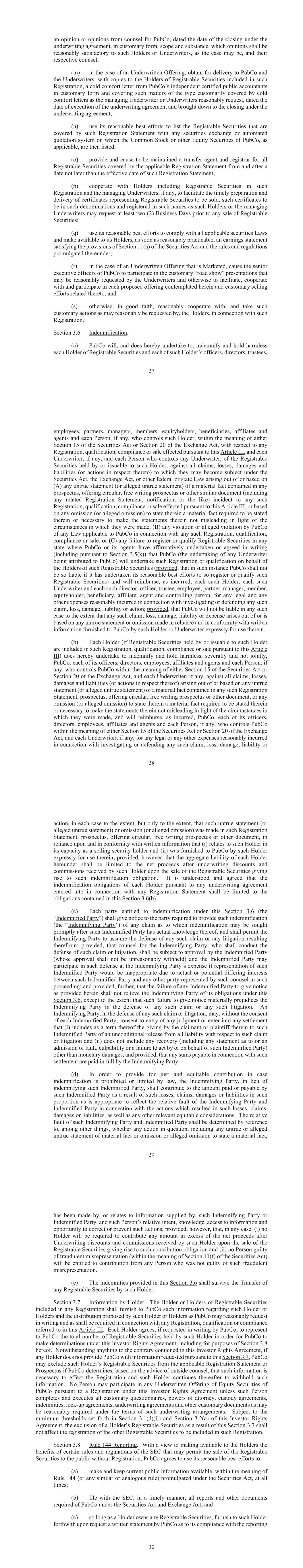 an opinion or opinions from counsel for PubCo, dated the date of the closing under the underwriting agreement, in customary form, scope and substance, which opinions shall be reasonably satisfactory to such Holders or Underwriters, as the case may be, and their respective counsel; (m) in the case of an Underwritten Offering, obtain for delivery to PubCo and the Underwriters, with copies to the Holders of Registrable Securities included in such Registration, a cold comfort letter from PubCo’s independent certified public accountants in customary form and covering such matters of the type customarily covered by cold comfort letters as the managing Underwriter or Underwriters reasonably request, dated the date of execution of the underwriting agreement and brought down to the closing under the underwriting agreement; (n) use its reasonable best efforts to list the Registrable Securities that are covered by such Registration Statement with any securities exchange or automated quotation system on which the Common Stock or other Equity Securities of PubCo, as applicable, are then listed; (o) provide and cause to be maintained a transfer agent and registrar for all Registrable Securities covered by the applicable Registration Statement from and after a date not later than the effective date of such Registration Statement; (p) cooperate with Holders including Registrable Securities in such Registration and the managing Underwriters, if any, to facilitate the timely preparation and delivery of certificates representing Registrable Securities to be sold, such certificates to be in such denominations and registered in such names as such Holders or the managing U Securities; (q) use its reasonable best efforts to comply with all applicable securities Laws and make available to its Holders, as soon as reasonably practicable, an earnings statement ions promulgated thereunder; (r) in the case of an Underwritten Offering that is Marketed, cause the senior executive officers of PubCo to participate in the customary “road show” presentations that may be reasonably requested by the Underwriters and otherwise to facilitate, cooperate with and participate in each proposed offering contemplated herein and customary selling efforts related thereto; and (s) otherwise, in good faith, reasonably cooperate with, and take such customary actions as may reasonably be requested by, the Holders, in connection with such Registration. Indemnification. (a) PubCo will, and does hereby undertake to, indemnify and hold harmless each Holder of Registrable Securities and each of such Holder’s officers, directors, trustees, employees, partners, managers, members, equityholders, beneficiaries, affiliates and agents and each Person, if any, who controls such Holder, within the meaning of either any Registration, qualification, compliance or sale effected pursuant to this Article III, and each Underwriter, if any, and each Person who controls any Underwriter, of the Registrable Securities held by or issuable to such Holder, against all claims, losses, damages and liabilities (or actions in respect thereto) to which they may become subject under the Securities Act, the Exchange Act, or other federal or state Law arising out of or based on (A) any untrue statement (or alleged untrue statement) of a material fact contained in any prospectus, offering circular, free writing prospectus or other similar document (including any related Registration Statement, notification, or the like) incident to any such Registration, qualification, compliance or sale effected pursuant to this Article III, or based on any omission (or alleged omission) to state therein a material fact required to be stated therein or necessary to make the statements therein not misleading in light of the circumstances in which they were made, (B) any violation or alleged violation by PubCo of any Law applicable to PubCo in connection with any such Registration, qualification, compliance or sale, or (C) any failure to register or qualify Registrable Securities in any state where PubCo or its agents have affirmatively undertaken or agreed in writing (including pursuant to ) that PubCo (the undertaking of any Underwriter being attributed to PubCo) will undertake such Registration or qualification on behalf of the Holders of such Registrable Securities (provided, that in such instance PubCo shall not be so liable if it has undertaken its reasonable best efforts to so register or qualify such Registrable Securities) and will reimburse, as incurred, each such Holder, each such Underwriter and each such director, officer, trustee, employee, partner, manager, member, equityholder, beneficiary, affiliate, agent and controlling person, for any legal and any other expenses reasonably incurred in connection with investigating or defending any such claim, loss, damage, liability or action; provided, that PubCo will not be liable in any such case to the extent that any such claim, loss, damage, liability or expense arises out of or is based on any untrue statement or omission made in reliance and in conformity with written information furnished to PubCo by such Holder or Underwriter expressly for use therein. (b) Each Holder (if Registrable Securities held by or issuable to such Holder are included in such Registration, qualification, compliance or sale pursuant to this Article III) does hereby undertake to indemnify and hold harmless, severally and not jointly, PubCo, each of its officers, directors, employees, affiliates and agents and each Person, if any, who controls PubCo and each Underwriter, if any, against all claims, losses, damages and liabilities (or actions in respect thereof) arising out of or based on any untrue statement (or alleged untrue statement) of a material fact contained in any such Registration Statement, prospectus, offering circular, free writing prospectus or other document, or any omission (or alleged omission) to state therein a material fact req