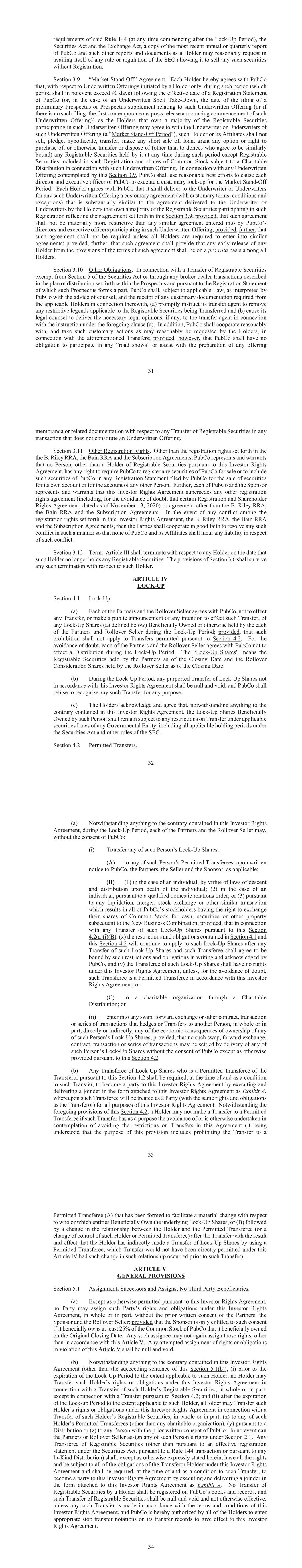 the Lock-Up Period), the Securities Act and the Exchange Act, a copy of the most recent annual or quarterly report of PubCo and such other reports and documents as a Holder may reasonably request in availing itself of any rule or regulation of the SEC allowing it to sell any such securities without Registration. “Market Stand Off” Agreement. Each Holder hereby agrees with PubCo that, with respect to Underwritten Offerings initiated by a Holder only, during such period (which period shall in no event exceed days) following the effective date of a Registration Statement of PubCo (or, in the case of an Underwritten Shelf Take-Down, the date of the filing of a preliminary Prospectus or Prospectus supplement relating to such Underwritten Offering (or if there is no such filing, the first contemporaneous press release announcing commencement of such Underwritten Offering)) as the Holders that own a majority of the Registrable Securities participating in such Underwritten Offering may agree to with the Underwriter or Underwriters of such Underwritten Offering (a “Market Stand-Off Period”), such Holder or its Affiliates shall not sell, pledge, hypothecate, transfer, make any short sale of, loan, grant any option or right to purchase of, or otherwise transfer or dispose of (other than to donees who agree to be similarly bound) any Registrable Securities held by it at any time during such period except Registrable Securities included in such Registration and shares of Common Stock subject to a Charitable Distribution in connection with such Underwritten Offering. In connection with any Underwritten Offering contemplated by this , PubCo shall use reasonable best efforts to cause each director and executive officer of PubCo to execute a customary lock-up for the Market Stand-Off Period. Each Holder agrees with PubCo that it shall deliver to the Underwriter or Underwriters for any such Underwritten Offering a customary agreement (with customary terms, conditions and exceptions) that is substantially similar to the agreement delivered to the Underwriter or Underwriters by the Holders that own a majority of the Registrable Securities participating in such Registration reflecting their agreement set forth in this ; provided, that such agreement shall not be materially more restrictive than any similar agreement entered into by PubCo’s directors and executive officers participating in such Underwritten Offering; provided, further, that such agreement shall not be required unless all Holders are required to enter into similar agreements; provided, further, that such agreement shall provide that any early release of any Holder from the provisions of the terms of such agreement shall be on a pro rata basis among all Holders. Other Obligations. In connection with a Transfer of Registrable Securities -dealer transactions described in the plan of distribution set forth within the Prospectus and pursuant to the Registration Statement of which such Prospectus forms a part, PubCo shall, subject to applicable Law, as interpreted by PubCo with the advice of counsel, and the receipt of any customary documentation required from the applicable Holders in connection therewith, (a) promptly instruct its transfer agent to remove any restrictive legends applicable to the Registrable Securities being Transferred and (b) cause its legal counsel to deliver the necessary legal opinions, if any, to the transfer agent in connection with the instruction under the foregoing clause (a). In addition, PubCo shall cooperate reasonably with, and take such customary actions as may reasonably be requested by the Holders, in connection with the aforementioned Transfers; provided, however, that PubCo shall have no obligation to participate in any “road shows” or assist with the preparation of any offering memoranda or related documentation with respect to any Transfer of Registrable Securities in any transaction that does not constitute an Underwritten Offering. Other Registration Rights. Other than the registration rights set forth in the the B. Riley RRA, the Bain RRA and the Subscription Agreements, PubCo represents and warrants that no Person, other than a Holder of Registrable Securities pursuant to this Investor Rights Agreement, has any right to require PubCo to register any securities of PubCo for sale or to include such securities of PubCo in any Registration Statement filed by PubCo for the sale of securities for its own account or for the account of any other Person. Further, each of PubCo and the Sponsor represents and warrants that this Investor Rights Agreement supersedes any other registration rights agreement (including, for the avoidance of doubt, that certain Registration and Shareholder or agreement other than the B. Riley RRA, the Bain RRA and the Subscription Agreements. In the event of any conflict among the registration rights set forth in this Investor Rights Agreement, the B. Riley RRA, the Bain RRA and the Subscription Agreements, then the Parties shall cooperate in good faith to resolve any such conflict in such a manner so that none of PubCo and its Affiliates shall incur any liability in respect of such conflict. Term. Article III shall terminate with respect to any Holder on the date that such Holder no longer holds any Registrable Securities. The provisions of shall survive any such termination with respect to such Holder. ARTICLE IV LOCK-UP Lock-Up. (a) Each of the Partners and the Rollover Seller agrees with PubCo, not to effect any Transfer, or make a public announcement of any intention to effect such Transfer, of any Lock-Up Shares (as defined below) Beneficially Owned or otherwise held by the each of the Partners and Rollover Seller during the Lock-Up Period; provided, that such prohibition shall not apply to Transfers permitted pursuant to . For the avoidance of doubt, each of the Partners and the Rollover Seller agrees with PubCo not to effect a Distribution during the Lock-Up Period. T
