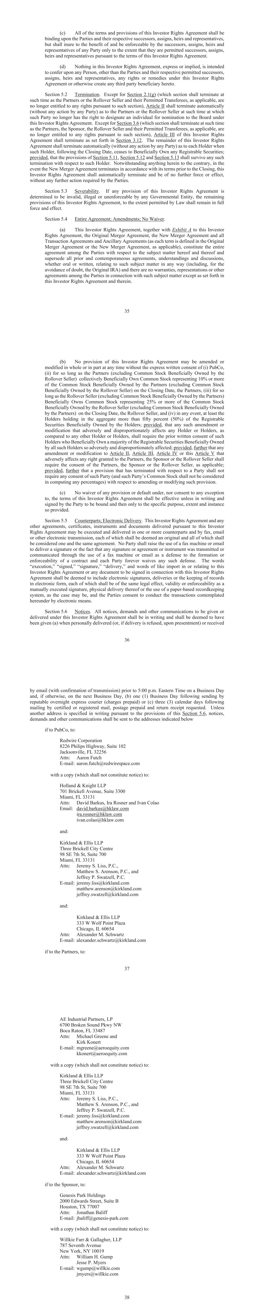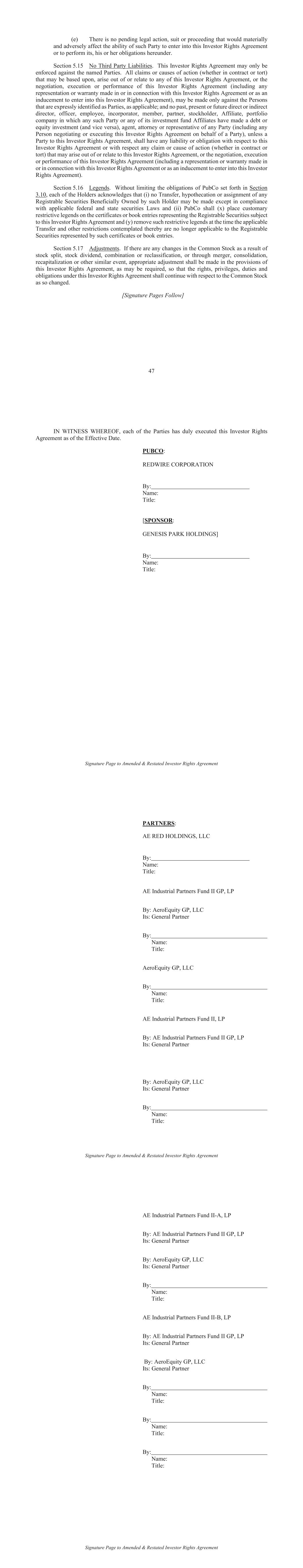 47 (e) There is no pending legal action, suit or proceeding that would materially and adversely affect the ability of such Party to enter into this Investor Rights Agreement or to perform its, his or her obligations hereunder. No Third Party Liabilities. This Investor Rights Agreement may only be enforced against the named Parties. All claims or causes of action (whether in contract or tort) that may be based upon, arise out of or relate to any of this Investor Rights Agreement, or the negotiation, execution or performance of this Investor Rights Agreement (including any representation or warranty made in or in connection with this Investor Rights Agreement or as an inducement to enter into this Investor Rights Agreement), may be made only against the Persons that are expressly identified as Parties, as applicable; and no past, present or future direct or indirect director, officer, employee, incorporator, member, partner, stockholder, Affiliate, portfolio company in which any such Party or any of its investment fund Affiliates have made a debt or equity investment (and vice versa), agent, attorney or representative of any Party (including any Person negotiating or executing this Investor Rights Agreement on behalf of a Party), unless a Party to this Investor Rights Agreement, shall have any liability or obligation with respect to this Investor Rights Agreement or with respect any claim or cause of action (whether in contract or tort) that may arise out of or relate to this Investor Rights Agreement, or the negotiation, execution or performance of this Investor Rights Agreement (including a representation or warranty made in or in connection with this Investor Rights Agreement or as an inducement to enter into this Investor Rights Agreement). Legends. Without limiting the obligations of PubCo set forth in Section , each of the Holders acknowledges that (i) no Transfer, hypothecation or assignment of any Registrable Securities Beneficially Owned by such Holder may be made except in compliance with applicable federal and state securities Laws and (ii) PubCo shall (x) place customary restrictive legends on the certificates or book entries representing the Registrable Securities subject to this Investor Rights Agreement and (y) remove such restrictive legends at the time the applicable Transfer and other restrictions contemplated thereby are no longer applicable to the Registrable Securities represented by such certificates or book entries. Adjustments. If there are any changes in the Common Stock as a result of stock split, stock dividend, combination or reclassification, or through merger, consolidation, recapitalization or other similar event, appropriate adjustment shall be made in the provisions of this Investor Rights Agreement, as may be required, so that the rights, privileges, duties and obligations under this Investor Rights Agreement shall continue with respect to the Common Stock as so changed. [Signature Pages Follow] Signature Page to Amended & Restated Investor Rights Agreement IN WITNESS WHEREOF, each of the Parties has duly executed this Investor Rights Agreement as of the Effective Date. PUBCO: REDWIRE CORPORATION By: Name: Title: [SPONSOR: By: Name: Title: Signature Page to Amended & Restated Investor Rights Agreement PARTNERS: AE RED HOLDINGS, LLC By: Name: Title: AE Industrial Partners Fund II GP, LP By: AeroEquity GP, LLC Its: General Partner By: Name: Title: AeroEquity GP, LLC By: Name: Title: AE Industrial Partners Fund II, LP By: AE Industrial Partners Fund II GP, LP Its: General Partner By: AeroEquity GP, LLC Its: General Partner By: Name: Title: Signature Page to Amended & Restated Investor Rights Agreement AE Industrial Partners Fund II-A, LP By: AE Industrial Partners Fund II GP, LP Its: General Partner By: AeroEquity GP, LLC Its: General Partner By: Name: Title: AE Industrial Partners Fund II-B, LP By: AE Industrial Partners Fund II GP, LP Its: General Partner By: AeroEquity GP, LLC Its: General Partner By: Name: Title: By: Name: Title: By: Name: Title: