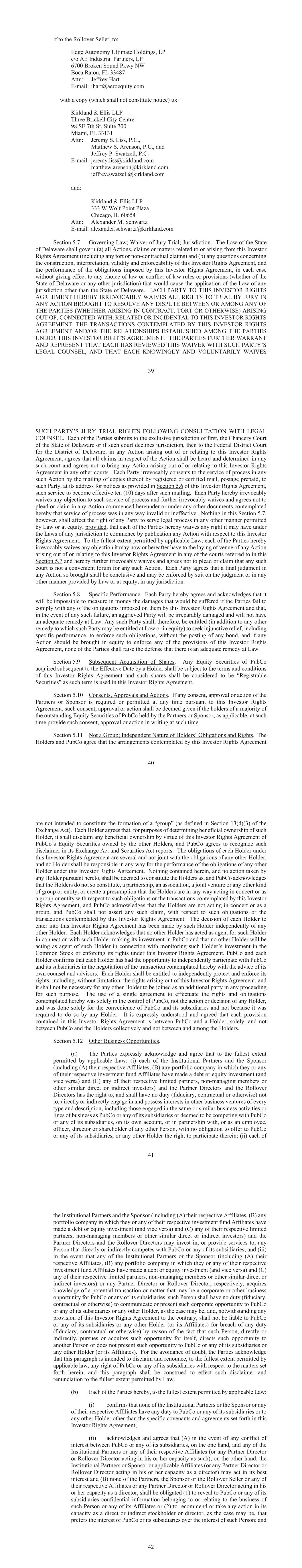 if to the Rollover Seller, to: Edge Autonomy Ultimate Holdings, LP c/o AE Industrial Partners, LP Pkwy NW Attn: Jeffrey Hart E-mail: jhart@aeroequity.com with a copy (which shall not constitute notice) to: Kirkland & Ellis LLP Three Brickell City Centre Attn: Jeremy S. Liss, P.C., Matthew S. Arenson, P.C., and Jeffrey P. Swatzell, P.C. E-mail: jeremy.liss@kirkland.com matthew.arenson@kirkland.com jeffrey.swatzell@kirkland.com and: Kirkland & Ellis LLP Attn: Alexander M. Schwartz E-mail: alexander.schwartz@kirkland.com Governing Law; Waiver of Jury Trial; Jurisdiction. The Law of the State of Delaware shall govern (a) all Actions, claims or matters related to or arising from this Investor Rights Agreement (including any tort or non-contractual claims) and (b) any questions concerning the construction, interpretation, validity and enforceability of this Investor Rights Agreement, and the performance of the obligations imposed by this Investor Rights Agreement, in each case without giving effect to any choice of law or conflict of law rules or provisions (whether of the State of Delaware or any other jurisdiction) that would cause the application of the Law of any jurisdiction other than the State of Delaware. EACH PARTY TO THIS INVESTOR RIGHTS AGREEMENT HEREBY IRREVOCABLY WAIVES ALL RIGHTS TO TRIAL BY JURY IN ANY ACTION BROUGHT TO RESOLVE ANY DISPUTE BETWEEN OR AMONG ANY OF THE PARTIES (WHETHER ARISING IN CONTRACT, TORT OR OTHERWISE) ARISING OUT OF, CONNECTED WITH, RELATED OR INCIDENTAL TO THIS INVESTOR RIGHTS AGREEMENT, THE TRANSACTIONS CONTEMPLATED BY THIS INVESTOR RIGHTS AGREEMENT AND/OR THE RELATIONSHIPS ESTABLISHED AMONG THE PARTIES UNDER THIS INVESTOR RIGHTS AGREEMENT. THE PARTIES FURTHER WARRANT AND REPRESENT THAT EACH HAS REVIEWED THIS WAIVER WITH SUCH PARTY’S LEGAL COUNSEL, AND THAT EACH KNOWINGLY AND VOLUNTARILY WAIVES SUCH PARTY’S JURY TRIAL RIGHTS FOLLOWING CONSULTATION WITH LEGAL COUNSEL. Each of the Parties submits to the exclusive jurisdiction of first, the Chancery Court of the State of Delaware or if such court declines jurisdiction, then to the Federal District Court for the District of Delaware, in any Action arising out of or relating to this Investor Rights Agreement, agrees that all claims in respect of the Action shall be heard and determined in any such court and agrees not to bring any Action arising out of or relating to this Investor Rights Agreement in any other courts. Each Party irrevocably consents to the service of process in any such Action by the mailing of copies thereof by registered or certified mail, postage prepaid, to such Party, at its address for notices as provided in of this Investor Rights Agreement, waives any objection to such service of process and further irrevocably waives and agrees not to plead or claim in any Action commenced hereunder or under any other documents contemplated hereby that service of process was in any way invalid or ineffective. Nothing in this , however, shall affect the right of any Party to serve legal process in any other manner permitted by Law or at equity; provided, that each of the Parties hereby waives any right it may have under the Laws of any jurisdiction to commence by publication any Action with respect to this Investor Rights Agreement. To the fullest extent permitted by applicable Law, each of the Parties hereby irrevocably waives any objection it may now or hereafter have to the laying of venue of any Action arising out of or relating to this Investor Rights Agreement in any of the courts referred to in this and hereby further irrevocably waives and agrees not to plead or claim that any such court is not a convenient forum for any such Action. Each Party agrees that a final judgment in any Action so brought shall be conclusive and may be enforced by suit on the judgment or in any other manner provided by Law or at equity, in any jurisdiction. Specific Performance. Each Party hereby agrees and acknowledges that it will be impossible to measure in money the damages that would be suffered if the Parties fail to comply with any of the obligations imposed on them by this Investor Rights Agreement and that, in the event of any such failure, an aggrieved Party will be irreparably damaged and will not have an adequate remedy at Law. Any such Party shall, therefore, be entitled (in addition to any other remedy to which such Party may be entitled at Law or in equity) to seek injunctive relief, including specific performance, to enforce such obligations, without the posting of any bond, and if any Action should be brought in equity to enforce any of the provisions of this Investor Rights Agreement, none of the Parties shall raise the defense that there is an adequate remedy at Law. Subsequent Acquisition of Shares. Any Equity Securities of PubCo acquired subsequent to the Effective Date by a Holder shall be subject to the terms and conditions of this Investor Rights Agreement and such shares shall be considered to be “Registrable Securities” as such term is used in this Investor Rights Agreement. Consents, Approvals and Actions. If any consent, approval or action of the Partners or Sponsor is required or permitted at any time pursuant to this Investor Rights Agreement, such consent, approval or action shall be deemed given if the holders of a majority of the outstanding Equity Securities of PubCo held by the Partners or Sponsor, as applicable, at such time provide such consent, approval or action in writing at such time. Not a Group; Independent Nature of Holders’ Obligations and Rights. The Holders and PubCo agree that the arrangements contemplated by this Investor Rights Agreement Exchange Act). Each Holder agrees that, for purposes of determining beneficial ownership of such Holder, it shall disclaim any beneficial ownership by virtue of this Investor Rights Agreement of PubCo’s Equity Securities owned by the other Holders, and PubCo agrees to recognize such disclaimer in its Exchange Act and Securit
