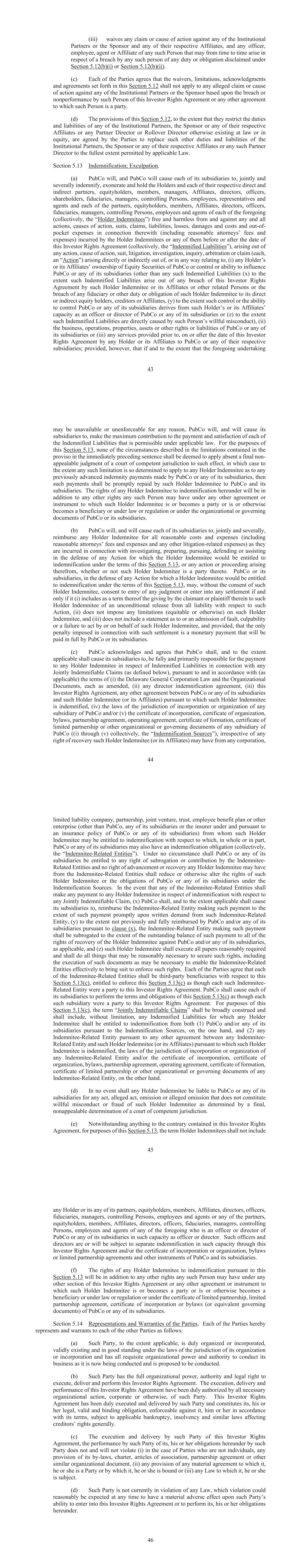 (iii) waives any claim or cause of action against any of the Institutional Partners or the Sponsor and any of their respective Affiliates, and any officer, employee, agent or Affiliate of any such Person that may from time to time arise in respect of a breach by any such person of any duty or obligation disclaimed under or . (c) Each of the Parties agrees that the waivers, limitations, acknowledgments and agreements set forth in this shall not apply to any alleged claim or cause of action against any of the Institutional Partners or the Sponsor based upon the breach or nonperformance by such Person of this Investor Rights Agreement or any other agreement to which such Person is a party. (d) The provisions of this , to the extent that they restrict the duties and liabilities of any of the Institutional Partners, the Sponsor or any of their respective Affiliates or any Partner Director or Rollover Director otherwise existing at law or in equity, are agreed by the Parties to replace such other duties and liabilities of the Institutional Partners, the Sponsor or any of their respective Affiliates or any such Partner Director to the fullest extent permitted by applicable Law. Indemnification; Exculpation. (a) PubCo will, and PubCo will cause each of its subsidiaries to, jointly and severally indemnify, exonerate and hold the Holders and each of their respective direct and indirect partners, equityholders, members, managers, Affiliates, directors, officers, shareholders, fiduciaries, managers, controlling Persons, employees, representatives and agents and each of the partners, equityholders, members, Affiliates, directors, officers, fiduciaries, managers, controlling Persons, employees and agents of each of the foregoing (collectively, the “Holder Indemnitees”) free and harmless from and against any and all actions, causes of action, suits, claims, liabilities, losses, damages and costs and out-of- pocket expenses in connection therewith (including reasonable attorneys’ fees and expenses) incurred by the Holder Indemnitees or any of them before or after the date of this Investor Rights Agreement (collectively, the “Indemnified Liabilities”), arising out of any action, cause of action, suit, litigation, investigation, inquiry, arbitration or claim (each, an “Action”) arising directly or indirectly out of, or in any way relating to, (i) any Holder’s or its Affiliates’ ownership of Equity Securities of PubCo or control or ability to influence PubCo or any of its subsidiaries (other than any such Indemnified Liabilities (x) to the extent such Indemnified Liabilities arise out of any breach of this Investor Rights Agreement by such Holder Indemnitee or its Affiliates or other related Persons or the breach of any fiduciary or other duty or obligation of such Holder Indemnitee to its direct or indirect equity holders, creditors or Affiliates, (y) to the extent such control or the ability to control PubCo or any of its subsidiaries derives from such Holder’s or its Affiliates’ capacity as an officer or director of PubCo or any of its subsidiaries or (z) to the extent such Indemnified Liabilities are directly caused by such Person’s willful misconduct), (ii) the business, operations, properties, assets or other rights or liabilities of PubCo or any of its subsidiaries or (iii) any services provided prior to, on or after the date of this Investor Rights Agreement by any Holder or its Affiliates to PubCo or any of their respective subsidiaries; provided, however, that if and to the extent that the foregoing undertaking 44 may be unavailable or unenforceable for any reason, PubCo will, and will cause its subsidiaries to, make the maximum contribution to the payment and satisfaction of each of the Indemnified Liabilities that is permissible under applicable law. For the purposes of this , none of the circumstances described in the limitations contained in the proviso in the immediately preceding sentence shall be deemed to apply absent a final non- appealable judgment of a court of competent jurisdiction to such effect, in which case to the extent any such limitation is so determined to apply to any Holder Indemnitee as to any previously advanced indemnity payments made by PubCo or any of its subsidiaries, then such payments shall be promptly repaid by such Holder Indemnitee to PubCo and its subsidiaries. The rights of any Holder Indemnitee to indemnification hereunder will be in addition to any other rights any such Person may have under any other agreement or instrument to which such Holder Indemnitee is or becomes a party or is or otherwise becomes a beneficiary or under law or regulation or under the organizational or governing documents of PubCo or its subsidiaries. (b) PubCo will, and will cause each of its subsidiaries to, jointly and severally, reimburse any Holder Indemnitee for all reasonable costs and expenses (including reasonable attorneys’ fees and expenses and any other litigation-related expenses) as they are incurred in connection with investigating, preparing, pursuing, defending or assisting in the defense of any Action for which the Holder Indemnitee would be entitled to indemnification under the terms of this , or any action or proceeding arising therefrom, whether or not such Holder Indemnitee is a party thereto. PubCo or its subsidiaries, in the defense of any Action for which a Holder Indemnitee would be entitled to indemnification under the terms of this , may, without the consent of such Holder Indemnitee, consent to entry of any judgment or enter into any settlement if and only if it (i) includes as a term thereof the giving by the claimant or plaintiff therein to such Holder Indemnitee of an unconditional release from all liability with respect to such Action, (ii) does not impose any limitations (equitable or otherwise) on such Holder Indemnitee, and (iii) does not include a statement as to or an admission of fault, culpability or a failure to act by o