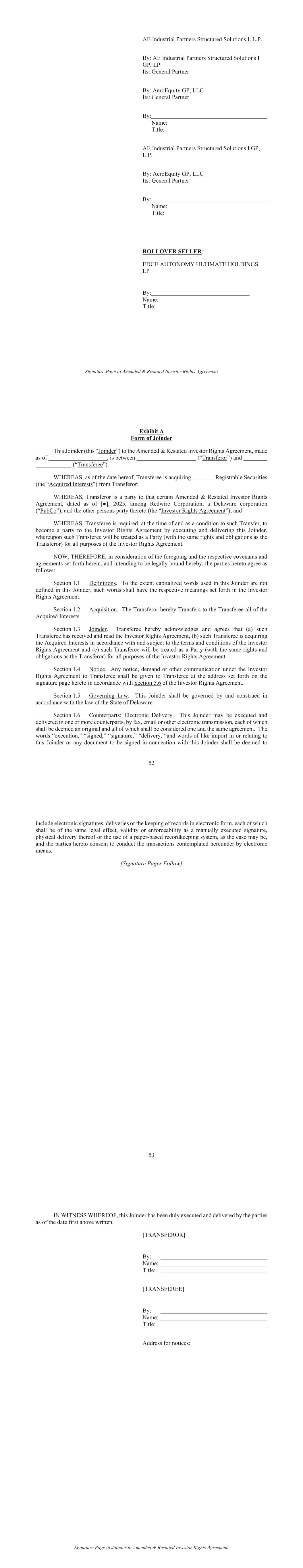 Signature Page to Amended & Restated Investor Rights Agreement AE Industrial Partners Structured Solutions I, L.P. By: AE Industrial Partners Structured Solutions I GP, LP Its: General Partner By: AeroEquity GP, LLC Its: General Partner By: Name: Title: AE Industrial Partners Structured Solutions I GP, L.P. By: AeroEquity GP, LLC Its: General Partner By: Name: Title: ROLLOVER SELLER: EDGE AUTONOMY ULTIMATE HOLDINGS, LP By: Name: Title: Exhibit A Form of Joinder This Joinder (this “Joinder”) to the Amended & Restated Investor Rights Agreement, made as of , is between (“Transferor”) and (“Transferee”). WHEREAS, as of the date hereof, Transferee is acquiring Registrable Securities (the “Acquired Interests”) from Transferor; WHEREAS, Transferor is a party to that certain Amended & Restated Investor Rights (“PubCo”), and the other persons party thereto (the “Investor Rights Agreement”); and WHEREAS, Transferee is required, at the time of and as a condition to such Transfer, to become a party to the Investor Rights Agreement by executing and delivering this Joinder, whereupon such Transferee will be treated as a Party (with the same rights and obligations as the Transferor) for all purposes of the Investor Rights Agreement. NOW, THEREFORE, in consideration of the foregoing and the respective covenants and agreements set forth herein, and intending to be legally bound hereby, the parties hereto agree as follows: Definitions. To the extent capitalized words used in this Joinder are not defined in this Joinder, such words shall have the respective meanings set forth in the Investor Rights Agreement. Acquisition. The Transferor hereby Transfers to the Transferee all of the Acquired Interests. Joinder. Transferee hereby acknowledges and agrees that (a) such Transferee has received and read the Investor Rights Agreement, (b) such Transferee is acquiring the Acquired Interests in accordance with and subject to the terms and conditions of the Investor Rights Agreement and (c) such Transferee will be treated as a Party (with the same rights and obligations as the Transferor) for all purposes of the Investor Rights Agreement. Notice. Any notice, demand or other communication under the Investor Rights Agreement to Transferee shall be given to Transferee at the address set forth on the signature page hereto in accordance with of the Investor Rights Agreement. Governing Law. This Joinder shall be governed by and construed in accordance with the law of the State of Delaware. Counterparts; Electronic Delivery. This Joinder may be executed and delivered in one or more counterparts, by fax, email or other electronic transmission, each of which shall be deemed an original and all of which shall be considered one and the same agreement. The words “execution,” “signed,” “signature,” “delivery,” and words of like import in or relating to this Joinder or any document to be signed in connection with this Joinder shall be deemed to include electronic signatures, deliveries or the keeping of records in electronic form, each of which shall be of the same legal effect, validity or enforceability as a manually executed signature, physical delivery thereof or the use of a paper-based recordkeeping system, as the case may be, and the parties hereto consent to conduct the transactions contemplated hereunder by electronic means. [Signature Pages Follow] Signature Page to Joinder to Amended & Restated Investor Rights Agreement IN WITNESS WHEREOF, this Joinder has been duly executed and delivered by the parties as of the date first above written. By: Name: Title: By: Name: Title: Address for notices: