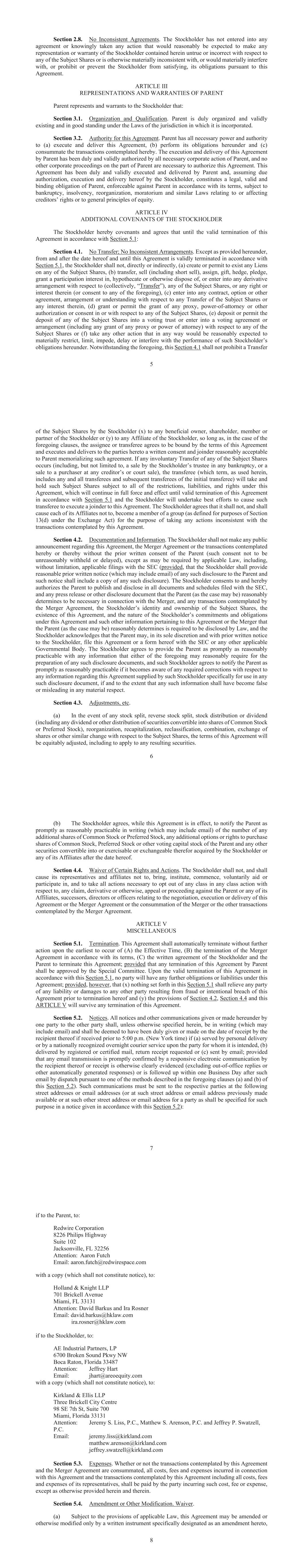 Execution Version Confidential VOTING AND SUPPORT AGREEMENT THIS VOTING AND SUPPORT AGREEMENT (this “Agreement”) is entered into as of January , 2025, by and between Redwire Corporation, a Delaware corporation (“Parent”), and the holders of the Shares (as defined below) identified on the signature pages hereto (collectively, the “Stockholder”). Capitalized terms used but not defined in this Agreement shall have the respective meanings assigned thereto in the Merger Agreement (as defined below). RECITALS WHEREAS, as of the date hereof, Stockholder, directly or indirectly with its Affiliates, is a holder of record and/or the “beneficial owner” (within the meaning of Rule 13d-3 under the Securities Exchange Act of 1934, as amended (the “Exchange Act”)) of shares of common stock, $0.0001 par value per share (the “Common Stock”) and shares of Series A Convertible Preferred Stock, par value $0.0001 per share (the “Preferred Stock”), which shares of Preferred Stock are convertible into shares of Common Stock and vote on as-converted basis with the holders of Common Stock, of the Parent, all as set forth on Schedule A hereto (the “Existing Shares”). WHEREAS, Edge Autonomy Ultimate Holdings, LP, a Delaware limited partnership, (ii) Edge Autonomy Intermediate Holdings, LLC, a Delaware limited liability company (the “Company”), (iii) Parent, (iv) Echelon Merger Sub, Inc., a Delaware corporation and (v) Echelon Purchaser, LLC, a Delaware limited liability company, are entering into an Agreement and Plan of Merger on the date hereof (such agreement, as it may be amended, the “Merger Agreement”), which provides (subject to the conditions set forth therein) for, among other things, the acquisition of the Company through merger transactions set forth in the Merger Agreement (collectively, the “Merger”). WHEREAS, Stockholder is entering into this Agreement in order to induce Parent to enter into the Merger Agreement and to cause the Merger to be consummated. AGREEMENT NOW, THEREFORE, in consideration of the foregoing and the representations, warranties, covenants and agreements set forth herein, as well as other good and valuable consideration, the receipt and sufficiency of which are hereby acknowledged, and intending to be legally bound hereby, Parent and the Stockholder agree as follows: ARTICLE I AGREEMENT TO VOTE Section 1.1. Agreement to Vote. (a) From and after the date of this Agreement until the date that is the earliest of the following to occur: (a) the consummation of the Merger, (b) the termination of the Merger Agreement in accordance with its terms and (c) the written consent of the Stockholder and Parent (such earlier date, the “Expiration Date”), the Stockholder irrevocably and unconditionally agrees, subject to Section 5.1, that at any meeting (whether annual or special and each adjourned, rescheduled or postponed meeting) of the Parent’s stockholders, however called, or in connection 2 with any written consent of the Parent’s stockholders, in each case, upon which a vote, consent or other approval (including a written consent) with respect to the Merger Agreement, the Merger or the Stock Issuance is sought, the Stockholder will (i) appear at such meeting (in person or by proxy) or otherwise cause all of the Stockholder’s Existing Shares and any other shares of Common Stock or Preferred Stock over which it has acquired record or beneficial ownership after the date of this Agreement (including, without limitation, any shares of Common Stock or Preferred Stock acquired by means of purchase, dividend or distribution, or issued upon the exercise of any stock options, warrants, restricted stock units or other rights to acquire Common Stock, Preferred Stock or the conversion of any convertible securities, the vesting of equity awards or otherwise) (collectively, the “New Shares,” and together with the Existing Shares, the “Subject Shares”), which it owns as of the applicable record date, to be counted as present thereat for purposes of determining a quorum, and respond to each request by Parent for written consent, if any, and (ii) unless the Parent shall have publicly announced and not rescinded a Change in Recommendation, vote (including via proxy) or execute consents with respect to (or cause to be voted (including via proxy) or consents to be executed with respect to) all such Subject Shares (A) in favor of the issuance of shares of Common Stock by Parent pursuant to the Merger as partial consideration for the acquisition of the Company pursuant to the Merger, including for purposes of Rule 312.03 of the New York Stock Exchange, (B) in favor of the Equity Financing, if any, (C) any proposal to adjourn or postpone such meeting of the Parent’s stockholders to a later date as may be requested by the Parent, and (D) against any action, proposal, transaction or agreement that would reasonably be expected to prevent, materially impede or materially delay the consummation of the transactions contemplated by the Merger Agreement or the issuance of shares of Common Stock by Parent as partial consideration for the acquisition of the Company pursuant to the Merger or the Equity Financing, if any, including against any action, agreement or transaction that would reasonably be expected to result in (x) a material breach of or failure to perform any representation, warranty, covenant or agreement of the Parent under the Merger Agreement or (y) any of the conditions set forth in Article III of the Merger Agreement not being satisfied. The Stockholder shall retain at all times the right to vote the Stockholder’s Subject Shares in the Stockholder’s sole discretion, and without any other limitation, on any matters other than those set forth in this Section 1.1 that are at any time or from time to time presented for consideration to the Parent’s stockholders generally. The Stockholder shall not be restricted from voting in favor of, again