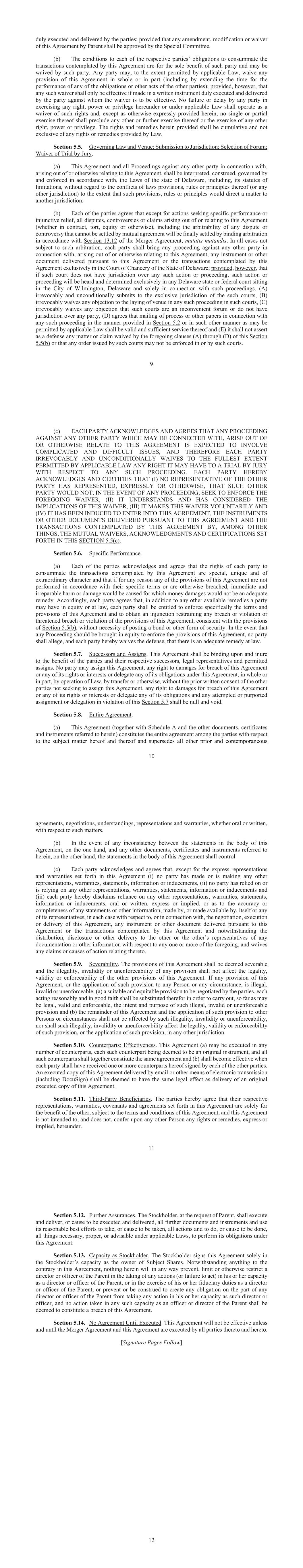 5 Section 2.8. No Inconsistent Agreements. The Stockholder has not entered into any agreement or knowingly taken any action that would reasonably be expected to make any representation or warranty of the Stockholder contained herein untrue or incorrect with respect to any of the Subject Shares or is otherwise materially inconsistent with, or would materially interfere with, or prohibit or prevent the Stockholder from satisfying, its obligations pursuant to this Agreement. ARTICLE III REPRESENTATIONS AND WARRANTIES OF PARENT Parent represents and warrants to the Stockholder that: Section 3.1. Organization and Qualification. Parent is duly organized and validly existing and in good standing under the Laws of the jurisdiction in which it is incorporated. Section 3.2. Authority for this Agreement. Parent has all necessary power and authority to (a) execute and deliver this Agreement, (b) perform its obligations hereunder and (c) consummate the transactions contemplated hereby. The execution and delivery of this Agreement by Parent has been duly and validly authorized by all necessary corporate action of Parent, and no other corporate proceedings on the part of Parent are necessary to authorize this Agreement. This Agreement has been duly and validly executed and delivered by Parent and, assuming due authorization, execution and delivery hereof by the Stockholder, constitutes a legal, valid and binding obligation of Parent, enforceable against Parent in accordance with its terms, subject to bankruptcy, insolvency, reorganization, moratorium and similar Laws relating to or affecting creditors’ rights or to general principles of equity. ARTICLE IV ADDITIONAL COVENANTS OF THE STOCKHOLDER The Stockholder hereby covenants and agrees that until the valid termination of this Agreement in accordance with Section 5.1: Section 4.1. No Transfer; No Inconsistent Arrangements. Except as provided hereunder, from and after the date hereof and until this Agreement is validly terminated in accordance with Section 5.1, the Stockholder shall not, directly or indirectly, (a) create or permit to exist any Liens on any of the Subject Shares, (b) transfer, sell (including short sell), assign, gift, hedge, pledge, grant a participation interest in, hypothecate or otherwise dispose of, or enter into any derivative arrangement with respect to (collectively, “Transfer”), any of the Subject Shares, or any right or interest therein (or consent to any of the foregoing), (c) enter into any contract, option or other agreement, arrangement or understanding with respect to any Transfer of the Subject Shares or any interest therein, (d) grant or permit the grant of any proxy, power-of-attorney or other authorization or consent in or with respect to any of the Subject Shares, (e) deposit or permit the deposit of any of the Subject Shares into a voting trust or enter into a voting agreement or arrangement (including any grant of any proxy or power of attorney) with respect to any of the Subject Shares or (f) take any other action that in any way would be reasonably expected to materially restrict, limit, impede, delay or interfere with the performance of such Stockholder’s obligations hereunder. Notwithstanding the foregoing, this Section 4.1 shall not prohibit a Transfer 6 of the Subject Shares by the Stockholder (x) to any beneficial owner, shareholder, member or partner of the Stockholder or (y) to any Affiliate of the Stockholder, so long as, in the case of the foregoing clauses, the assignee or transferee agrees to be bound by the terms of this Agreement and executes and delivers to the parties hereto a written consent and joinder reasonably acceptable to Parent memorializing such agreement. If any involuntary Transfer of any of the Subject Shares occurs (including, but not limited to, a sale by the Stockholder’s trustee in any bankruptcy, or a sale to a purchaser at any creditor’s or court sale), the transferee (which term, as used herein, includes any and all transferees and subsequent transferees of the initial transferee) will take and hold such Subject Shares subject to all of the restrictions, liabilities, and rights under this Agreement, which will continue in full force and effect until valid termination of this Agreement in accordance with Section 5.1 and the Stockholder will undertake best efforts to cause such transferee to execute a joinder to this Agreement. The Stockholder agrees that it shall not, and shall cause each of its Affiliates not to, become a member of a group (as defined for purposes of Section 13(d) under the Exchange Act) for the purpose of taking any actions inconsistent with the transactions contemplated by this Agreement. Section 4.2. Documentation and Information. The Stockholder shall not make any public announcement regarding this Agreement, the Merger Agreement or the transactions contemplated hereby or thereby without the prior written consent of the Parent (such consent not to be unreasonably withheld or delayed), except as may be required by applicable Law, including, without limitation, applicable filings with the SEC (provided, that the Stockholder shall provide reasonable prior written notice (which may include email) of any such disclosure to the Parent and such notice shall include a copy of any such disclosure). The Stockholder consents to and hereby authorizes the Parent to publish and disclose in all documents and schedules filed with the SEC, and any press release or other disclosure document that the Parent (as the case may be) reasonably determines to be necessary in connection with the Merger, and any transactions contemplated by the Merger Agreement, the Stockholder’s identity and ownership of the Subject Shares, the existence of this Agreement, and the nature of the Stockholder’s commitments and obligations under this Agreement and such other information pertaining to this Agreement or the Merger that the Parent (as the case may be) reasonably determines is