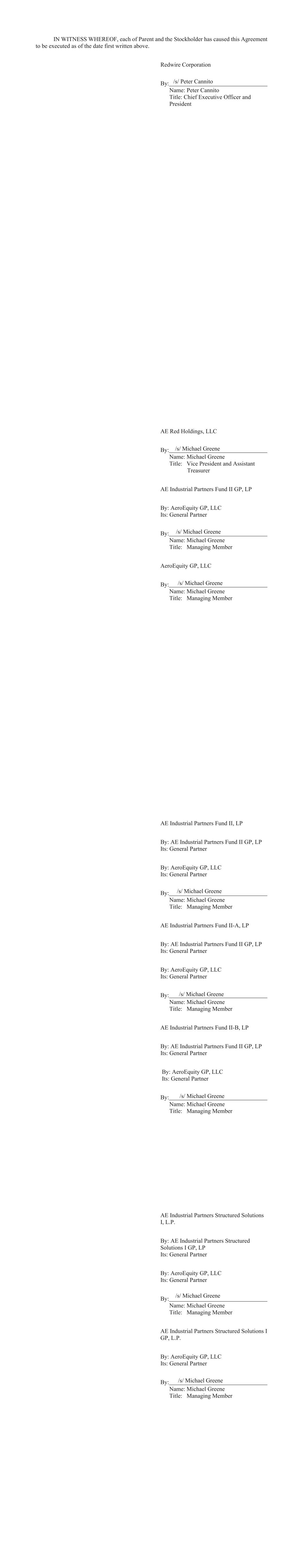 IN WITNESS WHEREOF, each of Parent and the Stockholder has caused this Agreement to be executed as of the date first written above. Redwire Corporation By: Name: Peter Cannito Title: Chief Executive Officer and President AE Red Holdings, LLC By: Name: Michael Greene Title: Vice President and Assistant Treasurer AE Industrial Partners Fund II GP, LP By: AeroEquity GP, LLC Its: General Partner By: Name: Michael Greene Title: Managing Member AeroEquity GP, LLC By: Name: Michael Greene Title: Managing Member AE Industrial Partners Fund II, LP By: AE Industrial Partners Fund II GP, LP Its: General Partner By: AeroEquity GP, LLC Its: General Partner By: Name: Michael Greene Title: Managing Member AE Industrial Partners Fund II-A, LP By: AE Industrial Partners Fund II GP, LP Its: General Partner By: AeroEquity GP, LLC Its: General Partner By: Name: Michael Greene Title: Managing Member AE Industrial Partners Fund II-B, LP By: AE Industrial Partners Fund II GP, LP Its: General Partner By: AeroEquity GP, LLC Its: General Partner By: Name: Michael Greene Title: Managing Member AE Industrial Partners Structured Solutions I, L.P. By: AE Industrial Partners Structured Solutions I GP, LP Its: General Partner By: AeroEquity GP, LLC Its: General Partner By: Name: Michael Greene Title: Managing Member AE Industrial Partners Structured Solutions I GP, L.P. By: AeroEquity GP, LLC Its: General Partner By: Name: Michael Greene Title: Managing Member
