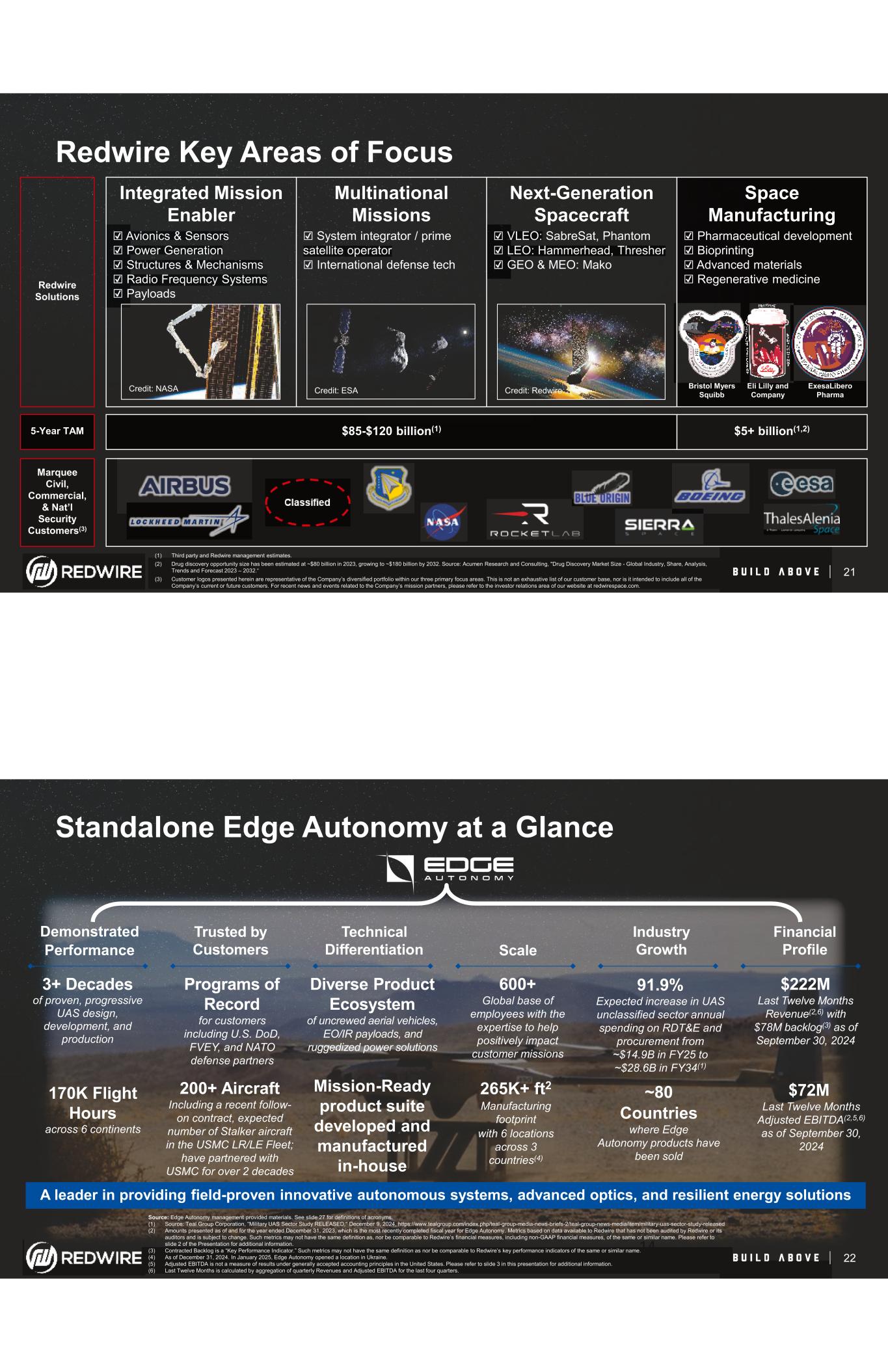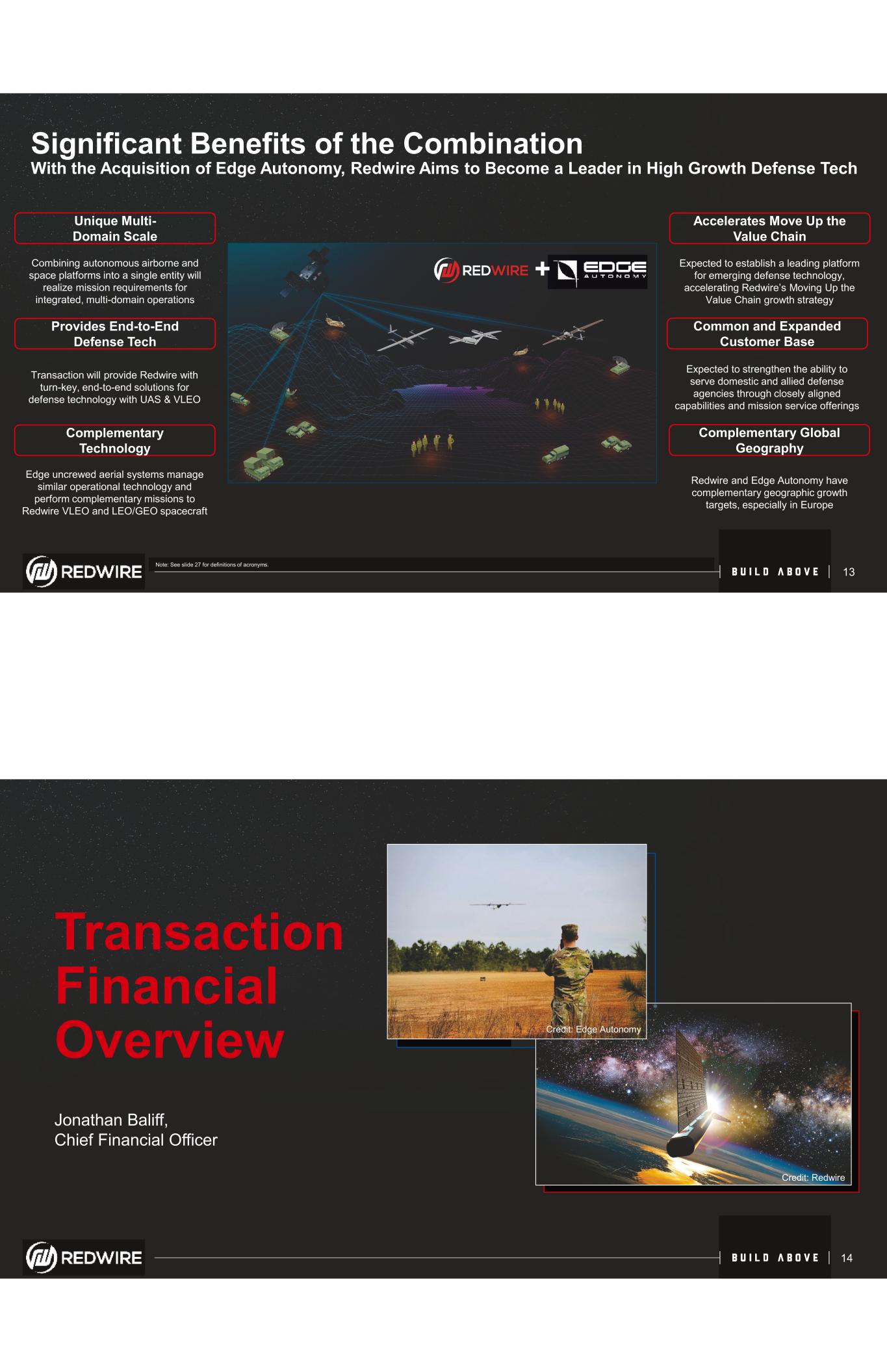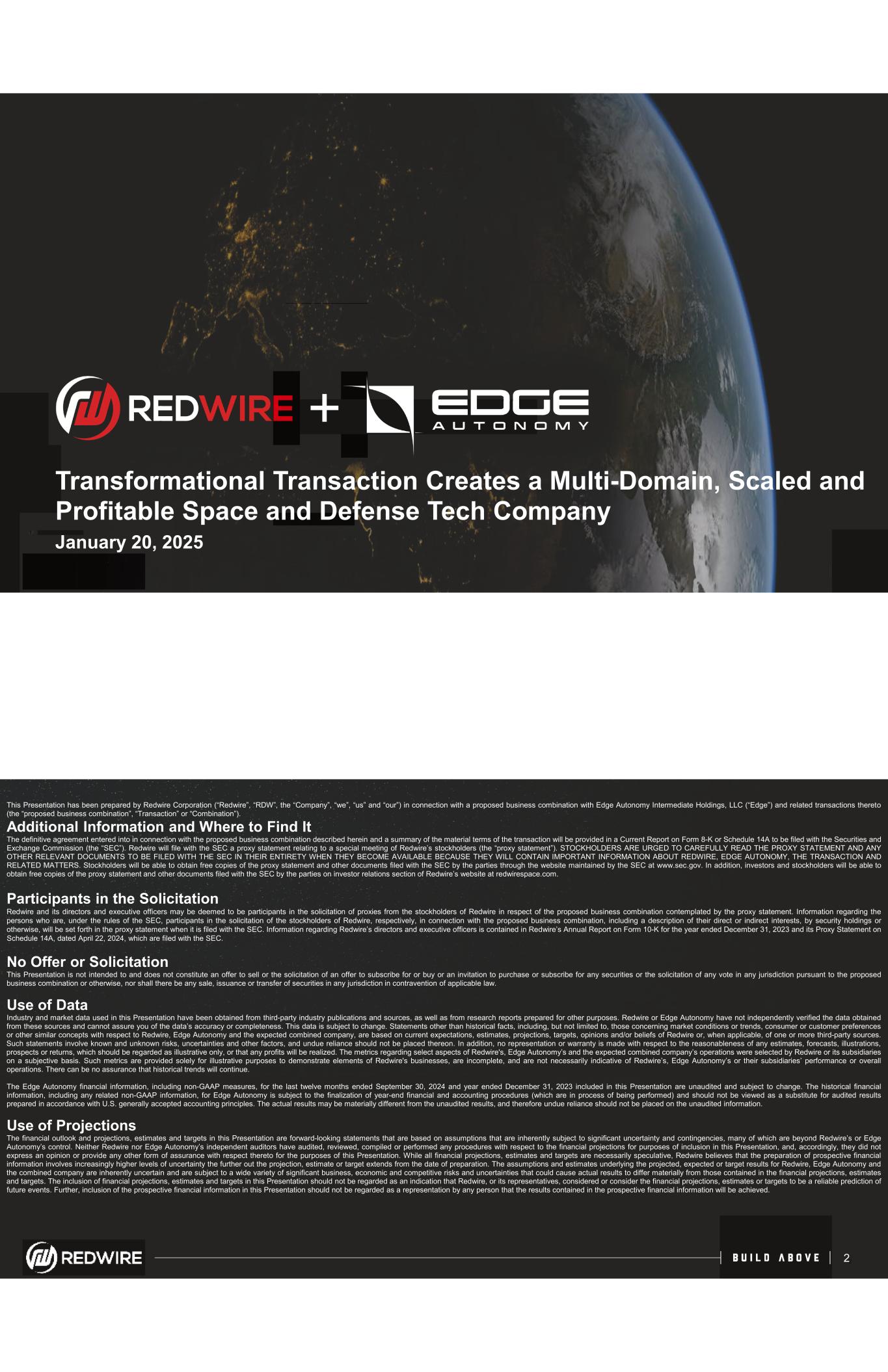 1. Insert Footnote Transformational Transaction Creates a Multi-Domain, Scaled and Profitable Space and Defense Tech Company January 20, 2025 1. Insert Footnote This Presentation has been prepared by Redwire Corporation (“Redwire”, “RDW”, the “Company”, “we”, “us” and “our”) in connection with a proposed business combination with Edge Autonomy Intermediate Holdings, LLC (“Edge”) and related transactions thereto (the “proposed business combination”, “Transaction” or “Combination”). Additional Information and Where to Find It The definitive agreement entered into in connection with the proposed business combination described herein and a summary of the material terms of the transaction will be provided in a Current Report on Form 8-K or Schedule 14A to be filed with the Securities and Exchange Commission (the “SEC”). Redwire will file with the SEC a proxy statement relating to a special meeting of Redwire’s stockholders (the “proxy statement”). STOCKHOLDERS ARE URGED TO CAREFULLY READ THE PROXY STATEMENT AND ANY OTHER RELEVANT DOCUMENTS TO BE FILED WITH THE SEC IN THEIR ENTIRETY WHEN THEY BECOME AVAILABLE BECAUSE THEY WILL CONTAIN IMPORTANT INFORMATION ABOUT REDWIRE, EDGE AUTONOMY, THE TRANSACTION AND RELATED MATTERS. Stockholders will be able to obtain free copies of the proxy statement and other documents filed with the SEC by the parties through the website maintained by the SEC at www.sec.gov. In addition, investors and stockholders will be able to obtain free copies of the proxy statement and other documents filed with the SEC by the parties on investor relations section of Redwire’s website at redwirespace.com. Participants in the Solicitation Redwire and its directors and executive officers may be deemed to be participants in the solicitation of proxies from the stockholders of Redwire in respect of the proposed business combination contemplated by the proxy statement. Information regarding the persons who are, under the rules of the SEC, participants in the solicitation of the stockholders of Redwire, respectively, in connection with the proposed business combination, including a description of their direct or indirect interests, by security holdings or otherwise, will be set forth in the proxy statement when it is filed with the SEC. Information regarding Redwire’s directors and executive officers is contained in Redwire’s Annual Report on Form 10-K for the year ended December 31, 2023 and its Proxy Statement on Schedule 14A, dated April 22, 2024, which are filed with the SEC. No Offer or Solicitation This Presentation is not intended to and does not constitute an offer to sell or the solicitation of an offer to subscribe for or buy or an invitation to purchase or subscribe for any securities or the solicitation of any vote in any jurisdiction pursuant to the proposed business combination or otherwise, nor shall there be any sale, issuance or transfer of securities in any jurisdiction in contravention of applicable law. Use of Data Industry and market data used in this Presentation have been obtained from third-party industry publications and sources, as well as from research reports prepared for other purposes. Redwire or Edge Autonomy have not independently verified the data obtained from these sources and cannot assure you of the data’s accuracy or completeness. This data is subject to change. Statements other than historical facts, including, but not limited to, those concerning market conditions or trends, consumer or customer preferences or other similar concepts with respect to Redwire, Edge Autonomy and the expected combined company, are based on current expectations, estimates, projections, targets, opinions and/or beliefs of Redwire or, when applicable, of one or more third-party sources. Such statements involve known and unknown risks, uncertainties and other factors, and undue reliance should not be placed thereon. In addition, no representation or warranty is made with respect to the reasonableness of any estimates, forecasts, illustrations, prospects or returns, which should be regarded as illustrative only, or that any profits will be realized. The metrics regarding select aspects of Redwire's, Edge Autonomy’s and the expected combined company’s operations were selected by Redwire or its subsidiaries on a subjective basis. Such metrics are provided solely for illustrative purposes to demonstrate elements of Redwire's businesses, are incomplete, and are not necessarily indicative of Redwire’s, Edge Autonomy’s or their subsidiaries’ performance or overall operations. There can be no assurance that historical trends will continue. The Edge Autonomy financial information, including non-GAAP measures, for the last twelve months ended September 30, 2024 and year ended December 31, 2023 included in this Presentation are unaudited and subject to change. The historical financial information, including any related non-GAAP information, for Edge Autonomy is subject to the finalization of year-end financial and accounting procedures (which are in process of being performed) and should not be viewed as a substitute for audited results prepared in accordance with U.S. generally accepted accounting principles. The actual results may be materially different from the unaudited results, and therefore undue reliance should not be placed on the unaudited information. Use of Projections The financial outlook and projections, estimates and targets in this Presentation are forward-looking statements that are based on assumptions that are inherently subject to significant uncertainty and contingencies, many of which are beyond Redwire’s or Edge Autonomy’s control. Neither Redwire nor Edge Autonomy’s independent auditors have audited, reviewed, compiled or performed any procedures with respect to the financial projections for purposes of inclusion in this Presentation, and, accordingly, they did not express an opinion