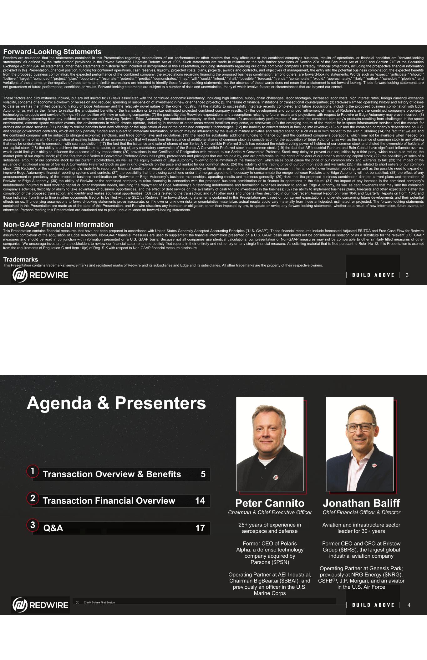 1. Insert Footnote Forward-Looking Statements Readers are cautioned that the statements contained in this Presentation regarding expectations of our performance or other matters that may affect our or the combined company’s business, results of operations, or financial condition are “forward-looking statements” as defined by the “safe harbor” provisions in the Private Securities Litigation Reform Act of 1995. Such statements are made in reliance on the safe harbor provisions of Section 27A of the Securities Act of 1933 and Section 21E of the Securities Exchange Act of 1934. All statements, other than statements of historical fact, included or incorporated in this Presentation, including statements regarding our or the combined company’s strategy, financial projections, including the prospective financial information provided in this Presentation, financial position, funding for continued operations, cash reserves, liquidity, projected costs, plans, projects, awards and contracts, and objectives of management, the entry into the potential business combination, the expected benefits from the proposed business combination, the expected performance of the combined company, the expectations regarding financing the proposed business combination, among others, are forward-looking statements. Words such as “expect,” “anticipate,” “should,” “believe,” “target,” “continued,” “project,” “plan,” “opportunity,” “estimate,” “potential,” “predict,” “demonstrates,” “may,” “will,” “could,” “intend,” “shall,” “possible,” “forecast,” “trends,” “contemplate,” “would,” “approximately,” “likely,” “outlook,” “schedule,” “pipeline,” and variations of these terms or the negative of these terms and similar expressions are intended to identify these forward-looking statements, but the absence of these words does not mean that a statement is not forward looking. These forward-looking statements are not guarantees of future performance, conditions or results. Forward-looking statements are subject to a number of risks and uncertainties, many of which involve factors or circumstances that are beyond our control. These factors and circumstances include, but are not limited to: (1) risks associated with the continued economic uncertainty, including high inflation, supply chain challenges, labor shortages, increased labor costs, high interest rates, foreign currency exchange volatility, concerns of economic slowdown or recession and reduced spending or suspension of investment in new or enhanced projects; (2) the failure of financial institutions or transactional counterparties; (3) Redwire’s limited operating history and history of losses to date as well as the limited operating history of Edge Autonomy and the relatively novel nature of the drone industry; (4) the inability to successfully integrate recently completed and future acquisitions, including the proposed business combination with Edge Autonomy, as well as the failure to realize the anticipated benefits of the transaction or to realize estimated projected combined company results; (5) the development and continued refinement of many of Redwire’s and the combined company’s proprietary technologies, products and service offerings; (6) competition with new or existing companies; (7) the possibility that Redwire’s expectations and assumptions relating to future results and projections with respect to Redwire or Edge Autonomy may prove incorrect; (8) adverse publicity stemming from any incident or perceived risk involving Redwire, Edge Autonomy, the combined company, or their competitors; (9) unsatisfactory performance of our and the combined company’s products resulting from challenges in the space environment, extreme space weather events, the environments in which drones operate, including in combat or other areas where hostilities may occur, or otherwise; (10) the emerging nature of the market for in-space infrastructure services and the market for drones and related services; (11) inability to realize benefits from new offerings or the application of our or the combined company’s technologies; (12) the inability to convert orders in backlog into revenue; (13) our and the combined company’s dependence on U.S. and foreign government contracts, which are only partially funded and subject to immediate termination, or which may be influenced by the level of military activities and related spending such as in or with respect to the war in Ukraine; (14) the fact that we are and the combined company will be subject to stringent economic sanctions, and trade control laws and regulations; (15) the need for substantial additional funding to finance our and the combined company’s operations, which may not be available when needed, on acceptable terms or at all; (16) the dilution of existing holders of our common stock that will result from the issuance of additional shares of common stock as consideration for the acquisition of Edge Autonomy, as well as the issuance of common stock in any offering that may be undertaken in connection with such acquisition; (17) the fact that the issuance and sale of shares of our Series A Convertible Preferred Stock has reduced the relative voting power of holders of our common stock and diluted the ownership of holders of our capital stock; (18) the ability to achieve the conditions to cause, or timing of, any mandatory conversion of the Series A Convertible Preferred stock into common stock; (19) the fact that AE Industrial Partners and Bain Capital have significant influence over us, which could limit your ability to influence the outcome of key transactions; (20) provisions in our Certificate of Designation with respect to our Series A Convertible Preferred Stock may delay or prevent our acquisition by a third party, which could also reduce the market price of our capital stock; (21) the fact th