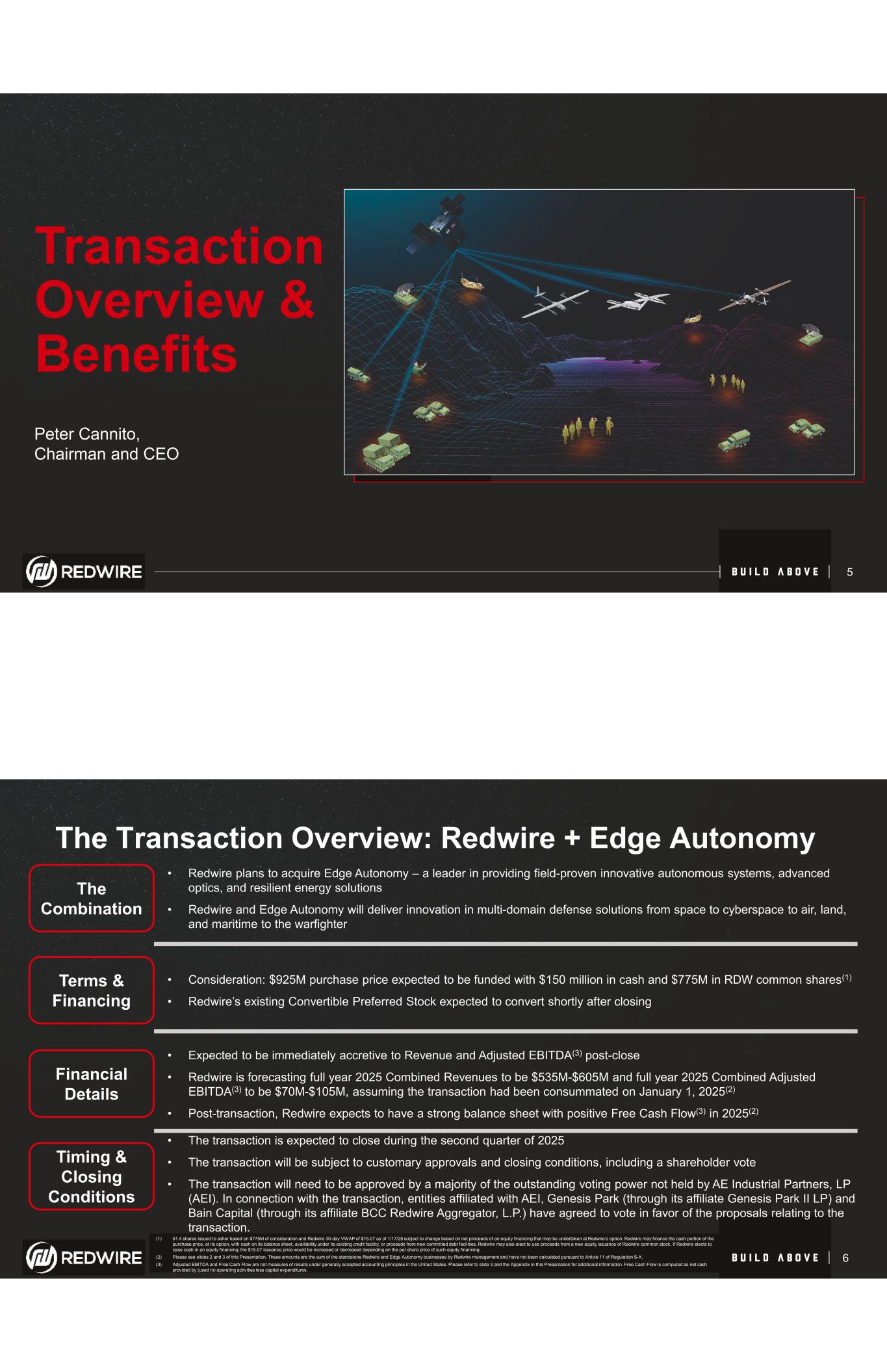 1. Insert Footnote Transaction Overview & Benefits Peter Cannito, Chairman and CEO 5 1. Insert Footnote The Transaction Overview: Redwire + Edge Autonomy 6 (1) 51.4 shares issued to seller based on $775M of consideration and Redwire 30-day VWAP of $15.07 as of 1/17/25 subject to change based on net proceeds of an equity financing that may be undertaken at Redwire’s option. Redwire may finance the cash portion of the purchase price, at its option, with cash on its balance sheet, availability under its existing credit facility, or proceeds from new committed debt facilities. Redwire may also elect to use proceeds from a new equity issuance of Redwire common stock. If Redwire elects to raise cash in an equity financing, the $15.07 issuance price would be increased or decreased depending on the per share price of such equity financing. (2) Please see slides 2 and 3 of this Presentation. These amounts are the sum of the standalone Redwire and Edge Autonomy businesses by Redwire management and have not been calculated pursuant to Article 11 of Regulation S-X. (3) Adjusted EBITDA and Free Cash Flow are not measures of results under generally accepted accounting principles in the United States. Please refer to slide 3 and the Appendix in this Presentation for additional information. Free Cash Flow is computed as net cash provided by (used in) operating activities less capital expenditures. The Combination Terms & Financing Financial Details Timing & Closing Conditions • Redwire plans to acquire Edge Autonomy – a leader in providing field-proven innovative autonomous systems, advanced optics, and resilient energy solutions • Redwire and Edge Autonomy will deliver innovation in multi-domain defense solutions from space to cyberspace to air, land, and maritime to the warfighter • Consideration: $925M purchase price expected to be funded with $150 million in cash and $775M in RDW common shares(1) • Redwire’s existing Convertible Preferred Stock expected to convert shortly after closing • The transaction is expected to close during the second quarter of 2025 • The transaction will be subject to customary approvals and closing conditions, including a shareholder vote • The transaction will need to be approved by a majority of the outstanding voting power not held by AE Industrial Partners, LP (AEI). In connection with the transaction, entities affiliated with AEI, Genesis Park (through its affiliate Genesis Park II LP) and Bain Capital (through its affiliate BCC Redwire Aggregator, L.P.) have agreed to vote in favor of the proposals relating to the transaction. • Expected to be immediately accretive to Revenue and Adjusted EBITDA(3) post-close • Redwire is forecasting full year 2025 Combined Revenues to be $535M-$605M and full year 2025 Combined Adjusted EBITDA(3) to be $70M-$105M, assuming the transaction had been consummated on January 1, 2025(2) • Post-transaction, Redwire expects to have a strong balance sheet with positive Free Cash Flow(3) in 2025(2)
