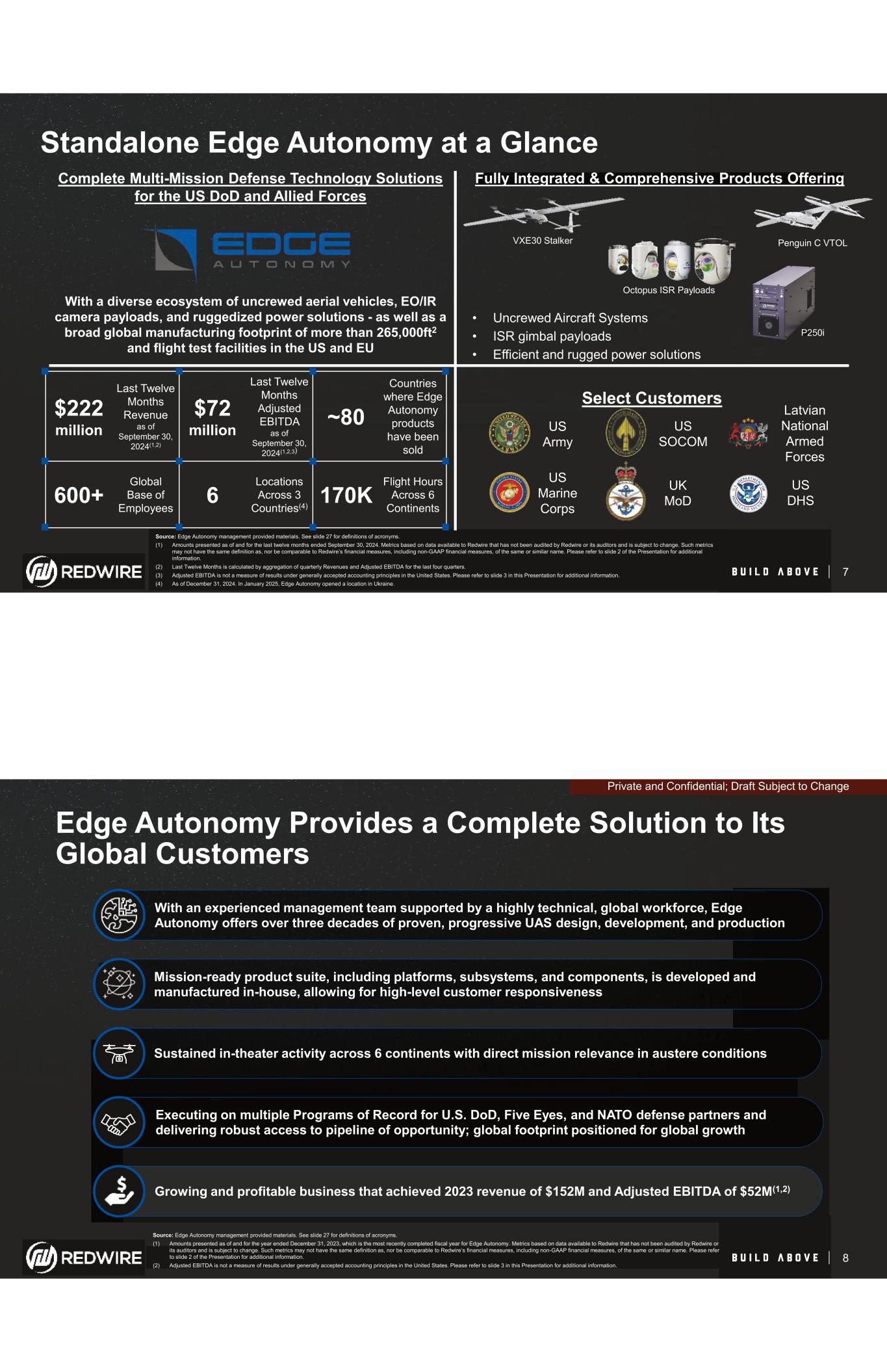 1. Insert Footnote 7 Standalone Edge Autonomy at a Glance Complete Multi-Mission Defense Technology Solutions for the US DoD and Allied Forces With a diverse ecosystem of uncrewed aerial vehicles, EO/IR camera payloads, and ruggedized power solutions - as well as a broad global manufacturing footprint of more than 265,000ft2 and flight test facilities in the US and EU Source: Edge Autonomy management provided materials. See slide 27 for definitions of acronyms. (1) Amounts presented as of and for the last twelve months ended September 30, 2024. Metrics based on data available to Redwire that has not been audited by Redwire or its auditors and is subject to change. Such metrics may not have the same definition as, nor be comparable to Redwire’s financial measures, including non-GAAP financial measures, of the same or similar name. Please refer to slide 2 of the Presentation for additional information. (2) Last Twelve Months is calculated by aggregation of quarterly Revenues and Adjusted EBITDA for the last four quarters. (3) Adjusted EBITDA is not a measure of results under generally accepted accounting principles in the United States. Please refer to slide 3 in this Presentation for additional information. (4) As of December 31, 2024. In January 2025, Edge Autonomy opened a location in Ukraine. $222 million Last Twelve Months Revenue as of September 30, 2024(1,2) $72 million Last Twelve Months Adjusted EBITDA as of September 30, 2024(1,2,3) ~80 Countries where Edge Autonomy products have been sold 600+ Global Base of Employees 6 Locations Across 3 Countries(4) 170K Flight Hours Across 6 Continents Select Customers US Army US Marine Corps US SOCOM Latvian National Armed Forces UK MoD US DHS Fully Integrated & Comprehensive Products Offering • Uncrewed Aircraft Systems • ISR gimbal payloads • Efficient and rugged power solutions VXE30 Stalker Penguin C VTOL Octopus ISR Payloads P250i 1. Insert Footnote Edge Autonomy Provides a Complete Solution to Its Global Customers Mission-ready product suite, including platforms, subsystems, and components, is developed and manufactured in-house, allowing for high-level customer responsiveness Growing and profitable business that achieved 2023 revenue of $152M and Adjusted EBITDA of $52M(1,2) With an experienced management team supported by a highly technical, global workforce, Edge Autonomy offers over three decades of proven, progressive UAS design, development, and production Executing on multiple Programs of Record for U.S. DoD, Five Eyes, and NATO defense partners and delivering robust access to pipeline of opportunity; global footprint positioned for global growth Sustained in-theater activity across 6 continents with direct mission relevance in austere conditions 8 Private and Confidential; Draft Subject to Change Source: Edge Autonomy management provided materials. See slide 27 for definitions of acronyms. (1) Amounts presented as of and for the year ended December 31, 2023, which is the most recently completed fiscal year for Edge Autonomy. Metrics based on data available to Redwire that has not been audited by Redwire or its auditors and is subject to change. Such metrics may not have the same definition as, nor be comparable to Redwire’s financial measures, including non-GAAP financial measures, of the same or similar name. Please refer to slide 2 of the Presentation for additional information. (2) Adjusted EBITDA is not a measure of results under generally accepted accounting principles in the United States. Please refer to slide 3 in this Presentation for additional information.