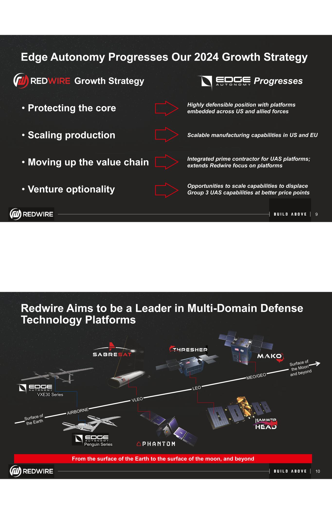 1. Insert Footnote Growth Strategy Progresses • Protecting the core Highly defensible position with platforms embedded across US and allied forces • Scaling production Scalable manufacturing capabilities in US and EU • Moving up the value chain Integrated prime contractor for UAS platforms; extends Redwire focus on platforms • Venture optionality Opportunities to scale capabilities to displace Group 3 UAS capabilities at better price points 9 Edge Autonomy Progresses Our 2024 Growth Strategy 1. Insert Footnote 10 Redwire Aims to be a Leader in Multi-Domain Defense Technology Platforms VXE30 Series Penguin Series From the surface of the Earth to the surface of the moon, and beyond