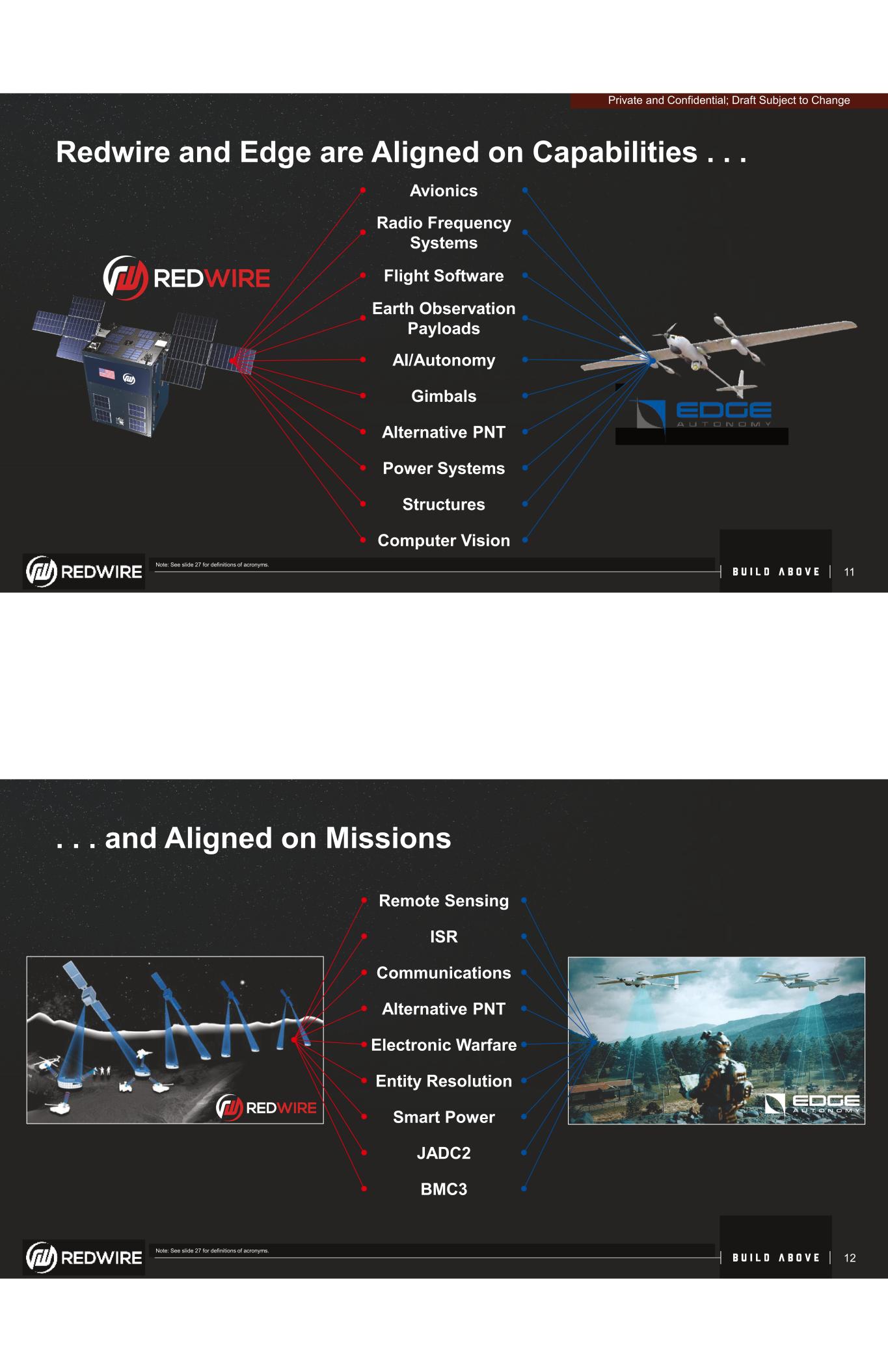 1. Insert Footnote Redwire and Edge are Aligned on Capabilities . . . Avionics Radio Frequency Systems Flight Software Earth Observation Payloads AI/Autonomy Gimbals Alternative PNT Power Systems Structures Computer Vision 11 Note: See slide 27 for definitions of acronyms. Private and Confidential; Draft Subject to Change 1. Insert Footnote . . . and Aligned on Missions 12 Remote Sensing ISR Communications Alternative PNT Electronic Warfare Entity Resolution Smart Power JADC2 BMC3 Note: See slide 27 for definitions of acronyms.