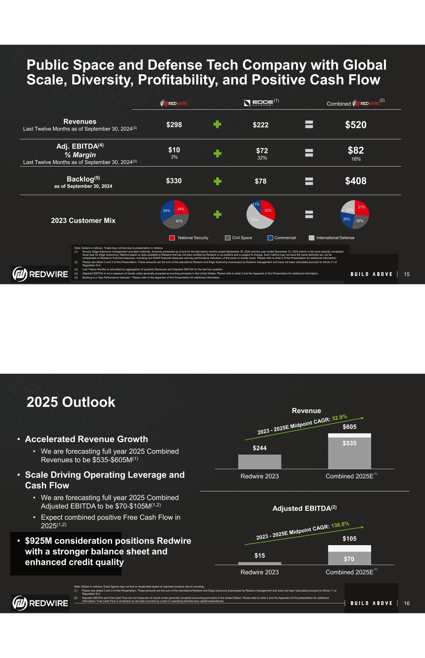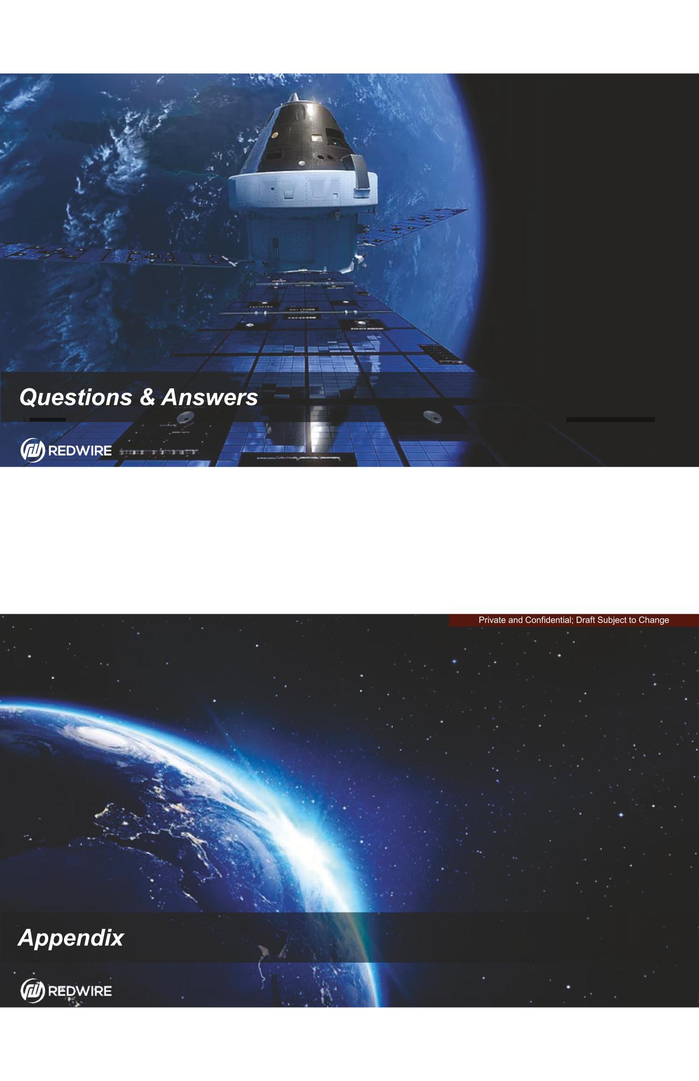 1. Insert Footnote $10 3% Revenues Last Twelve Months as of September 30, 2024(3) $298 $520 Adj. EBITDA(4) % Margin Last Twelve Months as of September 30, 2024(3) $82 16% 2023 Customer Mix 24% 42% 34% 27% 26%25% 22% Backlog(5) as of September 30, 2024 $330 $408 National Security Civil Space Commercial Note: Dollars in millions. Totals may not foot due to presentation in millions. (1) Source: Edge Autonomy management provided materials. Amounts presented as of and for the last twelve months ended September 30, 2024 and the year ended December 31, 2023 (which is the most recently completed fiscal year for Edge Autonomy). Metrics based on data available to Redwire that has not been audited by Redwire or its auditors and is subject to change. Such metrics may not have the same definition as, nor be comparable to Redwire’s financial measures, including non-GAAP financial measures and key performance indicators, of the same or similar name. Please refer to slide 2 of the Presentation for additional information. (2) Please see slides 2 and 3 of this Presentation. These amounts are the sum of the standalone Redwire and Edge Autonomy businesses by Redwire management and have not been calculated pursuant to Article 11 of Regulation S-X. (3) Last Twelve Months is calculated by aggregation of quarterly Revenues and Adjusted EBITDA for the last four quarters. (4) Adjusted EBITDA is not a measure of results under generally accepted accounting principles in the United States. Please refer to slide 3 and the Appendix in this Presentation for additional information. (5) Backlog is a “Key Performance Indicator.” Please refer to the Appendix of this Presentation for additional information. 15 Public Space and Defense Tech Company with Global Scale, Diversity, Profitability, and Positive Cash Flow $222 $72 32% $78 32% 57% 11% (1) (2) Combined International Defense 1. Insert Footnote $535 $244 $605 Redwire 2023 Combined 2025E Revenue 2025 Outlook $70 $15 $105 Redwire 2023 Combined 2025E Adjusted EBITDA(2) Note: Dollars in millions. Exact figures may not foot or recalculate based on reported numbers due to rounding. (1) Please see slides 2 and 3 of this Presentation. These amounts are the sum of the standalone Redwire and Edge Autonomy businesses by Redwire management and have not been calculated pursuant to Article 11 of Regulation S-X. (2) Adjusted EBITDA and Free Cash Flow are not measures of results under generally accepted accounting principles in the United States. Please refer to slide 3 and the Appendix of this presentation for additional information. Free Cash Flow is computed as net cash provided by (used in) operating activities less capital expenditures. 16 • Accelerated Revenue Growth • We are forecasting full year 2025 Combined Revenues to be $535-$605M(1) • Scale Driving Operating Leverage and Cash Flow • We are forecasting full year 2025 Combined Adjusted EBITDA to be $70-$105M(1,2) • Expect combined positive Free Cash Flow in 2025(1,2) • $925M consideration positions Redwire with a stronger balance sheet and enhanced credit quality (1) (1)