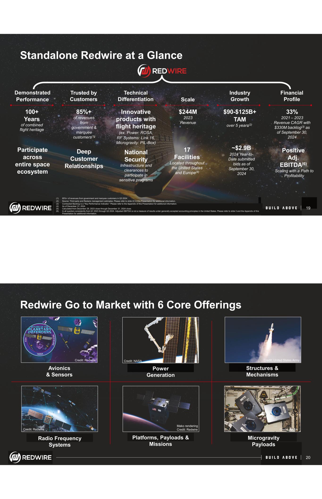 1. Insert Footnote 100+ Years of combined flight heritage Participate across entire space ecosystem 85%+ of revenues from government & marquee customers(1) Deep Customer Relationships Innovative products with flight heritage (ex. Power: ROSA, RF Systems: Link 16, Microgravity: PIL-Box) National Security Infrastructure and clearances to participate in sensitive programs $244M 2023 Revenue 17 Facilities Located throughout the United States and Europe(4) $90-$125B+ TAM over 5 years(2) ~$2.9B 2024 Year-to- Date submitted bids as of September 30, 2024 33% 2021 – 2023 Revenue CAGR with $330M backlog(3) as of September 30, 2024 Positive Adj. EBITDA(6) Scaling with a Path to Profitability Demonstrated Performance Trusted by Customers Technical Differentiation Scale 14 Industry Growth Financial Profile 19 Standalone Redwire at a Glance (1) 85%+ of revenues from government and marquee customers in Q3 2024. (2) Source: Third party and Redwire management estimates. Please refer to slide 22 in this Presentation for additional information. (3) Contracted Backlog is a “Key Performance Indicator.” Please refer to the Appendix of this Presentation for additional information. (4) As of December 31, 2024. (5) Calculated from December 29, 2023 close through December 31, 2024 close. (6) In all quarters consistently from Q1 2023 through Q3 2024. Adjusted EBITDA is not a measure of results under generally accepted accounting principles in the United States. Please refer to slide 3 and the Appendix of this Presentation for additional information. 1. Insert Footnote Mako rendering Credit: Redwire Avionics & Sensors Power Generation Structures & Mechanisms Microgravity Payloads Platforms, Payloads & Missions Radio Frequency Systems Credit: Redwire Credit: NASA Credit: United States Army Credit: Redwire Credit: NASA 20 Redwire Go to Market with 6 Core Offerings