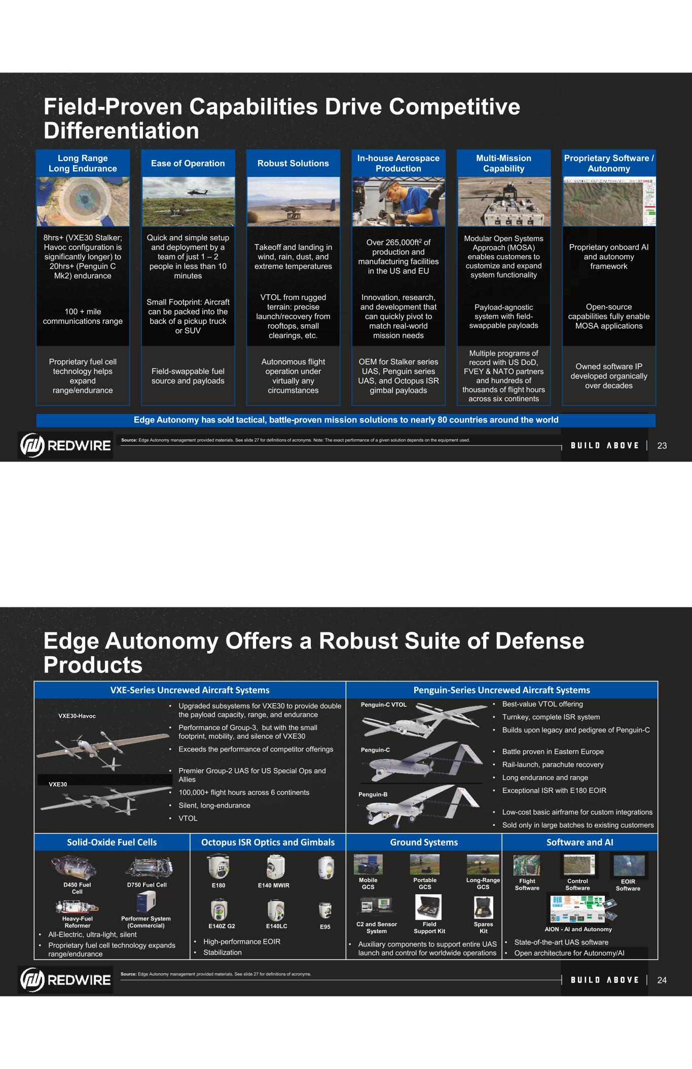 1. Insert Footnote 23 Edge Autonomy has sold tactical, battle-proven mission solutions to nearly 80 countries around the world Source: Edge Autonomy management provided materials. See slide 27 for definitions of acronyms. Note: The exact performance of a given solution depends on the equipment used. Long Range Long Endurance Ease of Operation Robust Solutions In-house Aerospace Production Multi-Mission Capability Proprietary Software / Autonomy 8hrs+ (VXE30 Stalker; Havoc configuration is significantly longer) to 20hrs+ (Penguin C Mk2) endurance Quick and simple setup and deployment by a team of just 1 – 2 people in less than 10 minutes Takeoff and landing in wind, rain, dust, and extreme temperatures Over 265,000ft2 of production and manufacturing facilities in the US and EU Modular Open Systems Approach (MOSA) enables customers to customize and expand system functionality Proprietary onboard AI and autonomy framework 100 + mile communications range Small Footprint: Aircraft can be packed into the back of a pickup truck or SUV VTOL from rugged terrain: precise launch/recovery from rooftops, small clearings, etc. Innovation, research, and development that can quickly pivot to match real-world mission needs Payload-agnostic system with field- swappable payloads Open-source capabilities fully enable MOSA applications Proprietary fuel cell technology helps expand range/endurance Field-swappable fuel source and payloads Autonomous flight operation under virtually any circumstances OEM for Stalker series UAS, Penguin series UAS, and Octopus ISR gimbal payloads Multiple programs of record with US DoD, FVEY & NATO partners and hundreds of thousands of flight hours across six continents Owned software IP developed organically over decades Field-Proven Capabilities Drive Competitive Differentiation 1. Insert Footnote 24 Edge Autonomy Offers a Robust Suite of Defense Products VXE-Series Uncrewed Aircraft Systems Penguin-Series Uncrewed Aircraft Systems Solid-Oxide Fuel Cells Octopus ISR Optics and Gimbals Ground Systems Software and AI VXE30-Havoc VXE30 Penguin-C VTOL Penguin-C Penguin-B • Upgraded subsystems for VXE30 to provide double the payload capacity, range, and endurance • Performance of Group-3, but with the small footprint, mobility, and silence of VXE30 • Exceeds the performance of competitor offerings • Premier Group-2 UAS for US Special Ops and Allies • 100,000+ flight hours across 6 continents • Silent, long-endurance • VTOL • Best-value VTOL offering • Turnkey, complete ISR system • Builds upon legacy and pedigree of Penguin-C • Battle proven in Eastern Europe • Rail-launch, parachute recovery • Long endurance and range • Exceptional ISR with E180 EOIR • Low-cost basic airframe for custom integrations • Sold only in large batches to existing customers D450 Fuel Cell D750 Fuel Cell Heavy-Fuel Reformer Performer System (Commercial) • All-Electric, ultra-light, silent • Proprietary fuel cell technology expands range/endurance E180 E140 MWIR E95E140LCE140Z G2 • High-performance EOIR • Stabilization Field Support Kit Mobile GCS Portable GCS Long-Range GCS C2 and Sensor System Spares Kit • Auxiliary components to support entire UAS launch and control for worldwide operations Flight Software Control Software AION - AI and Autonomy EOIR Software • State-of-the-art UAS software • Open architecture for Autonomy/AI Source: Edge Autonomy management provided materials. See slide 27 for definitions of acronyms.