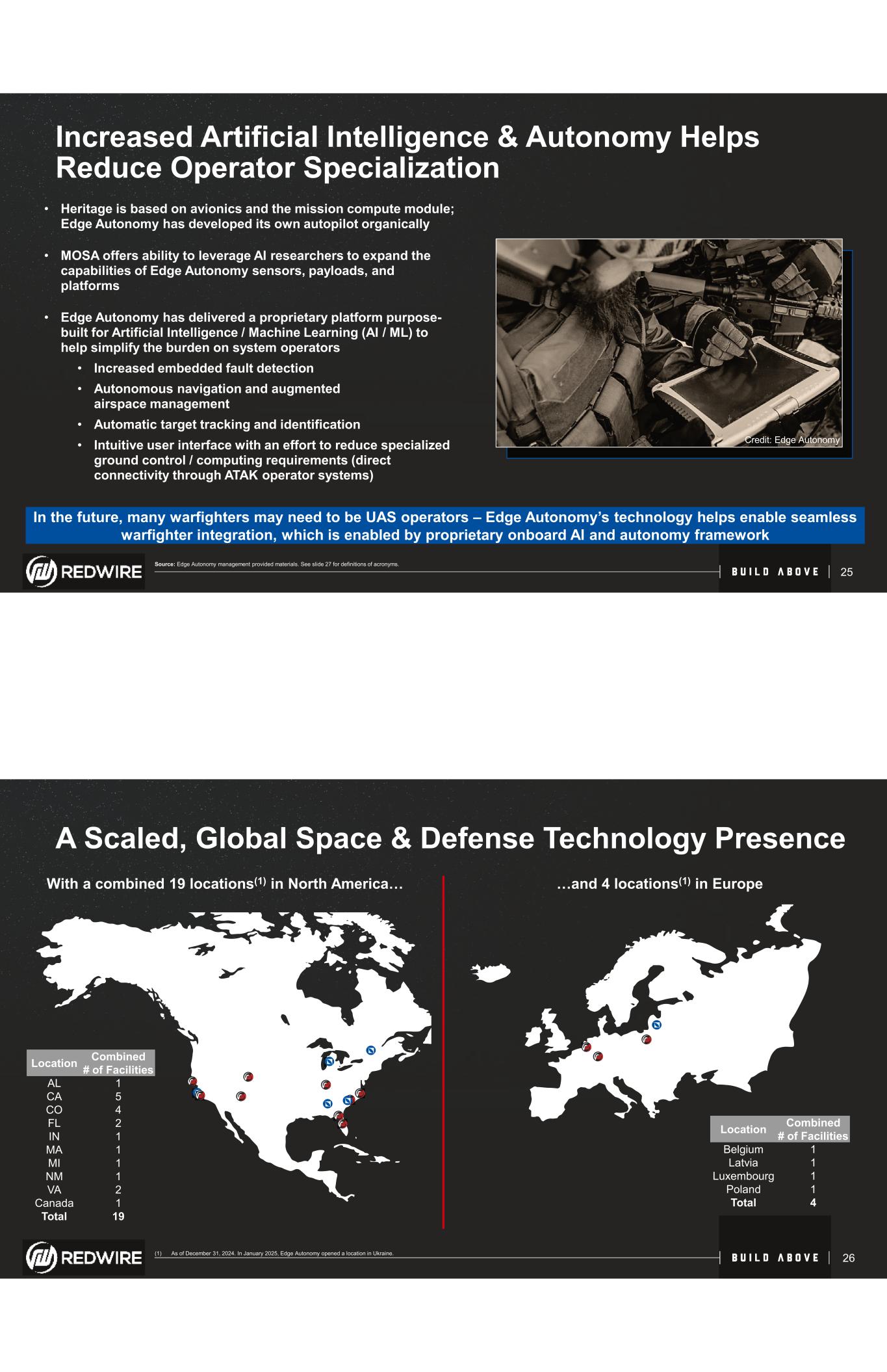 1. Insert Footnote 25 • Heritage is based on avionics and the mission compute module; Edge Autonomy has developed its own autopilot organically • MOSA offers ability to leverage AI researchers to expand the capabilities of Edge Autonomy sensors, payloads, and platforms • Edge Autonomy has delivered a proprietary platform purpose- built for Artificial Intelligence / Machine Learning (AI / ML) to help simplify the burden on system operators • Increased embedded fault detection • Autonomous navigation and augmented airspace management • Automatic target tracking and identification • Intuitive user interface with an effort to reduce specialized ground control / computing requirements (direct connectivity through ATAK operator systems) Increased Artificial Intelligence & Autonomy Helps Reduce Operator Specialization In the future, many warfighters may need to be UAS operators – Edge Autonomy’s technology helps enable seamless warfighter integration, which is enabled by proprietary onboard AI and autonomy framework Credit: Edge Autonomy Source: Edge Autonomy management provided materials. See slide 27 for definitions of acronyms. 1. Insert Footnote 26 A Scaled, Global Space & Defense Technology Presence …and 4 locations(1) in EuropeWith a combined 19 locations(1) in North America… Location Combined # of Facilities AL 1 CA 5 CO 4 FL 2 IN 1 MA 1 MI 1 NM 1 VA 2 Canada 1 Total 19 Location Combined # of Facilities Belgium 1 Latvia 1 Luxembourg 1 Poland 1 Total 4 (1) As of December 31, 2024. In January 2025, Edge Autonomy opened a location in Ukraine.