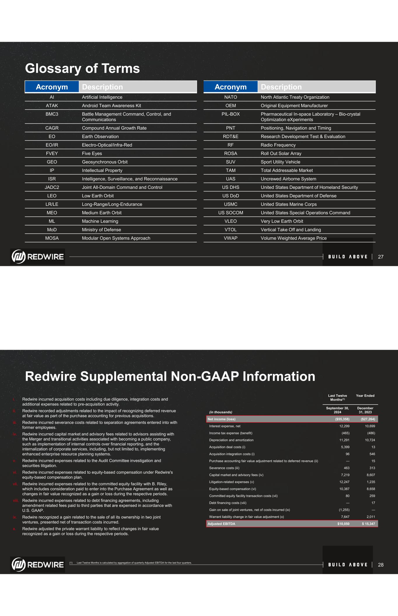 1. Insert Footnote Glossary of Terms Acronym Description Acronym Description AI Artificial Intelligence NATO North Atlantic Treaty Organization ATAK Android Team Awareness Kit OEM Original Equipment Manufacturer BMC3 Battle Management Command, Control, and Communications PIL-BOX Pharmaceutical In-space Laboratory – Bio-crystal Optimization eXperiments CAGR Compound Annual Growth Rate PNT Positioning, Navigation and Timing EO Earth Observation RDT&E Research Development Test & Evaluation EO/IR Electro-Optical/Infra-Red RF Radio Frequency FVEY Five Eyes ROSA Roll Out Solar Array GEO Geosynchronous Orbit SUV Sport Utility Vehicle IP Intellectual Property TAM Total Addressable Market ISR Intelligence, Surveillance, and Reconnaissance UAS Uncrewed Airborne System JADC2 Joint All-Domain Command and Control US DHS United States Department of Homeland Security LEO Low Earth Orbit US DoD United States Department of Defense LR/LE Long-Range/Long-Endurance USMC United States Marine Corps MEO Medium Earth Orbit US SOCOM United States Special Operations Command ML Machine Learning VLEO Very Low Earth Orbit MoD Ministry of Defense VTOL Vertical Take Off and Landing MOSA Modular Open Systems Approach VWAP Volume Weighted Average Price 27 1. Insert Footnote Redwire Supplemental Non-GAAP Information i. Redwire incurred acquisition costs including due diligence, integration costs and additional expenses related to pre-acquisition activity. ii. Redwire recorded adjustments related to the impact of recognizing deferred revenue at fair value as part of the purchase accounting for previous acquisitions. iii. Redwire incurred severance costs related to separation agreements entered into with former employees. iv. Redwire incurred capital market and advisory fees related to advisors assisting with the Merger and transitional activities associated with becoming a public company, such as implementation of internal controls over financial reporting, and the internalization of corporate services, including, but not limited to, implementing enhanced enterprise resource planning systems. v. Redwire incurred expenses related to the Audit Committee investigation and securities litigation. vi. Redwire incurred expenses related to equity-based compensation under Redwire's equity-based compensation plan. vii. Redwire incurred expenses related to the committed equity facility with B. Riley, which includes consideration paid to enter into the Purchase Agreement as well as changes in fair value recognized as a gain or loss during the respective periods. viii. Redwire incurred expenses related to debt financing agreements, including amendment related fees paid to third parties that are expensed in accordance with U.S. GAAP. ix. Redwire recognized a gain related to the sale of all its ownership in two joint ventures, presented net of transaction costs incurred. x. Redwire adjusted the private warrant liability to reflect changes in fair value recognized as a gain or loss during the respective periods. 28(1) Last Twelve Months is calculated by aggregation of quarterly Adjusted EBITDA for the last four quarters. (in thousands) Last Twelve Months(1) Year Ended September 30, 2024 December 31, 2023 Net income (loss) ($55,358) ($27,264) Interest expense, net 12,299 10,699 Income tax expense (benefit) (465) (486) Depreciation and amortization 11,291 10,724 Acquisition deal costs (i) 5,399 13 Acquisition integration costs (i) 96 546 Purchase accounting fair value adjustment related to deferred revenue (ii) — 15 Severance costs (iii) 463 313 Capital market and advisory fees (iv) 7,219 8,607 Litigation-related expenses (v) 12,247 1,235 Equity-based compensation (vi) 10,387 8,658 Committed equity facility transaction costs (vii) 80 259 Debt financing costs (viii) — 17 Gain on sale of joint ventures, net of costs incurred (ix) (1,255) — Warrant liability change in fair value adjustment (x) 7,647 2,011 Adjusted EBITDA $10,050 $ 15,347
