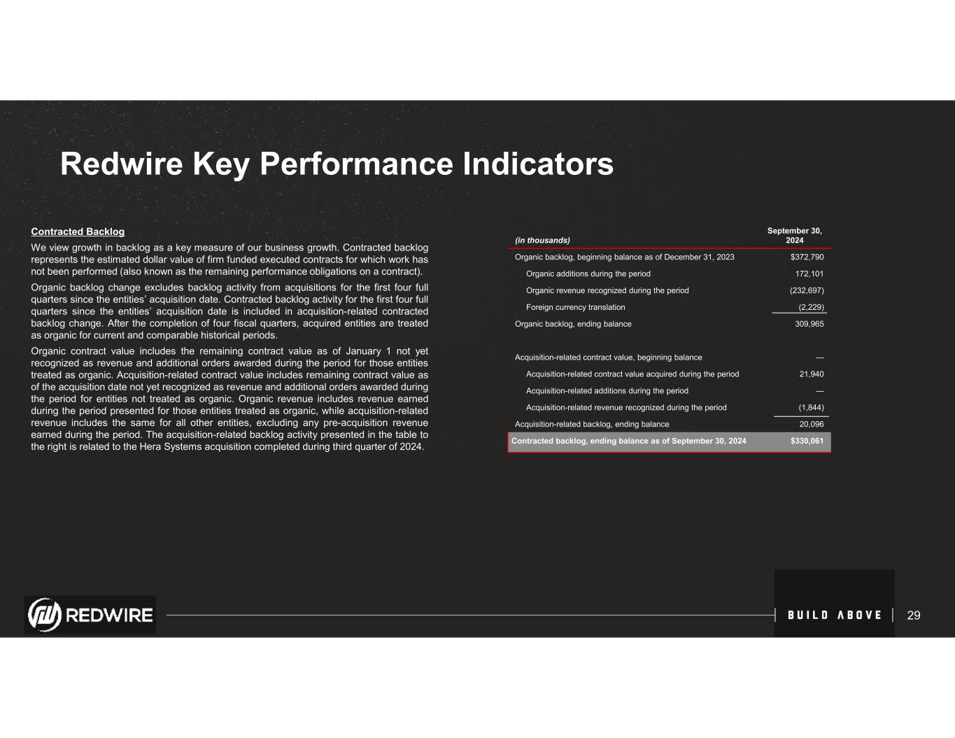 1. Insert Footnote Redwire Key Performance Indicators Contracted Backlog We view growth in backlog as a key measure of our business growth. Contracted backlog represents the estimated dollar value of firm funded executed contracts for which work has not been performed (also known as the remaining performance obligations on a contract). Organic backlog change excludes backlog activity from acquisitions for the first four full quarters since the entities’ acquisition date. Contracted backlog activity for the first four full quarters since the entities’ acquisition date is included in acquisition-related contracted backlog change. After the completion of four fiscal quarters, acquired entities are treated as organic for current and comparable historical periods. Organic contract value includes the remaining contract value as of January 1 not yet recognized as revenue and additional orders awarded during the period for those entities treated as organic. Acquisition-related contract value includes remaining contract value as of the acquisition date not yet recognized as revenue and additional orders awarded during the period for entities not treated as organic. Organic revenue includes revenue earned during the period presented for those entities treated as organic, while acquisition-related revenue includes the same for all other entities, excluding any pre-acquisition revenue earned during the period. The acquisition-related backlog activity presented in the table to the right is related to the Hera Systems acquisition completed during third quarter of 2024. 29 (in thousands) September 30, 2024 Organic backlog, beginning balance as of December 31, 2023 $372,790 Organic additions during the period 172,101 Organic revenue recognized during the period (232,697) Foreign currency translation (2,229) Organic backlog, ending balance 309,965 Acquisition-related contract value, beginning balance — Acquisition-related contract value acquired during the period 21,940 Acquisition-related additions during the period — Acquisition-related revenue recognized during the period (1,844) Acquisition-related backlog, ending balance 20,096 Contracted backlog, ending balance as of September 30, 2024 $330,061