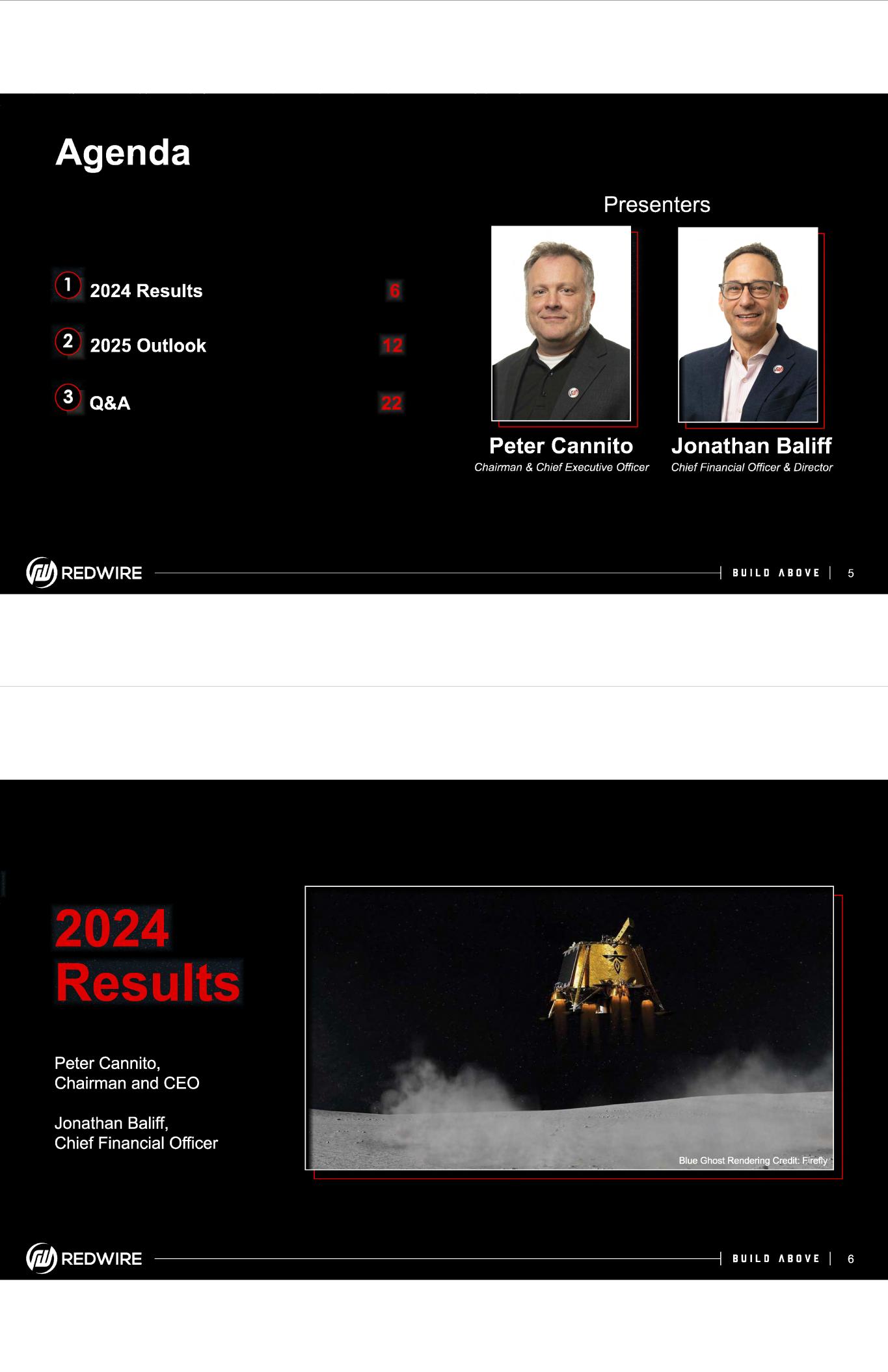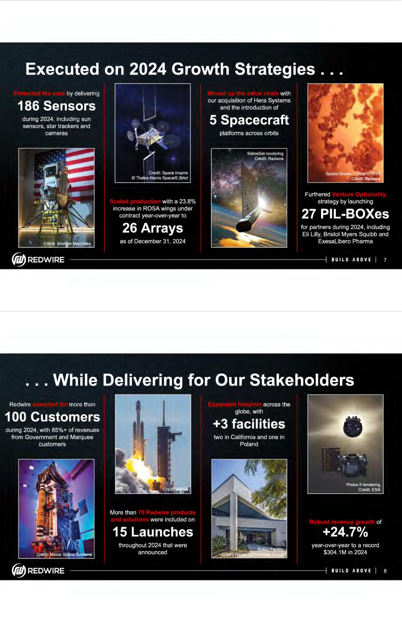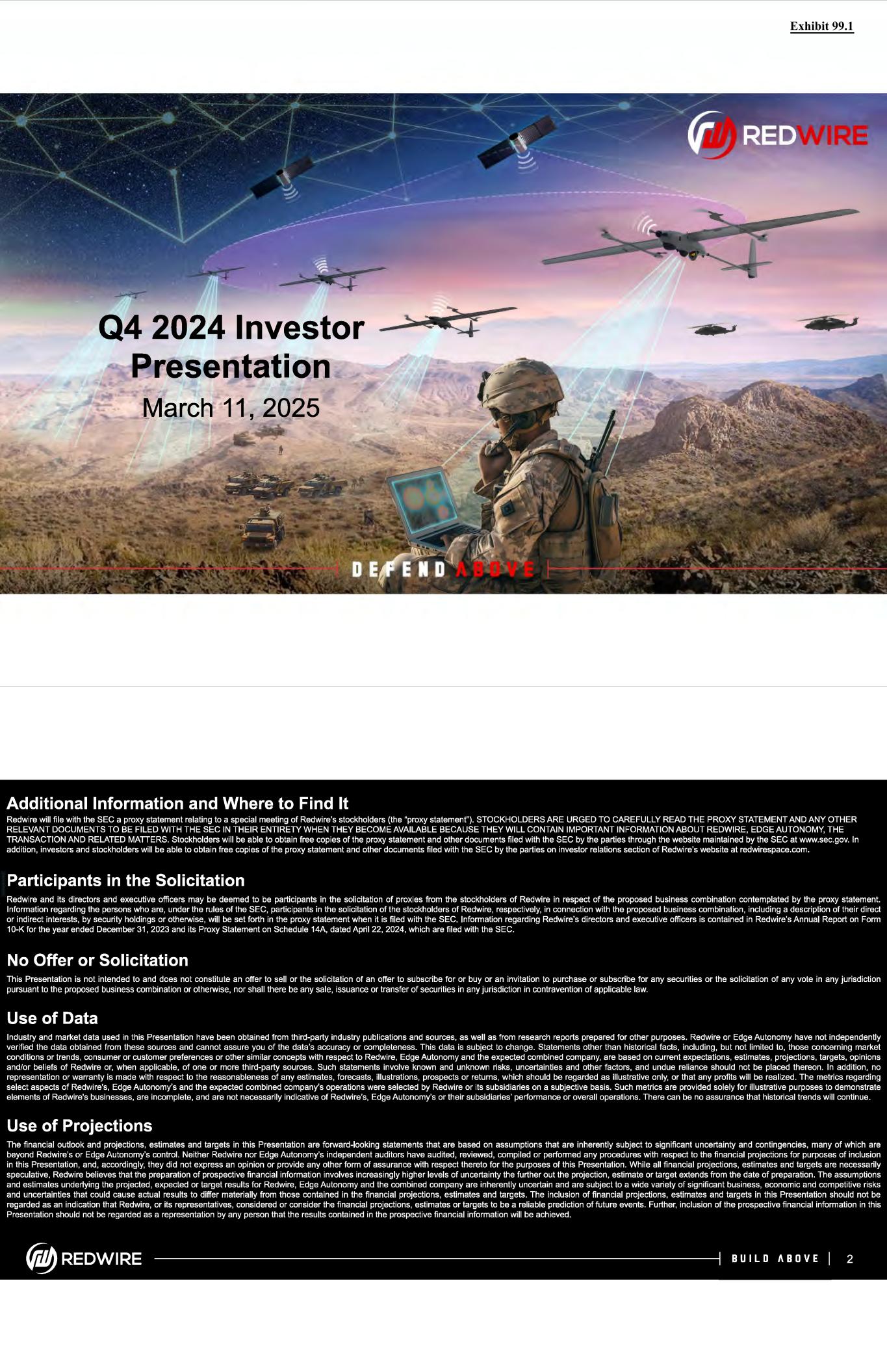 Exhibit 99.1 Q4 2024 Investor Additional Information and Where to Find It Redwire will file with the SEC a proxy statement relating to a special meeting of Redwire's stockholders (the "proxy statement"). STOCKHOLDERS ARE URGED TO CAREFULLY READ THE PROXY STATEMENT AND ANY OTHER RELEVANT DOCUMENTS TO BE FILED WITH THE SEC IN THEIR ENTIRETY WHEN THEY BECOME AVAILABLE BECAUSE THEY WILL CONTAIN IMPORTANT INFORMATION ABOUT REDWIRE, EDGE AUTONOMY, THE TRANSACTION AND RELATED MATTERS. Stockholders will be able to obtain free copies of the proxy statement and other documents filed with the SEC by the parties through the website maintained by the SEC at www.sec.gov. In addition, investors and stockholders will be able to obtain free copies of the proxy statement and other documents filed with the SEC by the parties on investor relations section of Redwire's website at redwirespace.com. Participants in the Solicitation Redwire and its directors and executive officers may be deemed to be participants in the solicitation of proxies from the stockholders of Redwire in respect of the proposed business combination contemplated by the proxy statement. Information regarding the persons who are, under the rules of the SEC, participants in the solicitation of the stockholders of Redwire, respectively, in connection with the proposed business combination, including a description of their direct or indirect interests, by security holdings or otherwise, will be set forth in the proxy statement when it is filed with the SEC. Information regarding Redwire's directors and executive officers is contained in Redwire's Annual Report on Form 10-K for the year ended December 31, 2023 and its Proxy Statement on Schedule 14A, dated April 22, 2024, which are filed with the SEC. No Offer or Solicitation This Presentation is not intended to and does not constitute an offer to sell or the solicitation of an offer to subscribe for or buy or an invitation to purchase or subscribe for any securities or the solicitation of any vote in any jurisdiction pursuant to the proposed business combination or otherwise, nor shall there be any sale, issuance or transfer of securities in any jurisdiction in contravention of applicable law. Use of Data Industry and market data used in this Presentation have been obtained from third-party industry publications and sources, as well as from research reports prepared for other purposes. Redwire or Edge Autonomy have not independently verified the data obtained from these sources and cannot assure you of the data's accuracy or completeness. This data is subject to change. Statements other than historical facts, including, but not limited to, those concerning market conditions or trends, consumer or customer preferences or other similar concepts with respect to Redwire, Edge Autonomy and the expected combined company, are based on current expectations, estimates, projections, targets, opinions and/or beliefs of Redwire or, when applicable, of one or more third-party sources. Such statements involve known and unknown risks, uncertainties and other factors, and undue reliance should not be placed thereon. In addition, no representation or warranty is made with respect to the reasonableness of any estimates, forecasts, illustrations, prospects or returns, which should be regarded as illustrative only, or that any profits will be realized. The metrics regarding select aspects of Redwire's, Edge Autonomy's and the expected combined company's operations were selected by Redwire or its subsidiaries on a subjective basis. Such metrics are provided solely for illustrative purposes to demonstrate elements of Redwire's businesses, are incomplete, and are not necessarily indicative of Redwire's, Edge Autonomy's or their subsidiaries' performance or overall operations. There can be no assurance that historical trends will continue. Use of Projections The financial outlook and projections, estimates and targets in this Presentation are forward-looking statements that are based on assumptions that are inherently subject to significant uncertainty and contingencies, many of which are beyond Redwire's or Edge Autonomy's control. Neither Redwire nor Edge Autonomy's independent auditors have audited, reviewed, compiled or performed any procedures with respect to the financial projections for purposes of inclusion in this Presentation, and, accordingly, they did not express an opinion or provide any other form of assurance with respect thereto for the purposes of this Presentation. While all financial projections, estimates and targets are necessarily speculative, Redwire believes that the preparation of prospective financial information involves increasingly higher levels of uncertainty the further out the projection, estimate or target extends from the date of preparation. The assumptions and estimates underlying the projected, expected or target results for Redwire, Edge Autonomy and the combined company are inherently uncertain and are subject to a wide variety of significant business, economic and competitive risks and uncertainties that could cause actual results to differ materially from those contained in the financial projections, estimates and targets. The inclusion of financial projections, estimates and targets in this Presentation should not be regarded as an indication that Redwire, or its representatives, considered or consider the financial projections, estimates or targets to be a reliable prediction of future events. Further, inclusion of the prospective financial information in this Presentation should not be regarded as a representation by any person that the results contained in the prospective financial information will be achieved. {jiJbREDWIRE BUILD ABOVE 2