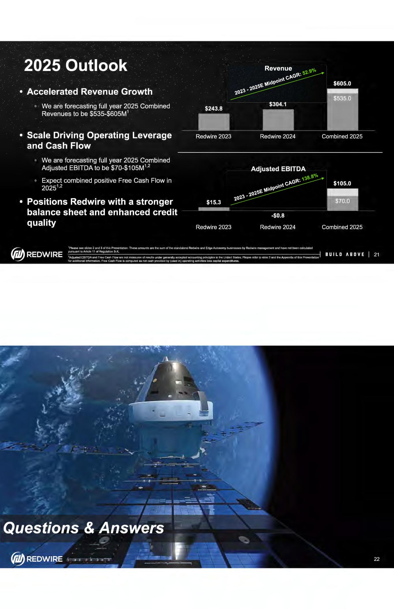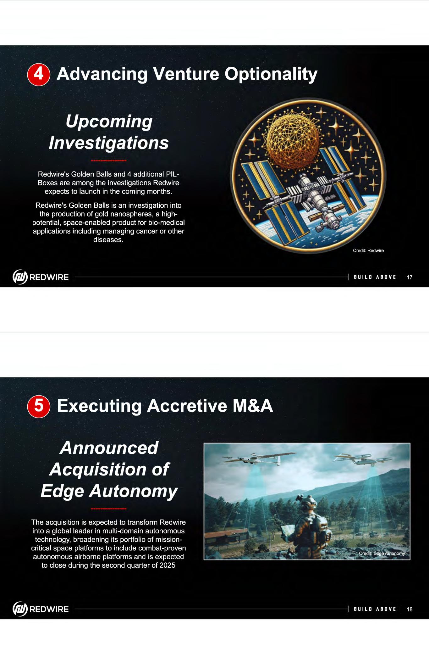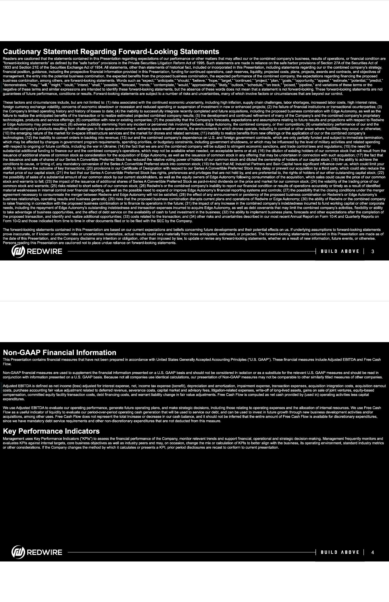 Cautionary Statement Regarding Forward-Looking Statements Readers are cautioned that the statements contained in this Presentation regarding expectations of our performance or other matters that may affect our or the combined company's business, results of operations, or financial condition are "forward-looking statements" as defined by the "safe harbor" provisions in the Private Securities Litigation Reform Act of 1995. Such statements are made in reliance on the safe harbor provisions of Section 27 A of the Securities Act of 1933 and Section 21 E of the Securities Exchange Act of 1934. All statements, other than statements of historical fact, included or incorporated in this Presentation, including statements regarding our or the combined company's strategy, financial position, guidance, including the prospective financial information provided in this Presentation, funding for continued operations, cash reserves, liquidity, projected costs, plans, projects, awards and contracts, and objectives of management, the entry into the potential business combination, the expected benefits from the proposed business combination, the expected performance of the combined company, the expectations regarding financing the proposed business combination, among others, are forward-looking statements. Words such as "expect," "anticipate," "should," "believe," "hope," "target," "continued," "project," "plan," "goals," "opportunity," "appeal," "estimate," "potential," "predict," "demonstrates," "may," "will," "might," "could," "intend," "shall," "possible," "forecast," "trends," "contemplate," "would," "approximately," "likely," "outlook," "schedule," "on track," "poised," "pipeline," and variations of these terms or the negative of these terms and similar expressions are intended to identify these forward-looking statements, but the absence of these words does not mean that a statement is not forward-looking. These forward-looking statements are not guarantees of future performance, conditions or results. Forward-looking statements are subject to a number of risks and uncertainties, many of which involve factors or circumstances that are beyond our control. These factors and circumstances include, but are not limited to: (1) risks associated with the continued economic uncertainty, including high inflation, supply chain challenges, labor shortages, increased labor costs, high interest rates, foreign currency exchange volatility, concerns of economic slowdown or recession and reduced spending or suspension of investment in new or enhanced projects; (2) the failure of financial institutions or transactional counterparties; (3) the Company's limited operating history and history of losses to date; (4) the inability to successfully integrate recently completed and future acquisitions, including the proposed business combination with Edge Autonomy, as well as the failure to realize the anticipated benefits of the transaction or to realize estimated projected combined company results; (5) the development and continued refinement of many of the Company's and the combined company's proprietary technologies, products and service offerings; (6) competition with new or existing companies; (7) the possibility that the Company's forecasts, expectations and assumptions relating to future results and projections with respect to Redwire or Edge Autonomy may prove incorrect; (8) adverse publicity stemming from any incident or perceived risk involving Redwire, Edge Autonomy, the combined company, or their competitors; (9) unsatisfactory performance of our and the combined company's products resulting from challenges in the space environment, extreme space weather events, the environments in which drones operate, including in combat or other areas where hostilities may occur, or otherwise; (10) the emerging nature of the market for in-space infrastructure services and the market for drones and related services; (11) inability to realize benefits from new offerings or the application of our or the combined company's technologies; (12) the inability to convert orders in backlog into revenue; (13) our and the combined company's dependence on U.S. and foreign government contracts, which are only partially funded and subject to immediate termination, which may be affected by changes in government program requirements, spending priorities, or budgetary constraints, including government shutdowns, or which may be influenced by the level of military activities and related spending with respect to ongoing or future conflicts, including the war in Ukraine; (14) the fact that we are and the combined company will be subject to stringent economic sanctions, and trade control laws and regulations; (15) the need for substantial additional funding to finance our and the combined company's operations, which may not be available when needed, on acceptable terms or at all; (16) the dilution of existing holders of our common stock that will result from the issuance of additional shares of common stock as consideration for the acquisition of Edge Autonomy, as well as the issuance of common stock in any offering that may be undertaken in connection with such acquisition; (17) the fact that the issuance and sale of shares of our Series A Convertible Preferred Stock has reduced the relative voting power of holders of our common stock and diluted the ownership of holders of our capital stock; (18) the ability to achieve the conditions to cause, or timing of, any mandatory conversion of the Series A Convertible Preferred stock into common stock; (19) the fact that AE Industrial Partners and Bain Capital have significant influence over us, which could limit your ability to influence the outcome of key transactions; (20) provisions in our Certificate of Designation with respect to our Series A Convertible Preferred Stock may delay or prevent our acquisition by a third party, which could also reduce the market price of our capital stock; (21) the fact