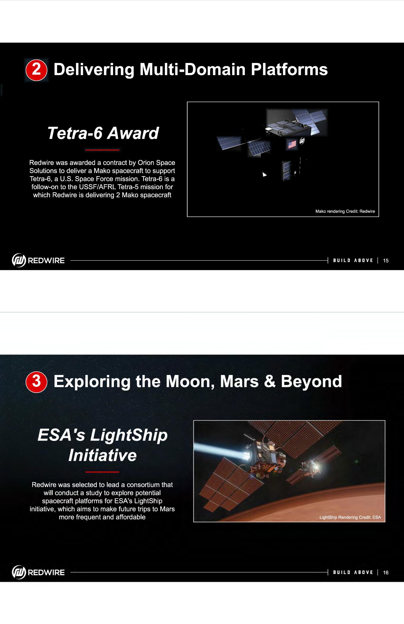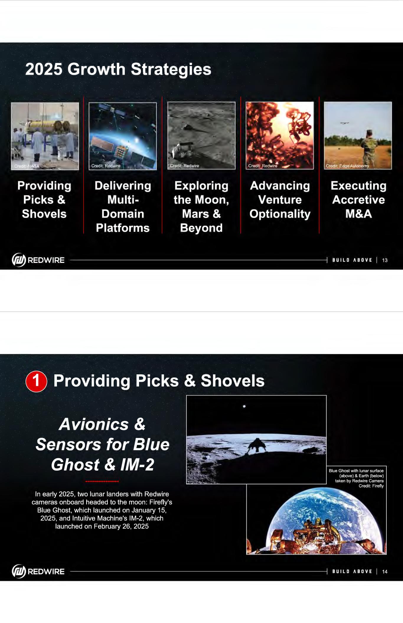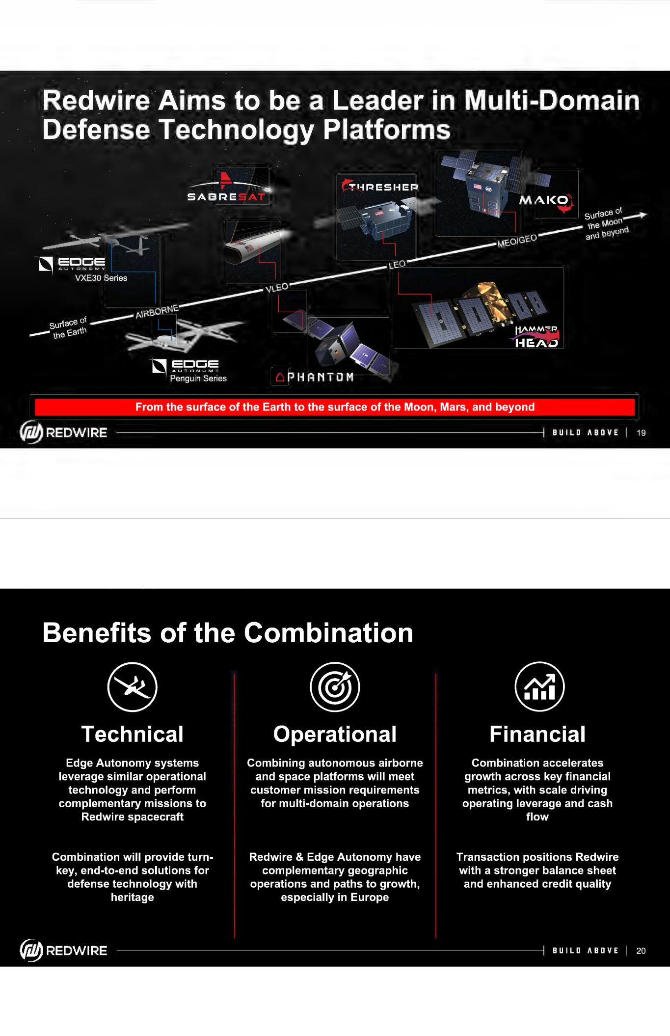 Cautionary Statement Regarding Forward-Looking Statements Readers are cautioned that the statements contained in this Presentation regarding expectations of our performance or other matters that may affect our or the combined company's business, results of operations, or financial condition are "forward-looking statements" as defined by the "safe harbor" provisions in the Private Securities Litigation Reform Act of 1995. Such statements are made in reliance on the safe harbor provisions of Section 27 A of the Securities Act of 1933 and Section 21 E of the Securities Exchange Act of 1934. All statements, other than statements of historical fact, included or incorporated in this Presentation, including statements regarding our or the combined company's strategy, financial position, guidance, including the prospective financial information provided in this Presentation, funding for continued operations, cash reserves, liquidity, projected costs, plans, projects, awards and contracts, and objectives of management, the entry into the potential business combination, the expected benefits from the proposed business combination, the expected performance of the combined company, the expectations regarding financing the proposed business combination, among others, are forward-looking statements. Words such as "expect," "anticipate," "should," "believe," "hope," "target," "continued," "project," "plan," "goals," "opportunity," "appeal," "estimate," "potential," "predict," "demonstrates," "may," "will," "might," "could," "intend," "shall," "possible," "forecast," "trends," "contemplate," "would," "approximately," "likely," "outlook," "schedule," "on track," "poised," "pipeline," and variations of these terms or the negative of these terms and similar expressions are intended to identify these forward-looking statements, but the absence of these words does not mean that a statement is not forward-looking. These forward-looking statements are not guarantees of future performance, conditions or results. Forward-looking statements are subject to a number of risks and uncertainties, many of which involve factors or circumstances that are beyond our control. These factors and circumstances include, but are not limited to: (1) risks associated with the continued economic uncertainty, including high inflation, supply chain challenges, labor shortages, increased labor costs, high interest rates, foreign currency exchange volatility, concerns of economic slowdown or recession and reduced spending or suspension of investment in new or enhanced projects; (2) the failure of financial institutions or transactional counterparties; (3) the Company's limited operating history and history of losses to date; (4) the inability to successfully integrate recently completed and future acquisitions, including the proposed business combination with Edge Autonomy, as well as the failure to realize the anticipated benefits of the transaction or to realize estimated projected combined company results; (5) the development and continued refinement of many of the Company's and the combined company's proprietary technologies, products and service offerings; (6) competition with new or existing companies; (7) the possibility that the Company's forecasts, expectations and assumptions relating to future results and projections with respect to Redwire or Edge Autonomy may prove incorrect; (8) adverse publicity stemming from any incident or perceived risk involving Redwire, Edge Autonomy, the combined company, or their competitors; (9) unsatisfactory performance of our and the combined company's products resulting from challenges in the space environment, extreme space weather events, the environments in which drones operate, including in combat or other areas where hostilities may occur, or otherwise; (10) the emerging nature of the market for in-space infrastructure services and the market for drones and related services; (11) inability to realize benefits from new offerings or the application of our or the combined company's technologies; (12) the inability to convert orders in backlog into revenue; (13) our and the combined company's dependence on U.S. and foreign government contracts, which are only partially funded and subject to immediate termination, which may be affected by changes in government program requirements, spending priorities, or budgetary constraints, including government shutdowns, or which may be influenced by the level of military activities and related spending with respect to ongoing or future conflicts, including the war in Ukraine; (14) the fact that we are and the combined company will be subject to stringent economic sanctions, and trade control laws and regulations; (15) the need for substantial additional funding to finance our and the combined company's operations, which may not be available when needed, on acceptable terms or at all; (16) the dilution of existing holders of our common stock that will result from the issuance of additional shares of common stock as consideration for the acquisition of Edge Autonomy, as well as the issuance of common stock in any offering that may be undertaken in connection with such acquisition; (17) the fact that the issuance and sale of shares of our Series A Convertible Preferred Stock has reduced the relative voting power of holders of our common stock and diluted the ownership of holders of our capital stock; (18) the ability to achieve the conditions to cause, or timing of, any mandatory conversion of the Series A Convertible Preferred stock into common stock; (19) the fact that AE Industrial Partners and Bain Capital have significant influence over us, which could limit your ability to influence the outcome of key transactions; (20) provisions in our Certificate of Designation with respect to our Series A Convertible Preferred Stock may delay or prevent our acquisition by a third party, which could also reduce the market price of our capital stock; (21) the fact