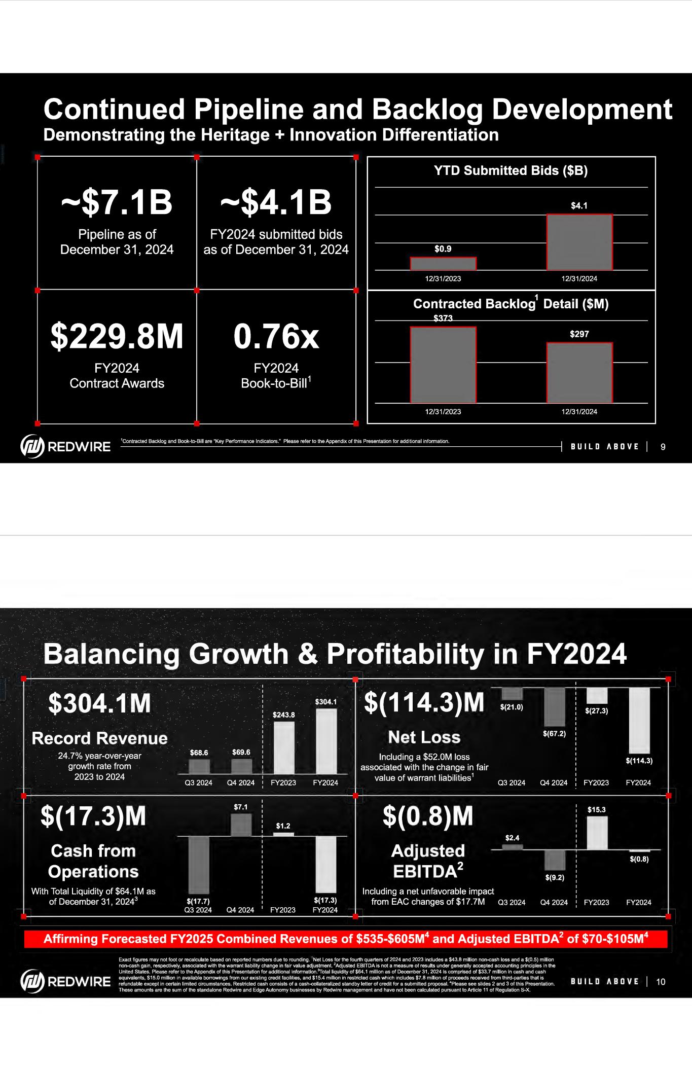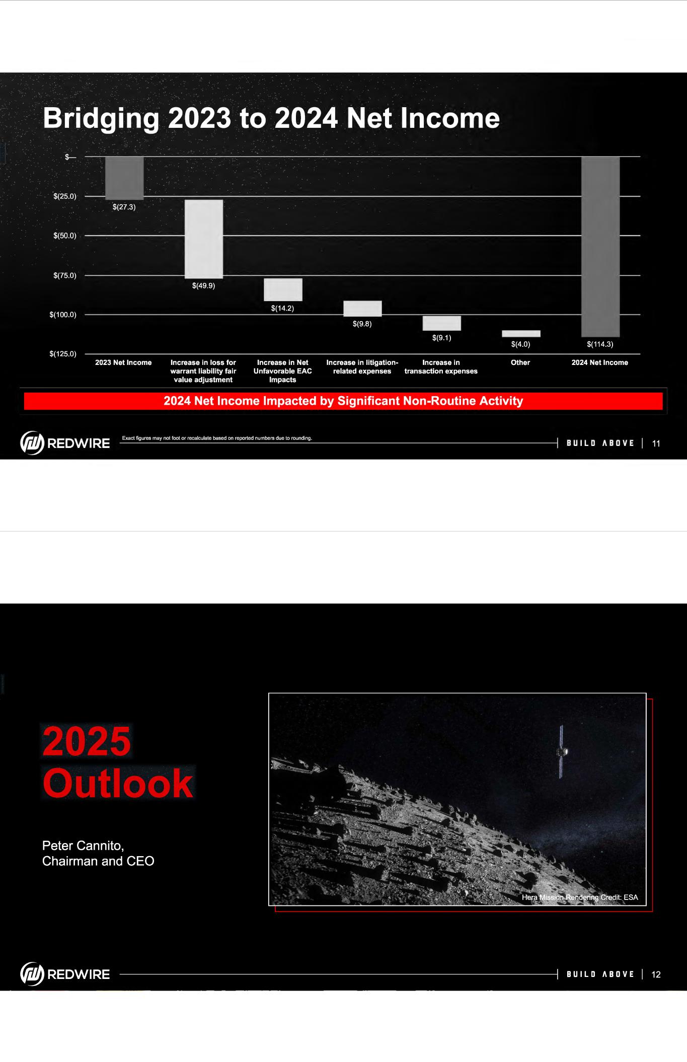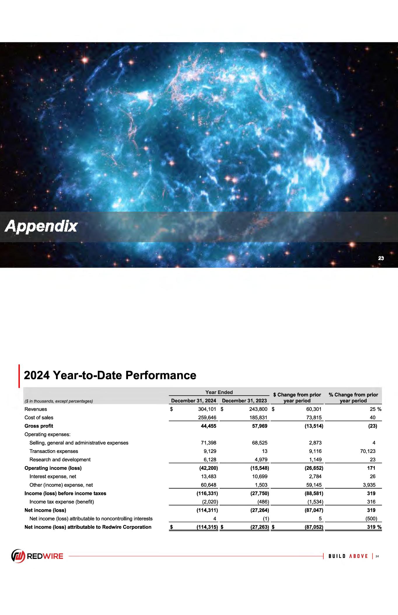 2024 Year-to-Date Performance Year Ended $ Change from prior ($ in thousands, except percentages) Revenues December 31, 2024 December 31, 2023 year period Cost of sales Gross profit Operating expenses: Selling, general and administrative expenses Transaction expenses Research and development Operating income (loss) Interest expense, net Other (income) expense, net Income (loss) before income taxes Income tax expense (benefit) Net income (loss) Net income (loss) attributable to noncontrolling interests Net income (loss) attributable to Redwire Corporation ~ REDWIRE $ $ 304,101 $ 259,646 44,455 71,398 9,129 6,128 (42,200) 13,483 60,648 (116,331) (2,020) (114,311) 4 {114,315} $ 243,800 $ 60,301 185,831 73,815 57,969 (13,514) 68,525 2,873 13 9,116 4,979 1,149 (15,548) (26,652) 10,699 2,784 1,503 59,145 (27,750) (88,581) (486) (1,534) (27,264) (87,047) (1) 5 {27,263} $ {87,052} % Change from prior year period 25 % 40 (23) 4 70,123 23 171 26 3,935 319 316 319 (500) 319 % BUILD ABOVE I 24