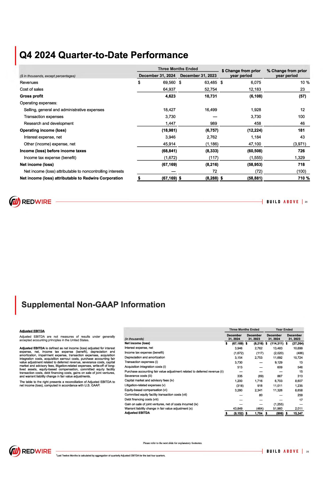 Q4 2024 Quarter-to-Date Performance Three Months Ended $ Change from prior ($ in thousands, except percentages) Revenues December 31, 2024 December 31, 2023 year period Cost of sales Gross profit Operating expenses: Selling, general and administrative expenses Transaction expenses Research and development Operating income (loss) Interest expense, net Other (income) expense, net Income (loss) before income taxes Income tax expense (benefit) Net income (loss) Net income (loss) attributable to noncontrolling interests Net income (loss) attributable to Redwire Corporation ~ REDWIRE $ 69,560 $ 64,937 4,623 18,427 3,730 1,447 (18,981) 3,946 45,914 (68,841) (1,672) (67,169) $ (67,169} $ 63,485 $ 6,075 52,754 12,183 10,731 (6,108) 16,499 1,928 3,730 989 458 (6,757) (12,224) 2,762 1,184 (1,186) 47,100 (8,333) (60,508) (117) (1,555) (8,216) (58,953) 72 (72) (8,288} $ (58,881} % Change from prior year period 10 % 23 (57) 12 100 46 181 43 (3,971) 726 1,329 718 (100) 710 % BUILD ABOVE I 2s Supplemental Non-GAAP Information Adjusted EBITDA Adjusted EBITDA are not measures of results under generally accepted accounting principles in the United States. Adjusted EBITDA is defined as net income (loss) adjusted for interest expense, net, income tax expense (benefit), depreciation and amortization, impairment expense, transaction expenses, acquisition integration costs, acquisition earnout costs, purchase accounting fair value adjustment related to deferred revenue, severance costs, capital market and advisory fees, litigation-related expenses, write-off of long­ lived assets, equity-based compensation, committed equity facility transaction costs, debt financing costs, gains on sale of joint ventures, and warrant liability change in fair value adjustments. The table to the right presents a reconciliation of Adjusted EBITDA to net income (loss), computed in accordance with U.S. GAAP. (in thousands) Net income (loss) Interest expense, net Income tax expense (benefit) Depreciation and amortization Transaction expenses (i) Acquisition integration costs (i) Purchase accounting fair value adjustment related to deferred revenue (ii) Severance costs (iii) Capital market and advisory fees (iv) Litigation-related expenses (v) Equity-based compensation (vi) Committed equity facility transaction costs (vii) Debt financing costs (viii) Gain on sale of joint ventures, net of costs incurred (ix) Warrant liability change in fair value adjustment (x) Adjusted EBITDA Please refer to the next slide for explanatory footnotes. ~ REDWIRE 1Last Twelve Months is calculated by aggregation of quarterly Adjusted EBITDA for the last four quarters. Three Months Ended Year Ended December December December December 31,2024 31,2023 31,2024 31,2023 $ (67,169) $ (8,216) $ (114,311) $ (27,264) 3,946 2,762 13,483 10,699 (1,672) (117) (2,020) (486) 3,154 2,753 11,692 10,724 3,730 9,129 13 513 609 546 15 335 (69) 867 313 1,200 1,716 6,703 8,607 (318) 918 11,011 1,235 3,280 2,341 11,326 8,658 80 259 17 (1,255) 43,849 (464) 51,960 2,011 $ {9,152} $ 1,704 $ {806} $ 15,347 8 U I L O A 8 0 V E I 26