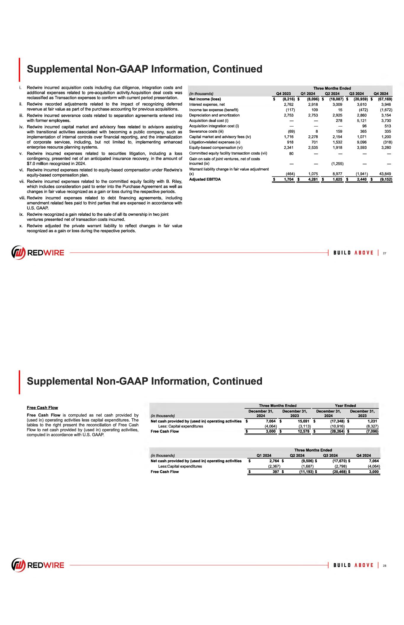 Supplemental Non-GAAP Information, Continued i. Redwire incurred acquisition costs including due diligence, integration costs and additional expenses related to pre-acquisition activity.Acquisition deal costs was reclassified as Transaction expenses to conform with current period presentation. ii. Redwire recorded adjustments related to the impact of recognizing deferred revenue at fair value as part of the purchase accounting for previous acquisitions. iii. Redwire incurred severance costs related to separation agreements entered into with former employees. iv. Redwire incurred capital market and advisory fees related to advisors assisting with transitional activities associated with becoming a public company, such as implementation of internal controls over financial reporting, and the internalization of corporate services, including, but not limited to, implementing enhanced enterprise resource planning systems. v. Redwire incurred expenses related to securities litigation, including a loss contingency, presented net of an anticipated insurance recovery, in the amount of $7 .0 million recognized in 2024. vi. Redwire incurred expenses related to equity-based compensation under Redwire's equity-based compensation plan. vii. Redwire incurred expenses related to the committed equity facility with B. Riley, which includes consideration paid to enter into the Purchase Agreement as well as changes in fair value recognized as a gain or loss during the respective periods. viii. Redwire incurred expenses related to debt financing agreements, including amendment related fees paid to third parties that are expensed in accordance with U.S.GMP. ix. Redwire recognized a gain related to the sale of all its ownership in two joint ventures presented net of transaction costs incurred. x. Redwire adjusted the private warrant liability to reflect changes in fair value recognized as a gain or loss during the respective periods. ~ REDWIRE (in thousands) Net income (loss) Interest expense, net Income tax expense (benefit) Depreciation and amortization Acquisition deal cost (i) Acquisition integration cost (i) Severance costs (iii) Capital market and advisory fees (iv) Litigation-related expenses (v) Equity-based compensation (vi) Committed equity facility transaction costs (vii) Gain on sale of joint ventures, net of costs incurred (ix) Warrant liability change in fair value adjustment (x) Adjusted EBITDA Q4 2023 $ (8,216) $ 2,762 (117) 2,753 (69) 1,716 918 2,341 80 (464) $ 1,704 $ Three Months Ended Q1 2024 Q2 2024 Q3 2024 Q4 2024 (8,096) $ (18,087) $ (20,959) $ (67,169) 2,918 3,009 3,610 3,946 109 15 (472) (1,672) 2,753 2,925 2,860 3,154 278 5,121 3,730 96 513 8 159 365 335 2,278 2,154 1,071 1,200 701 1,532 9,096 (318) 2,535 1,918 3,593 3,280 (1,255) 1,075 8,977 (1,941) 43,849 4,281 $ 1,625 $ 2,440 $ (9,152} B U I L D A B D V E I 27 Supplemental Non-GAAP Information, Continued Free Cash Flow Free Cash Flow is computed as net cash provided by (used in) operating activities less capital expenditures. The tables to the right present the reconciliation of Free Cash Flow to net cash provided by (used in) operating activities, computed in accordance with U.S. GAAP. ~ REDWIRE (in thousands) Net cash provided by (used in) operating activities Less: Capital expenditures Free Cash Flow (in thousands) Net cash provided by (used in) operating activities Less:Capital expenditures Free Cash Flow $ $ Three Months Ended Year Ended December 31, December 31, December 31, December 31, 2024 7,064 $ (4,064) 3,000 $ Q1 2024 $ 2,764 $ (2,367) $ 397 $ 2023 2024 15,691 $ (17,348) $ (3,113) (10,916) 12,578 $ (28,264) $ Three Months Ended Q2 2024 Q3 2024 (9,506) $ (17,670) $ (1,687) (2,798) (11,193) $ (20,468) $ 2023 1,231 (8,327) (7,096) Q42024 7,064 (4,064) 3,000 BUILD ABOVE I 28