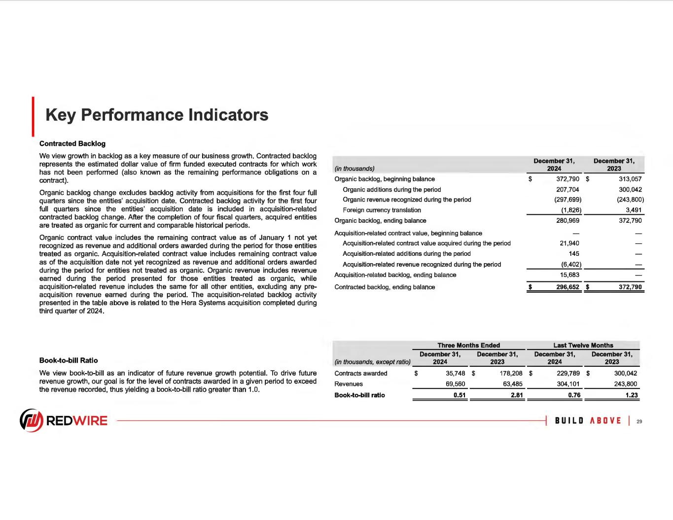 Key Performance Indicators Contracted Backlog We view growth in backlog as a key measure of our business growth. Contracted backlog represents the estimated dollar value of firm funded executed contracts for which work has not been performed (also known as the remaining performance obligations on a contract). Organic backlog change excludes backlog activity from acquisitions for the first four full quarters since the entities' acquisition date. Contracted backlog activity for the first four full quarters since the entities' acquisition date is included in acquisition-related contracted backlog change. After the completion of four fiscal quarters, acquired entities are treated as organic for current and comparable historical periods. Organic contract value includes the remaining contract value as of January 1 not yet recognized as revenue and additional orders awarded during the period for those entities treated as organic. Acquisition-related contract value includes remaining contract value as of the acquisition date not yet recognized as revenue and additional orders awarded during the period for entities not treated as organic. Organic revenue includes revenue earned during the period presented for those entities treated as organic, while acquisition-related revenue includes the same for all other entities, excluding any pre­ acquisition revenue earned during the period. The acquisition-related backlog activity presented in the table above is related to the Hera Systems acquisition completed during third quarter of 2024. Book-to-bill Ratio We view book-to-bill as an indicator of future revenue growth potential. To drive future revenue growth, our goal is for the level of contracts awarded in a given period to exceed the revenue recorded, thus yielding a book-to-bill ratio greater than 1.0. vf!!J REDWIRE (in thousands) Organic backlog, beginning balance Organic additions during the period Organic revenue recognized during the period Foreign currency translation Organic backlog, ending balance Acquisition-related contract value, beginning balance Acquisition-related contract value acquired during the period Acquisition-related additions during the period Acquisition-related revenue recognized during the period Acquisition-related backlog, ending balance Contracted backlog, ending balance Three Months Ended December 31, December 31, (in thousands, except ratio) 2024 2023 Contracts awarded $ 35,748 $ 178,208 Revenues 69,560 63,485 Book-to-bill ratio 0.51 2.81 December 31, December 31, 2024 2023 $ 372,790 $ 313,057 207,704 300,042 (297,699) (243,800) (1,826) 3,491 280,969 372,790 21,940 145 (6,402) 15,683 $ 296,652 $ 372,790 Last Twelve Months December 31, December 31, 2024 2023 $ 229,789 $ 300,042 304,101 243,800 0.76 1.23 BUILD ABOVE I 29